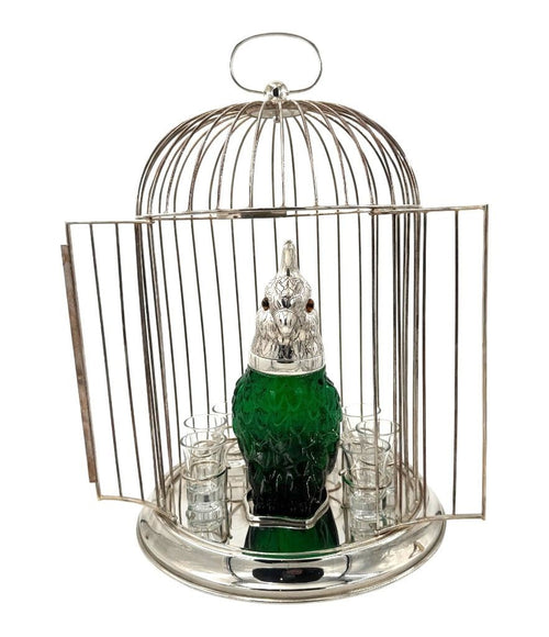 A wonderful Victorian style green glass, cockatoo decanter in silver plated cage with 8 glasses