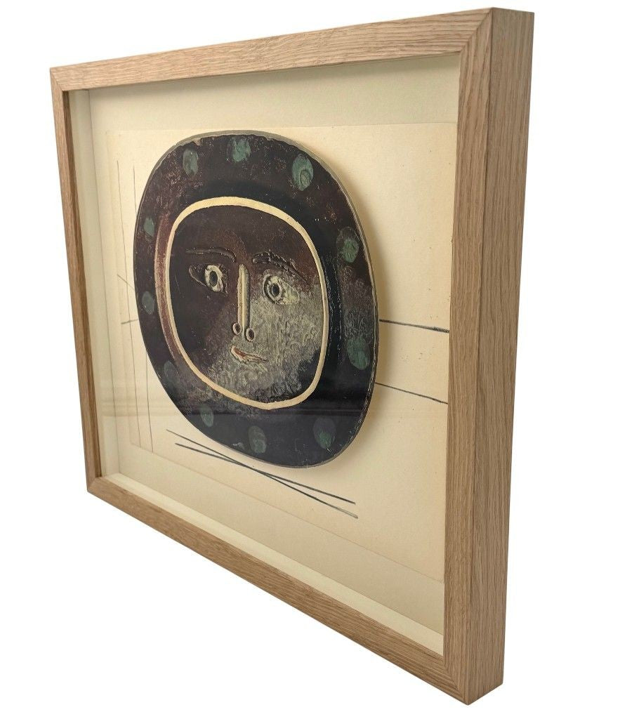 A framed lithographic plate from the 1948 Swedish, limited edition portfolio of only 200 “Ceramiques de Picasso” by Albert Skira, framed, with the die-cut, gloss coloured lithograph of a ceramic plate with a Picasso face. The “plate” is float mounted in natural oak box frame and glazed with UV protective art glass.