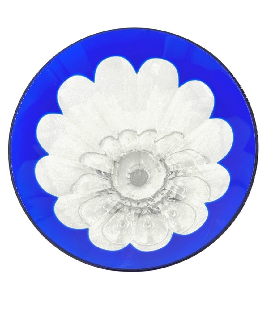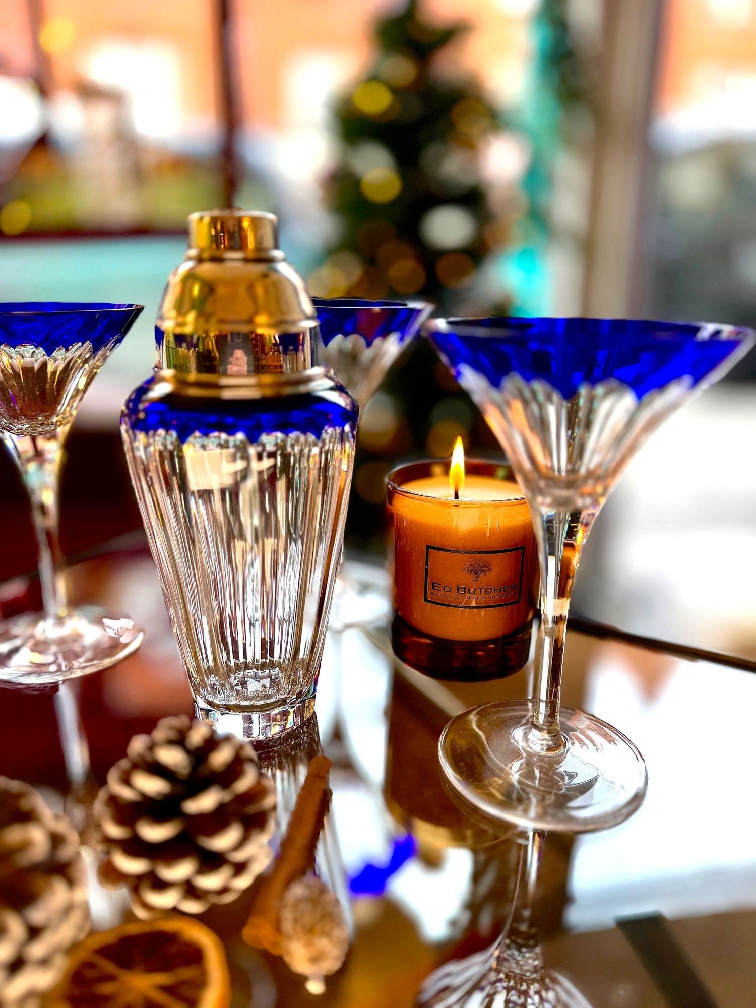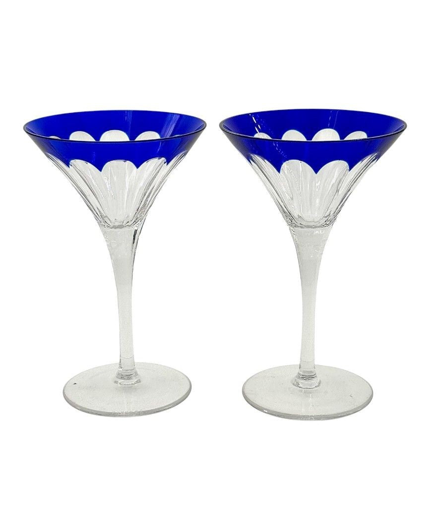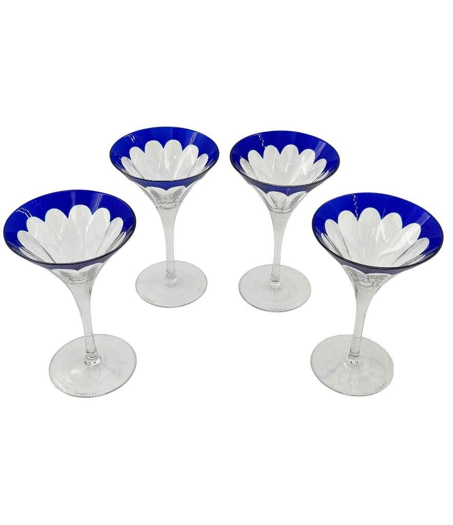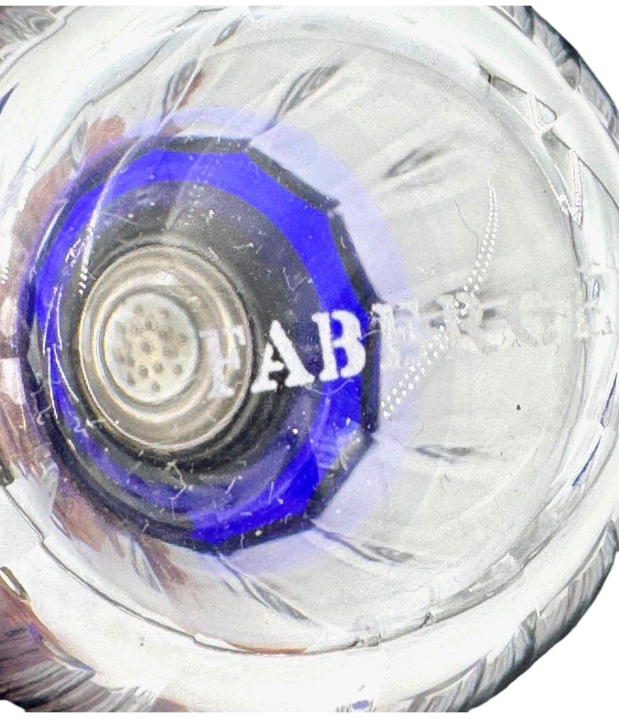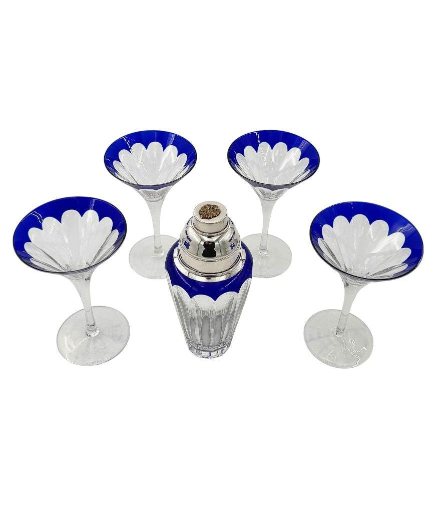 A Faberge crystal "Grand Duke" cocktail set with a blue cut crystal and silver plated cocktail shaker, embossed with brass Faberge crest in relief in wonderful deep blue cut crystal, with four cut blue crystal glasses. All etched "Faberge" on the base
