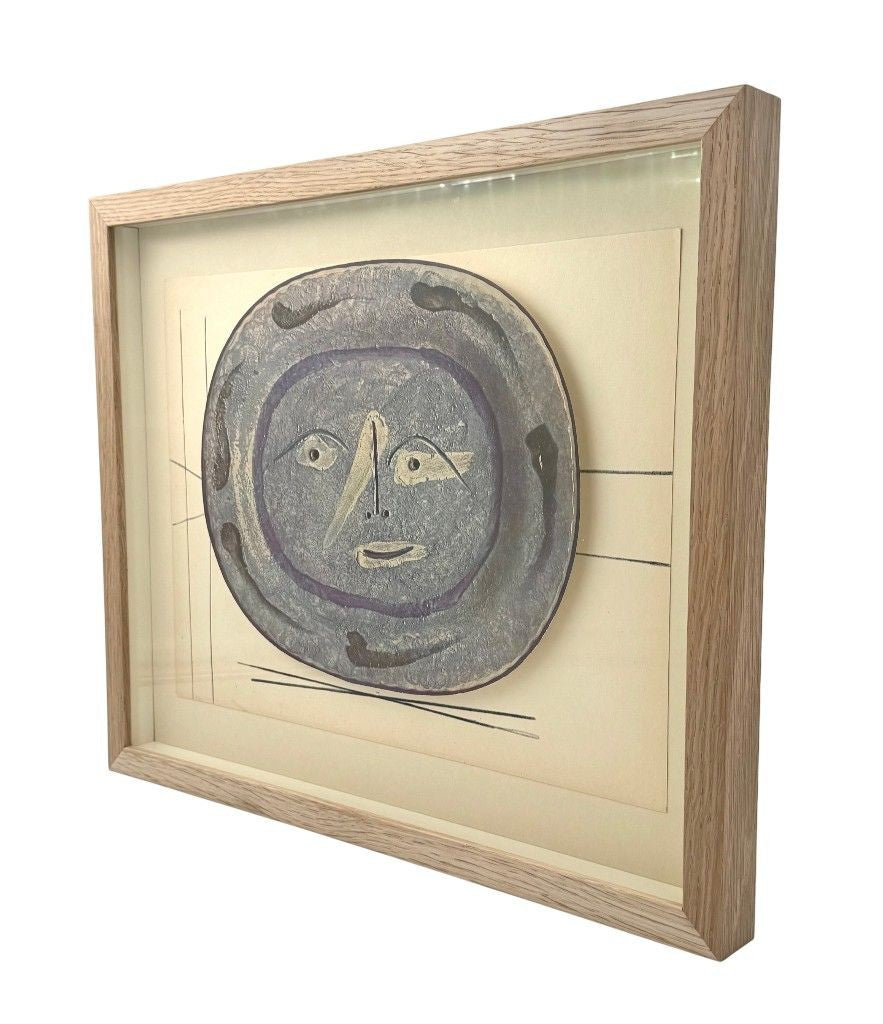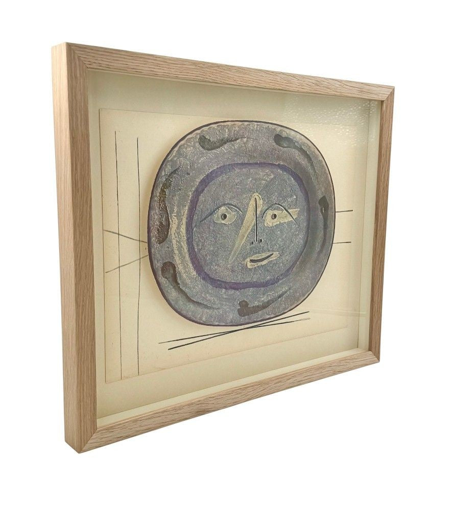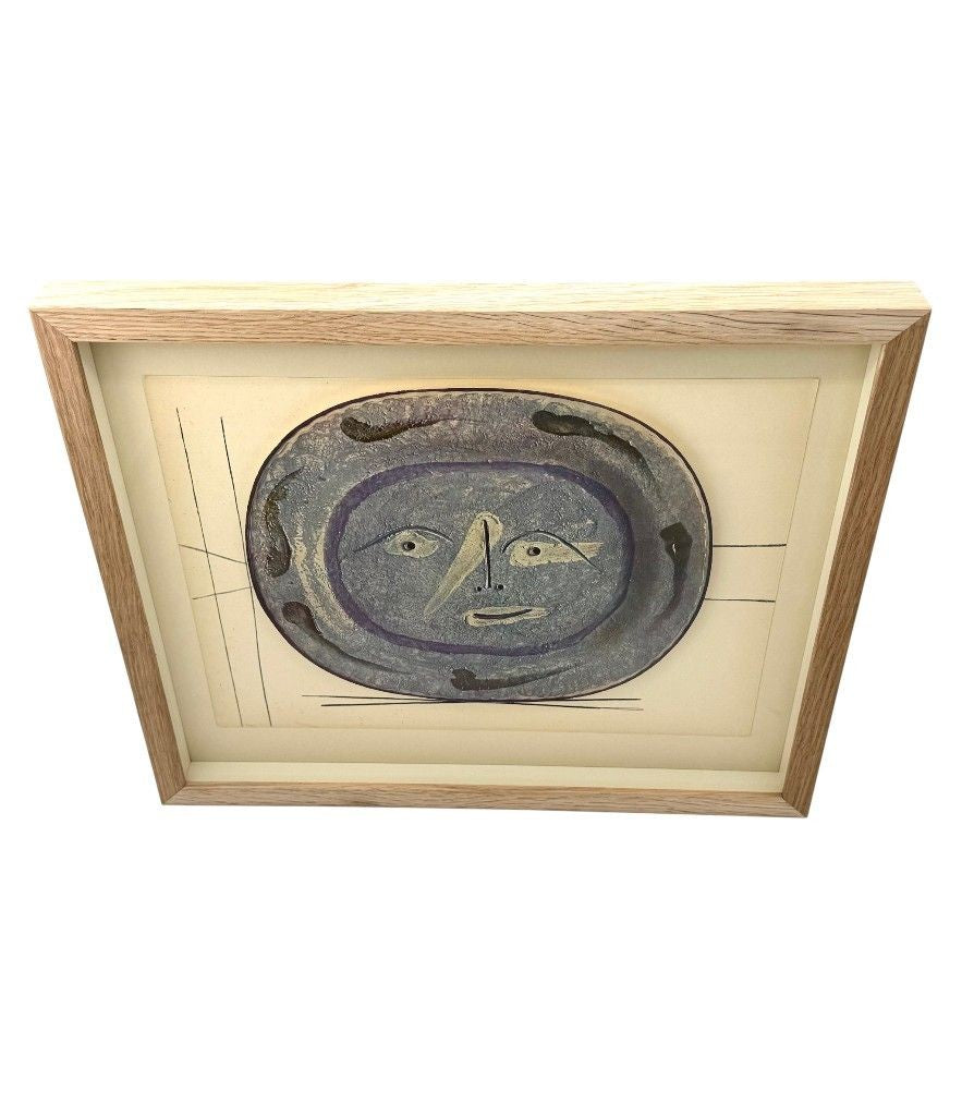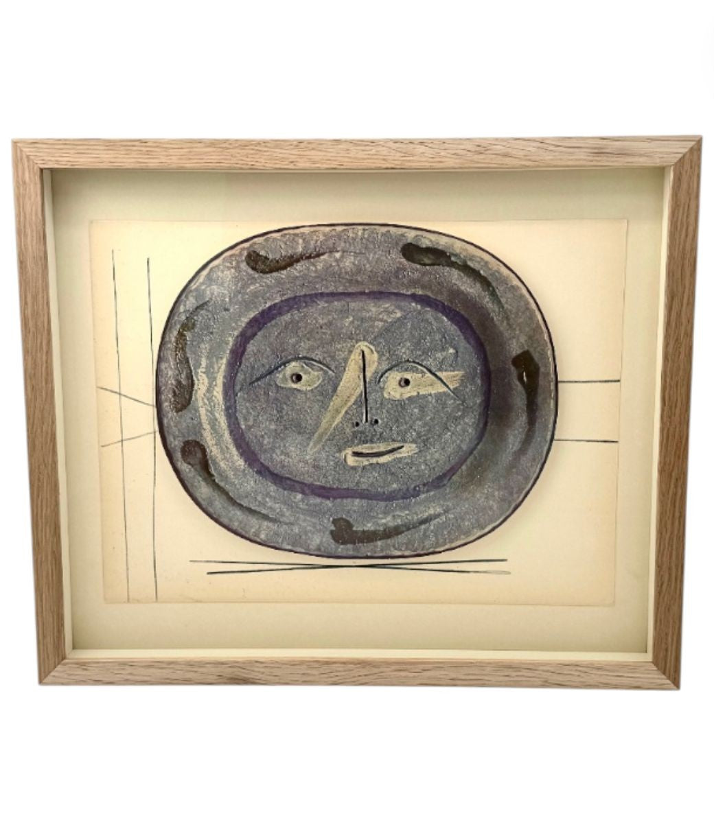 A framed lithographic plate from the 1948 Swedish, limited edition portfolio of only 200  “Ceramiques de Picasso” by Albert Skira, framed, with the die-cut, gloss coloured lithograph of a ceramic plate with a Picasso face. The “plate” is float mounted in natural oak box frame and glazed with UV protective art glass.