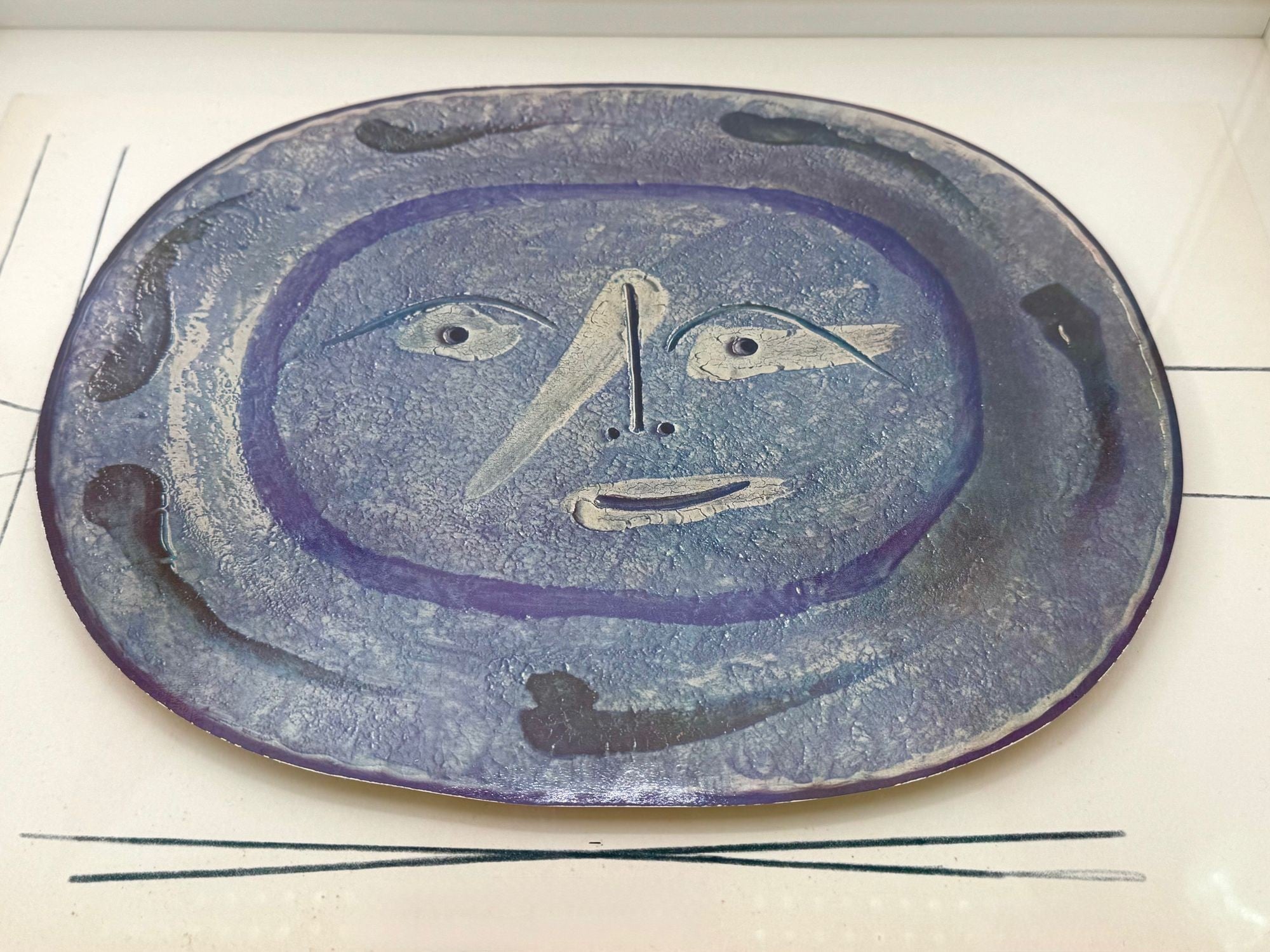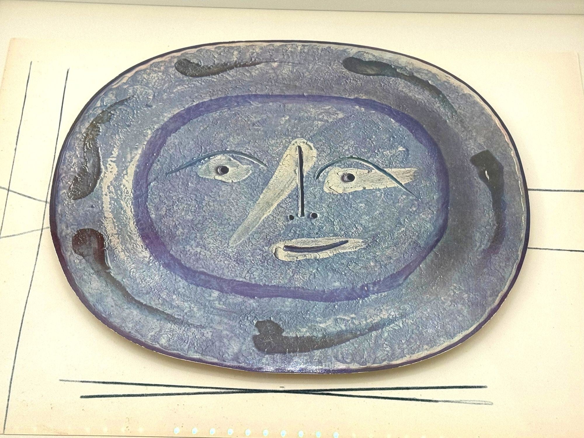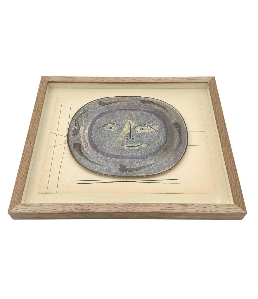 A framed lithographic plate from the 1948 Swedish, limited edition portfolio of only 200  “Ceramiques de Picasso” by Albert Skira, framed, with the die-cut, gloss coloured lithograph of a ceramic plate with a Picasso face. The “plate” is float mounted in natural oak box frame and glazed with UV protective art glass.