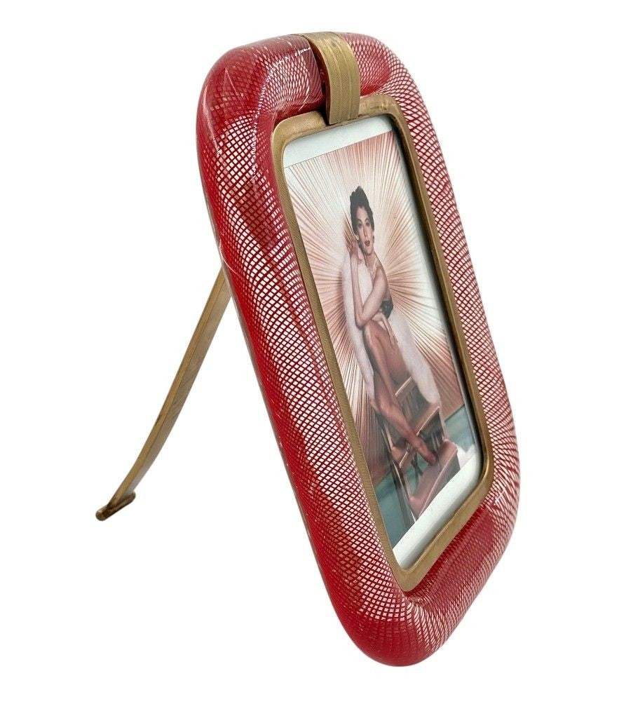 A rare 1930s Venini & Co Murano "Filigrana a Reticello" glass frame by Carlo Scarpa,  The Murano glass frame has a brass, etched inner solid brass frame, with central etched collar and a beautifully designed solid brass stand that allows you to remove the stand to hang it on the wall. Stamped on the reverse of the brass stand "Venini, Murano, Made in Italy"