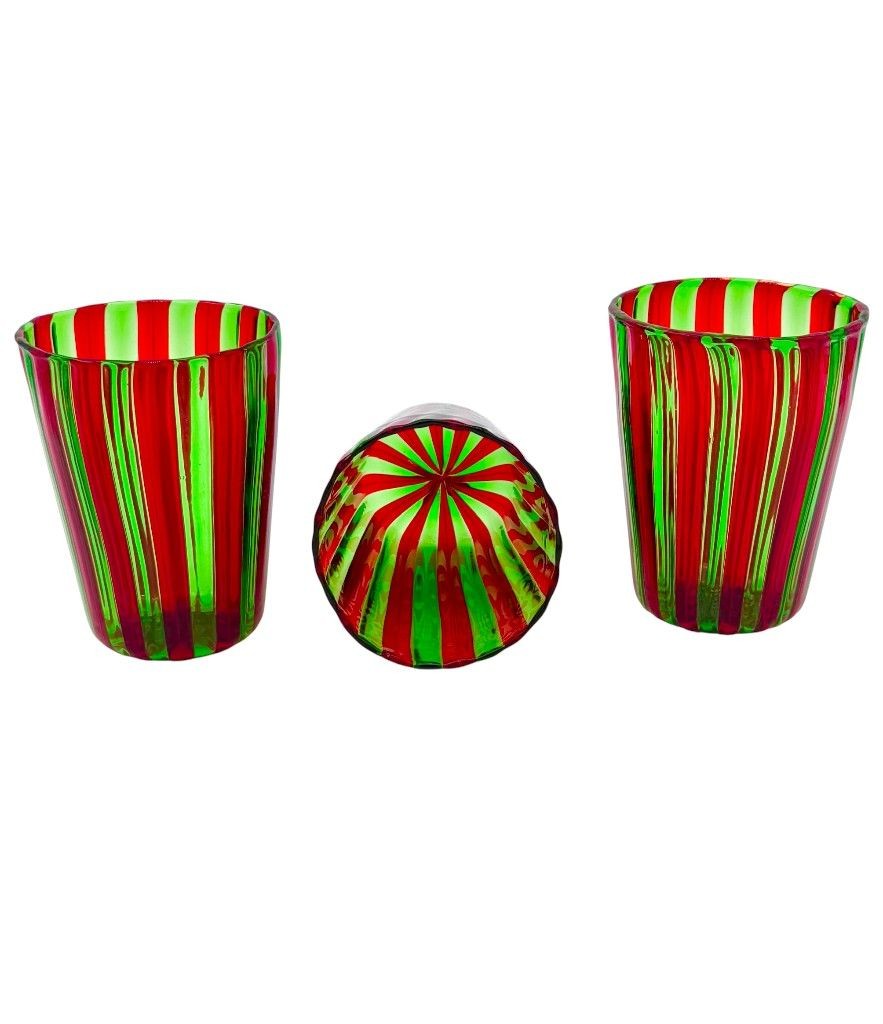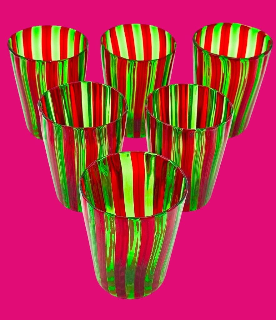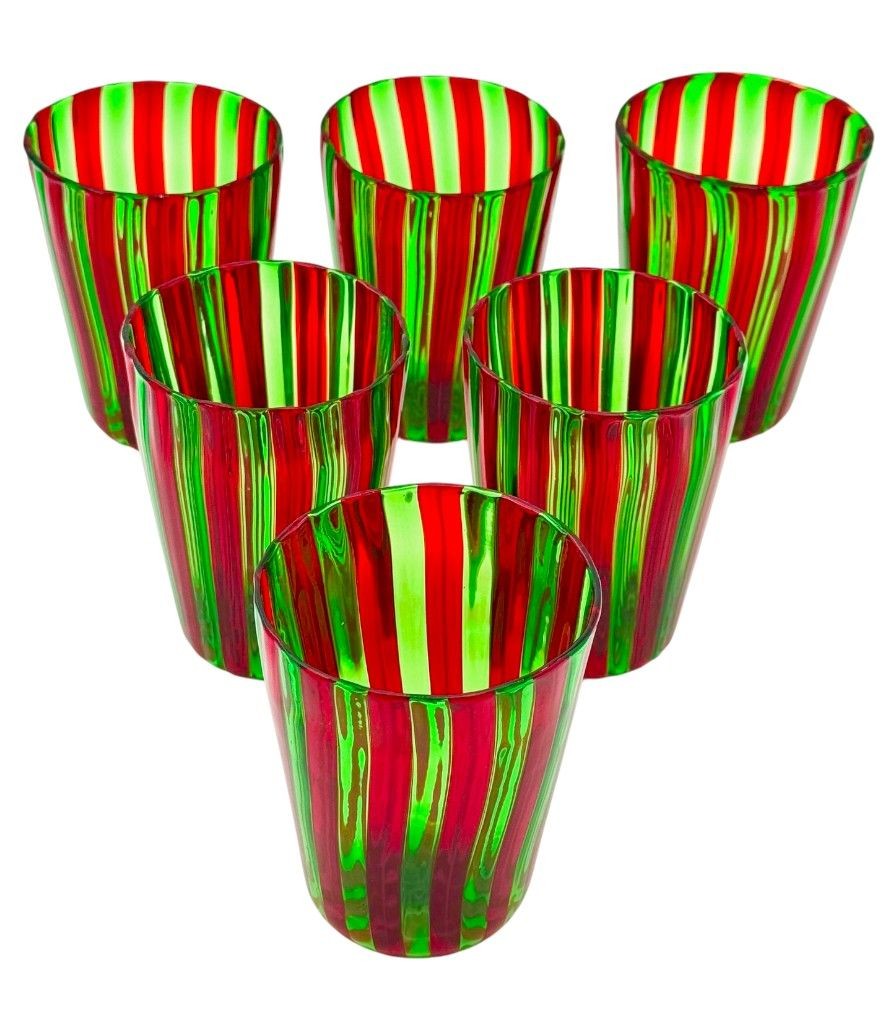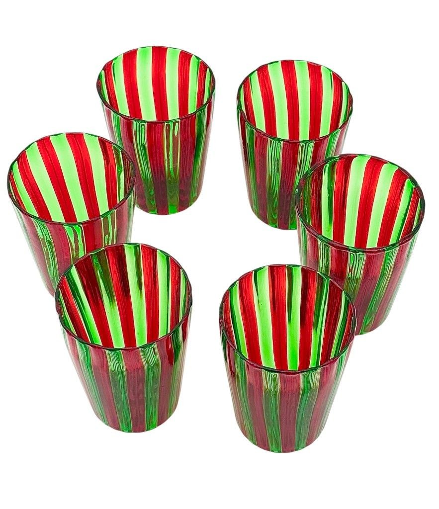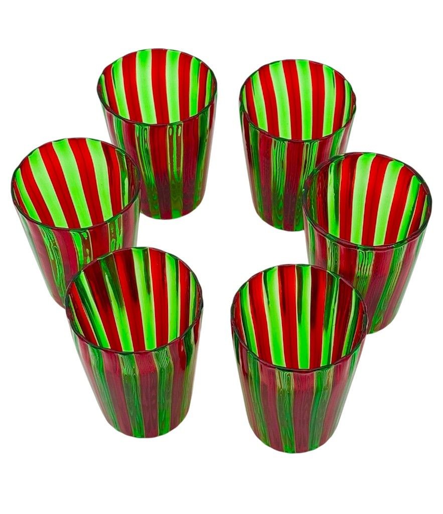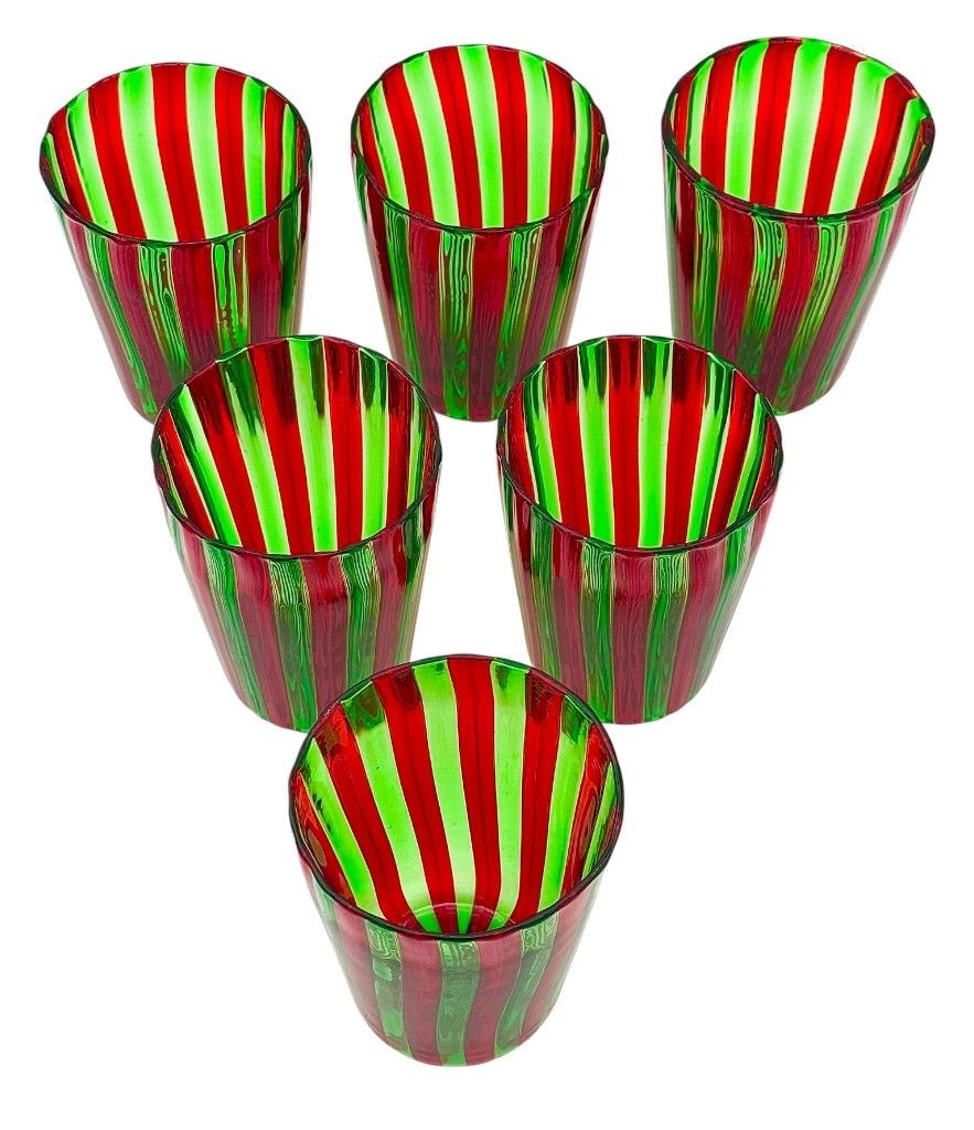 A set of six wonderful Italian handblown Murano glass tumblers with green and red stripes