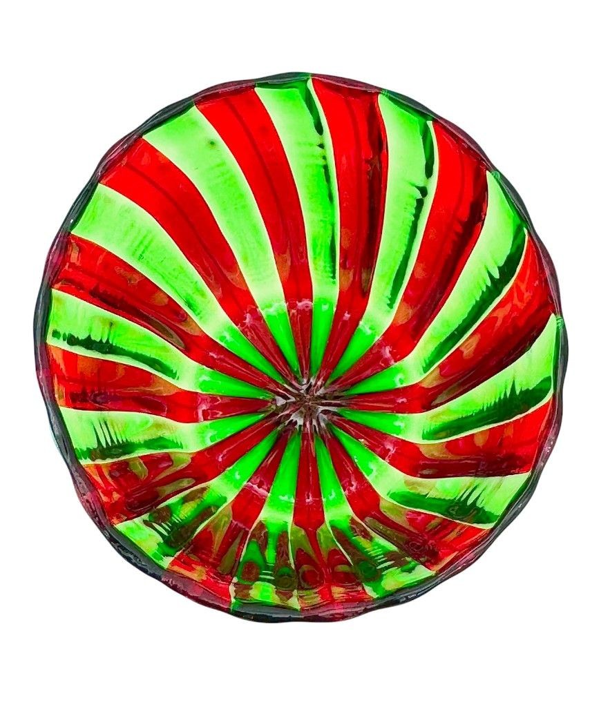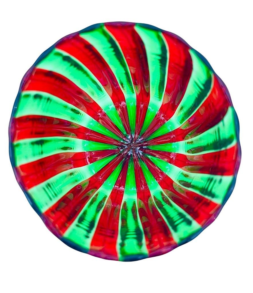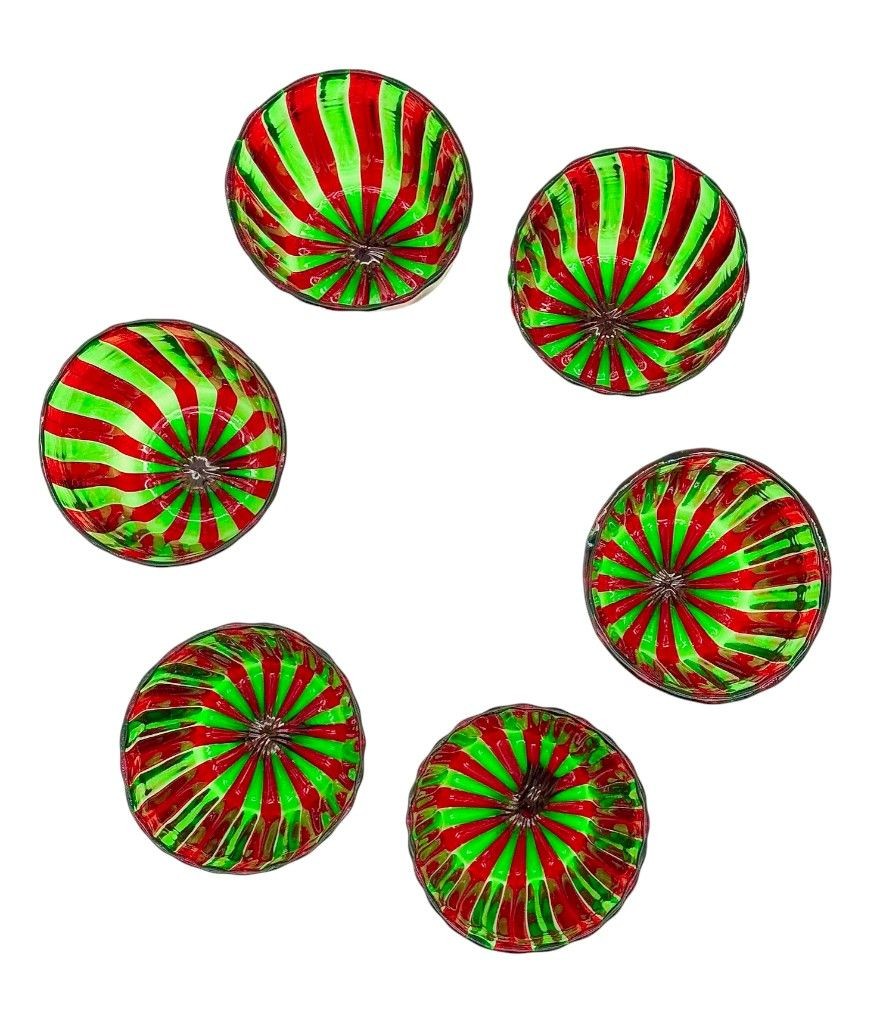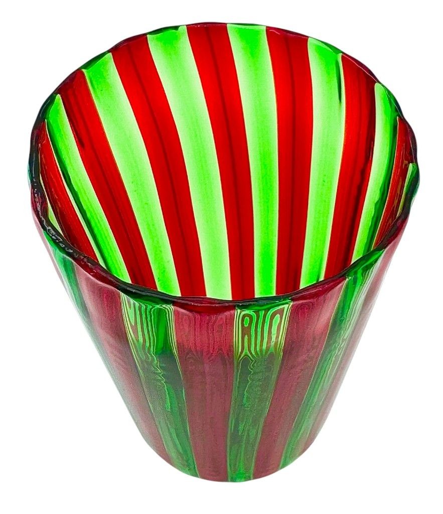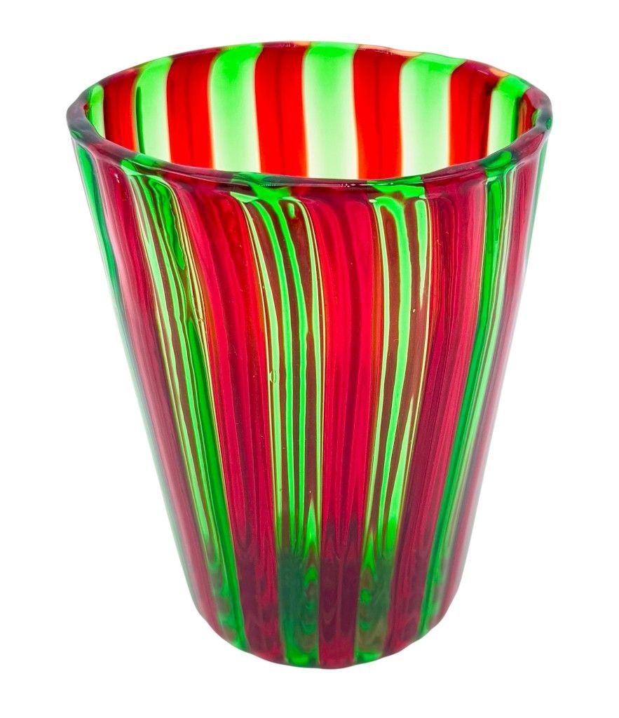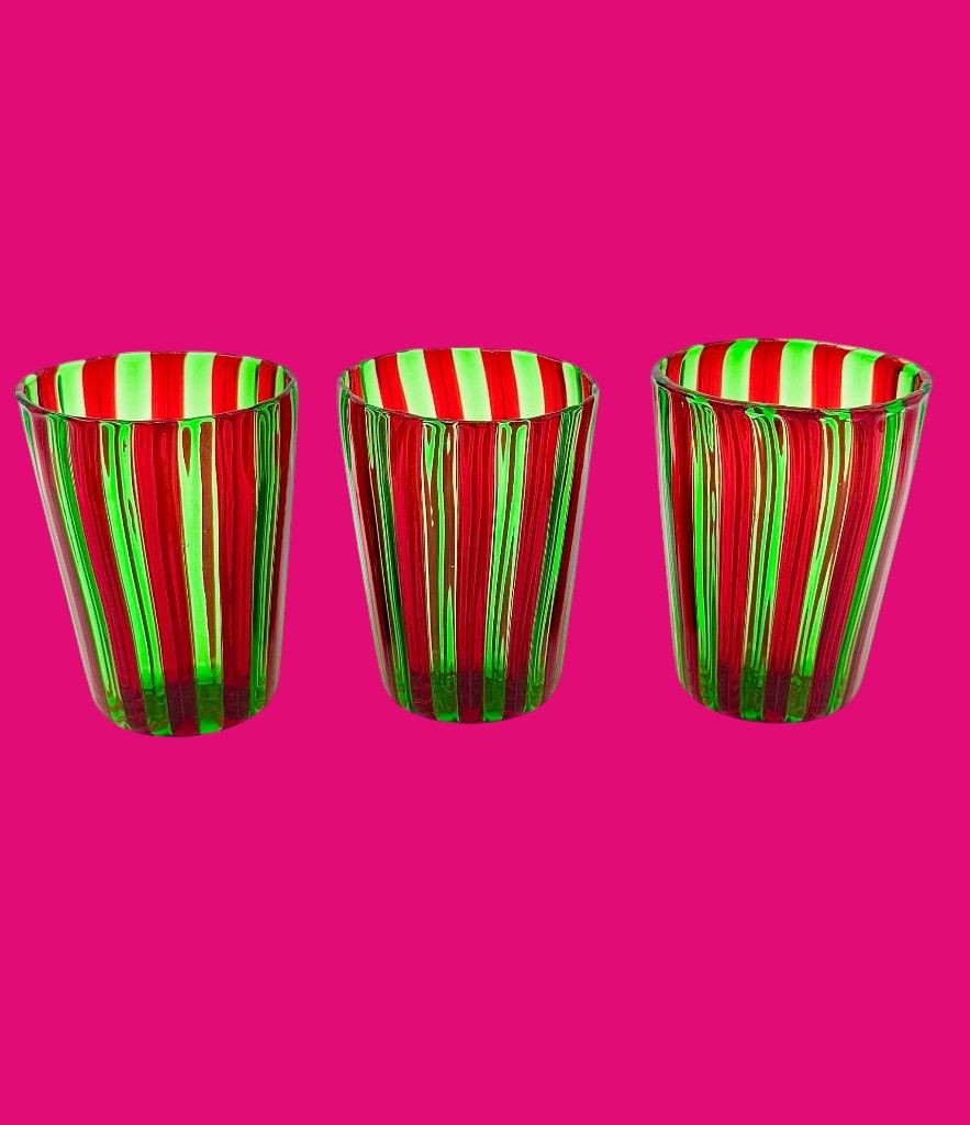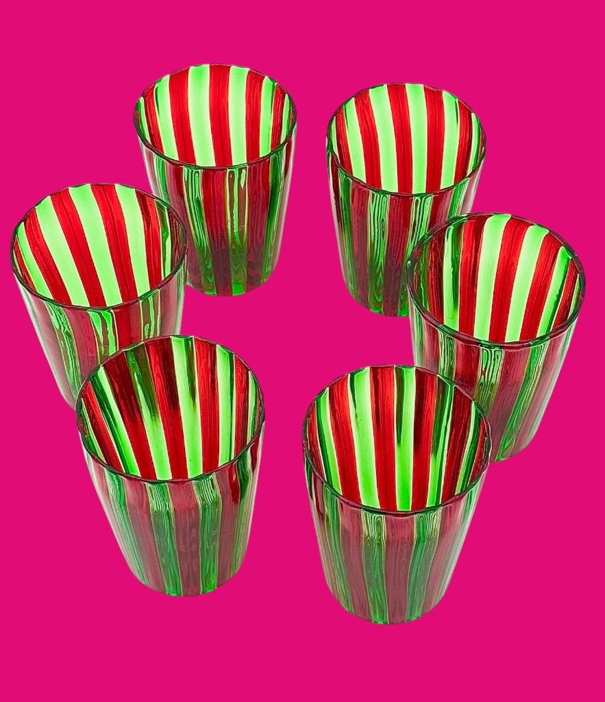 A set of six wonderful Italian handblown Murano glass tumblers with green and red stripes
