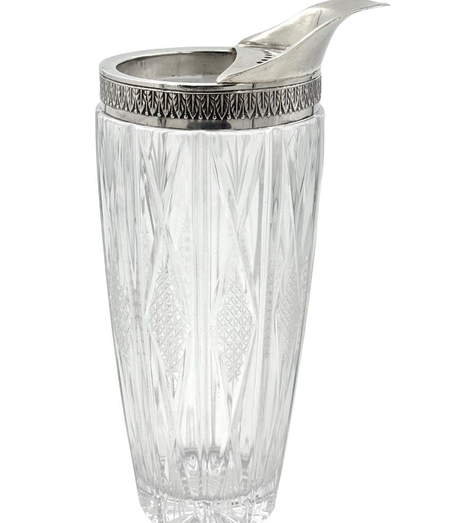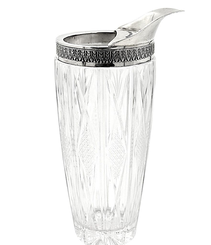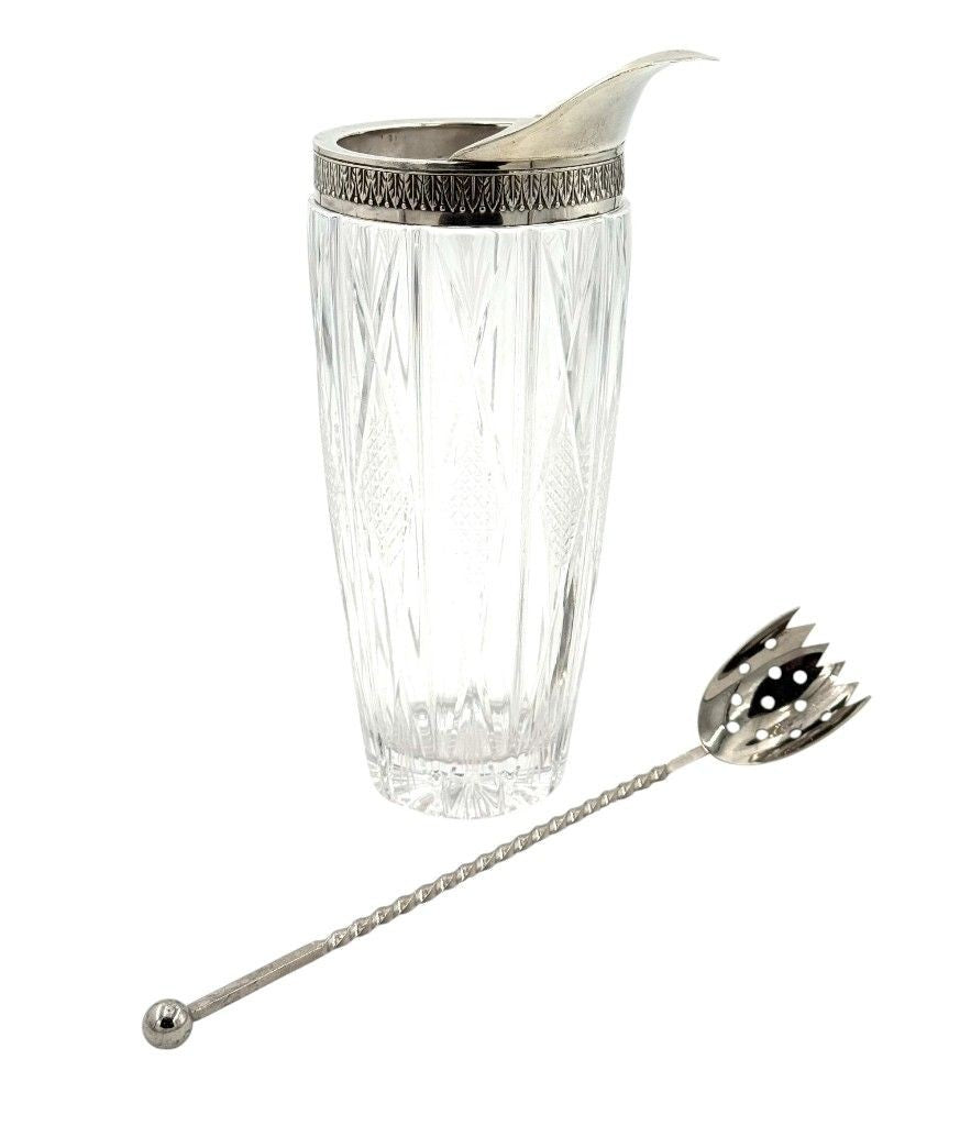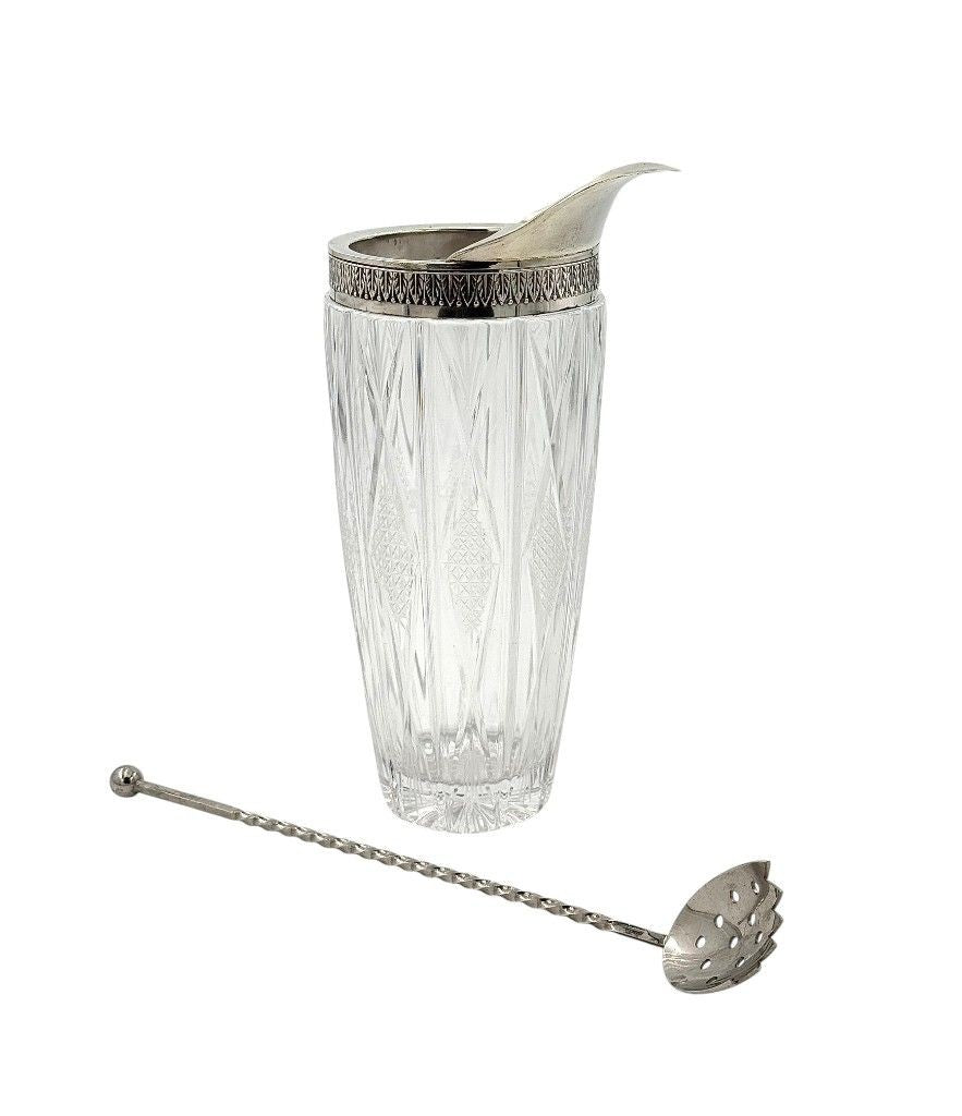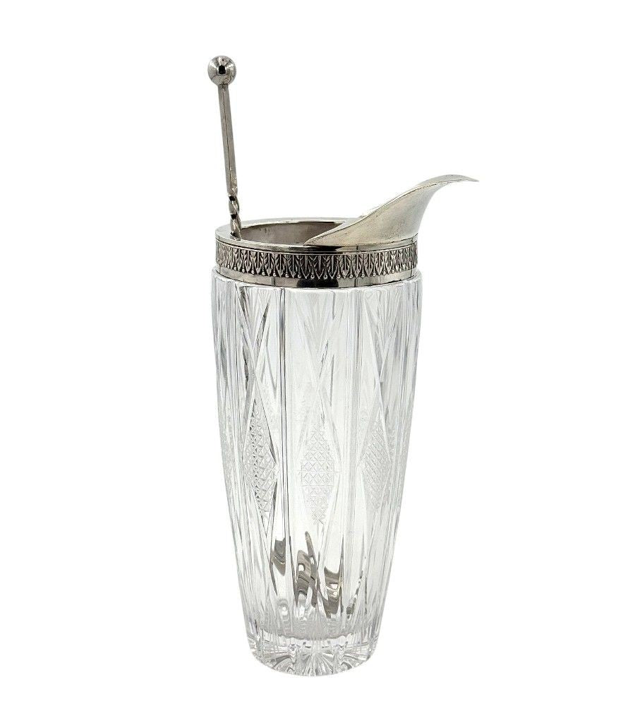 An Italian 1950s crystal and silver topped cocktail jug, stamped with 800 (80 %) silver mark and decorated with palm motif around the rim, with nickel muddling spoon