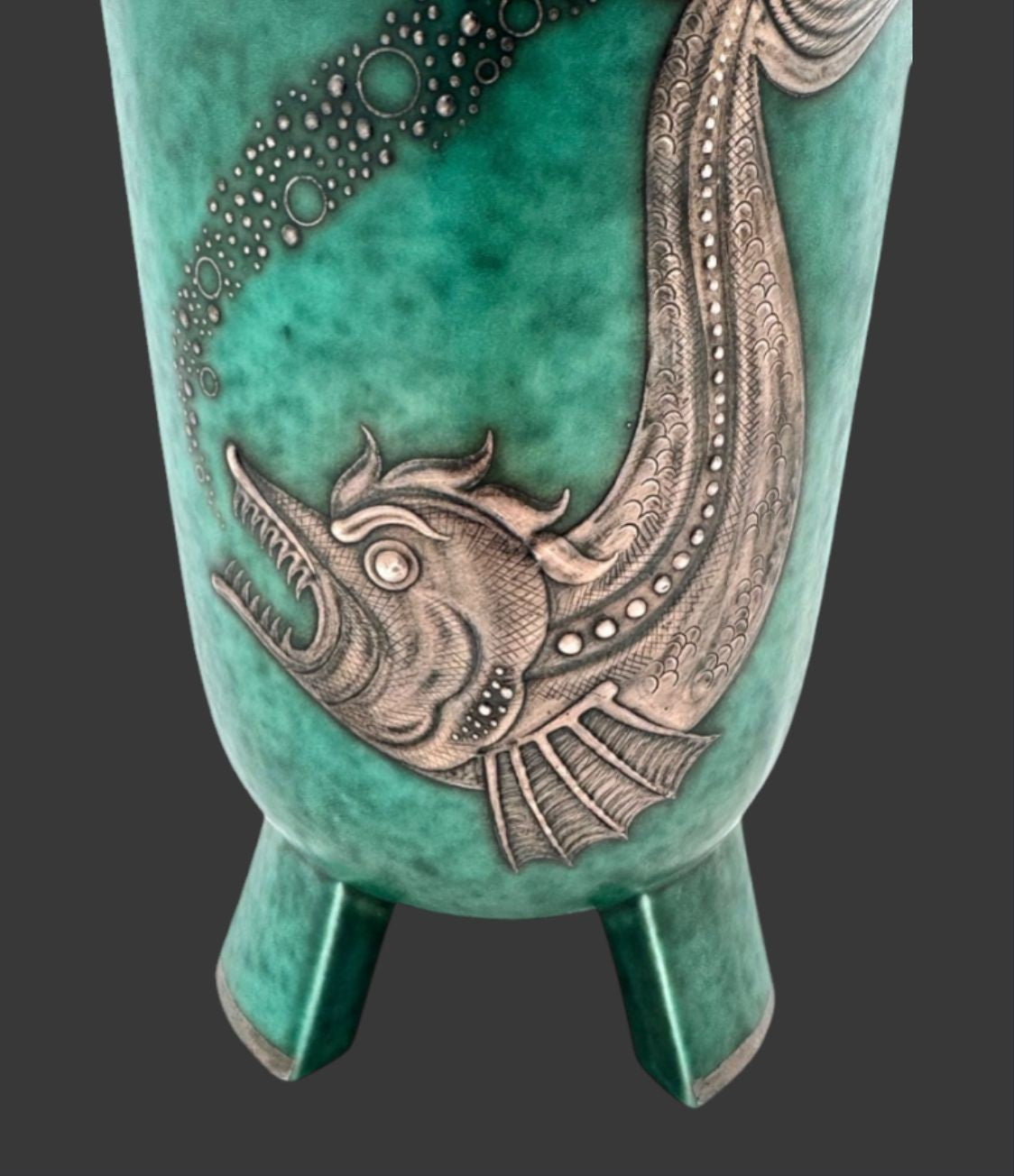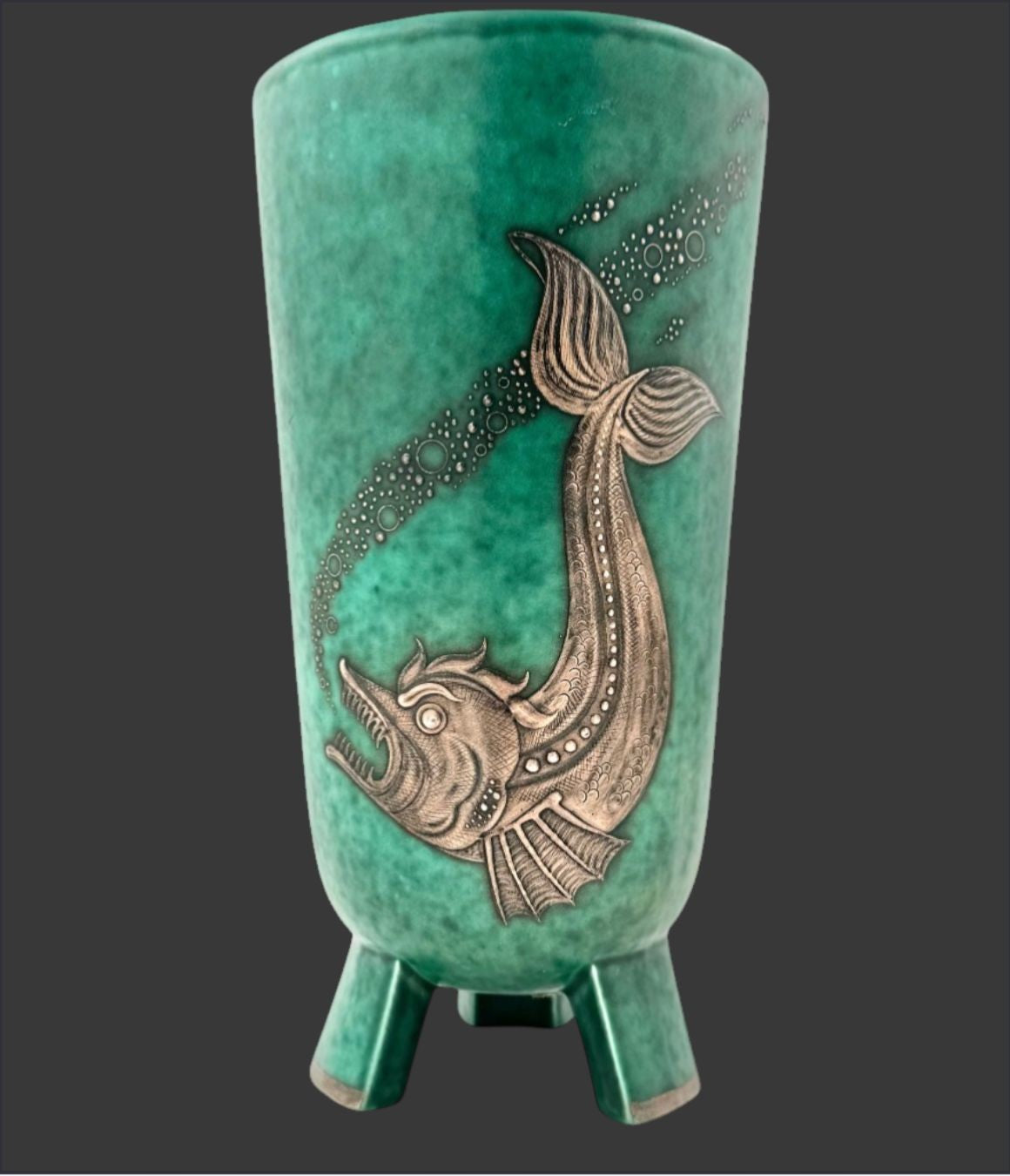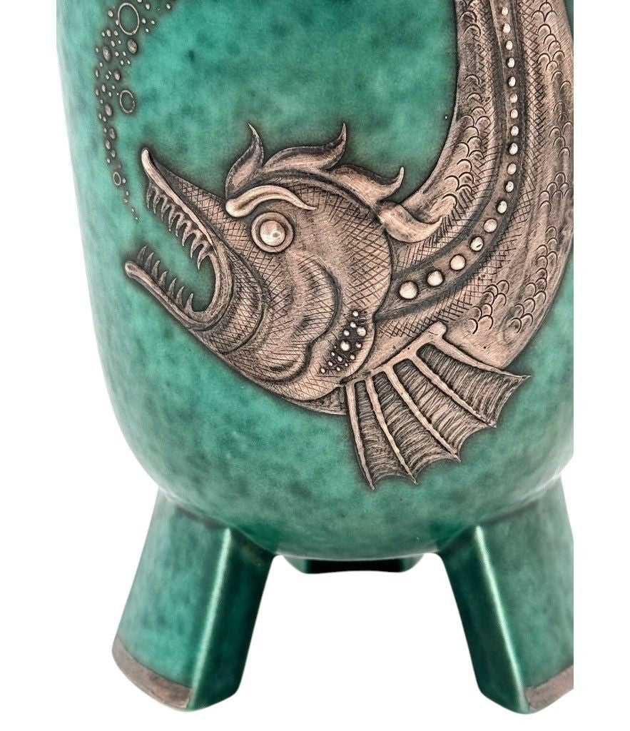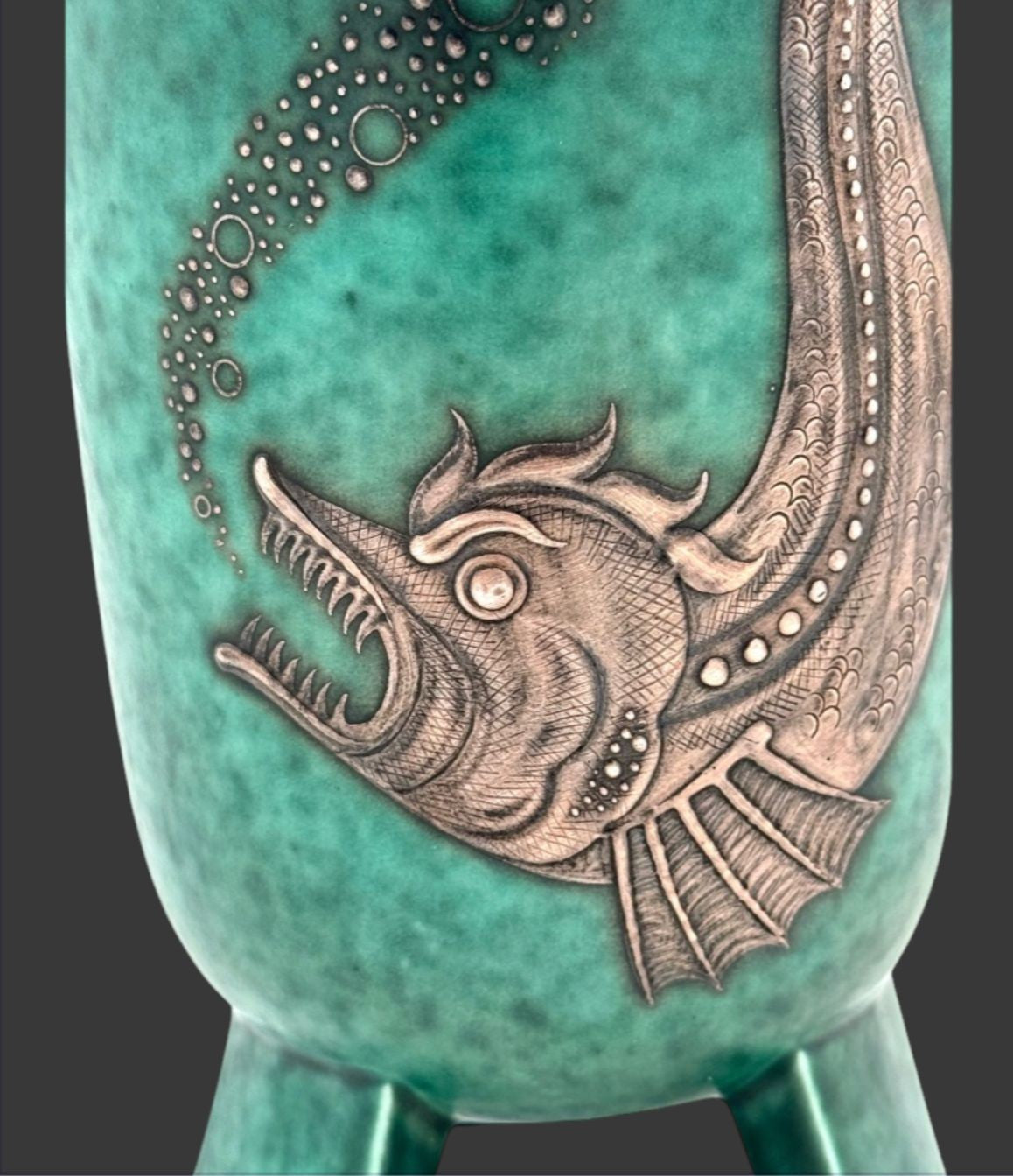 A lovely Art Deco 1930s three legged stoneware vase by Wilhelm Kåge, for Gustavsberg, Sweden. Designed with the iconic mottled green base, which was produced by copper oxide and decorated with a mythological fish with a string of bubbles rising up to the rim, all in the iconic silvered, hand painted and chiselled finish. Stamped on the base with orignal Gustavsberg sticker.