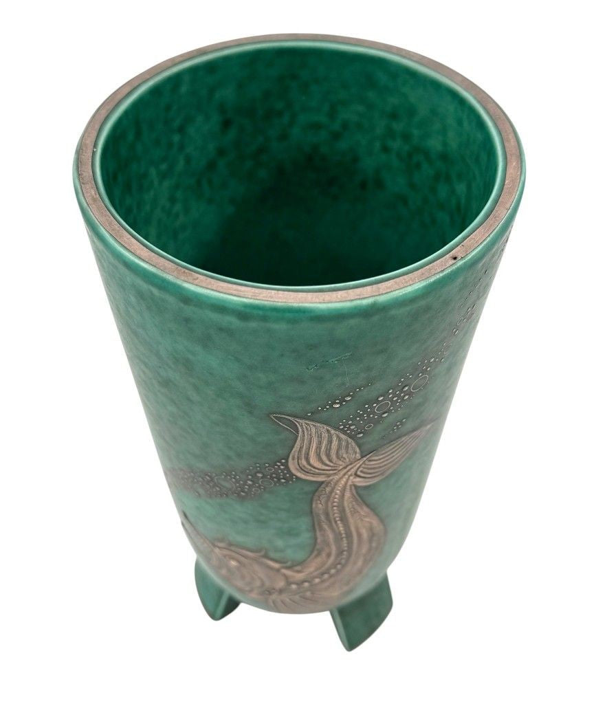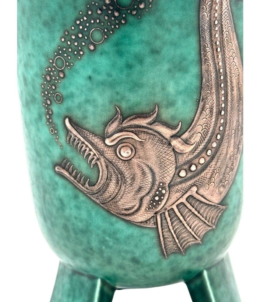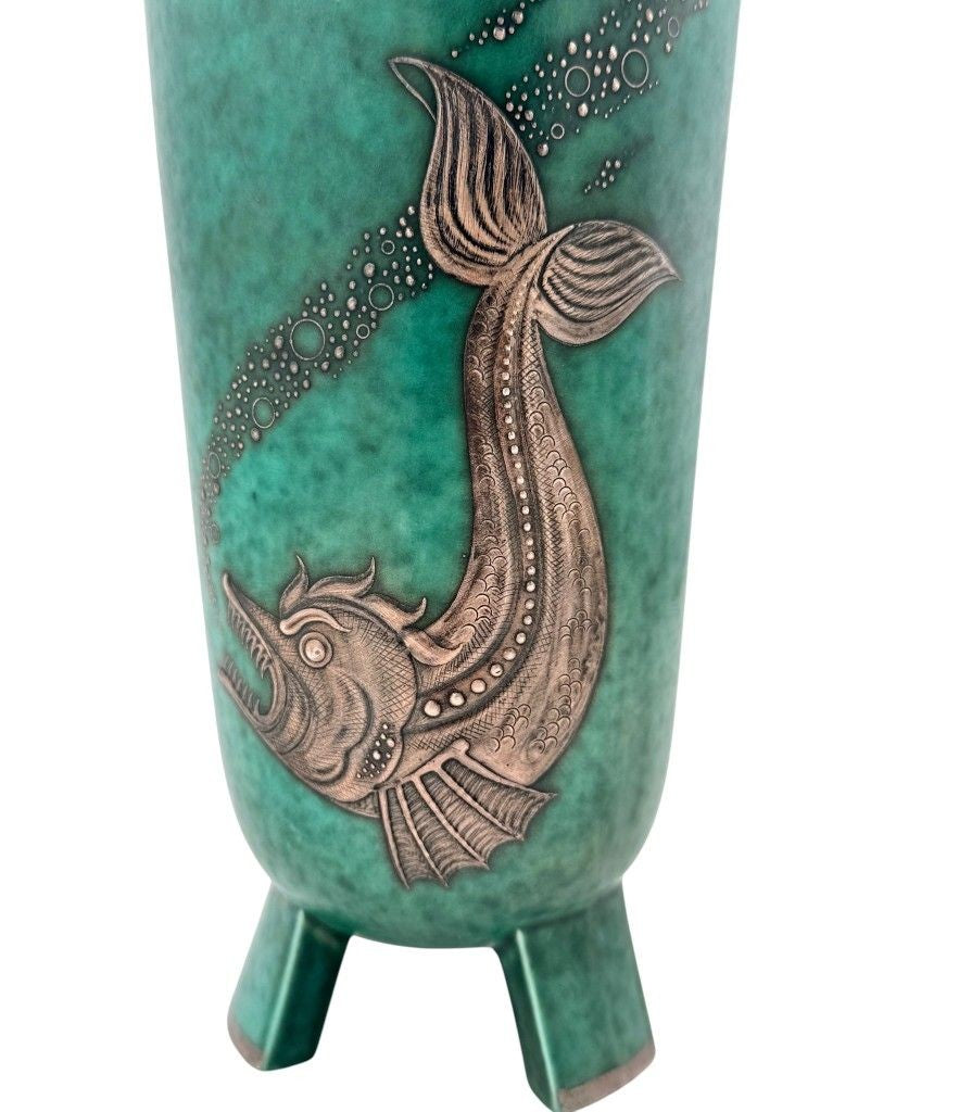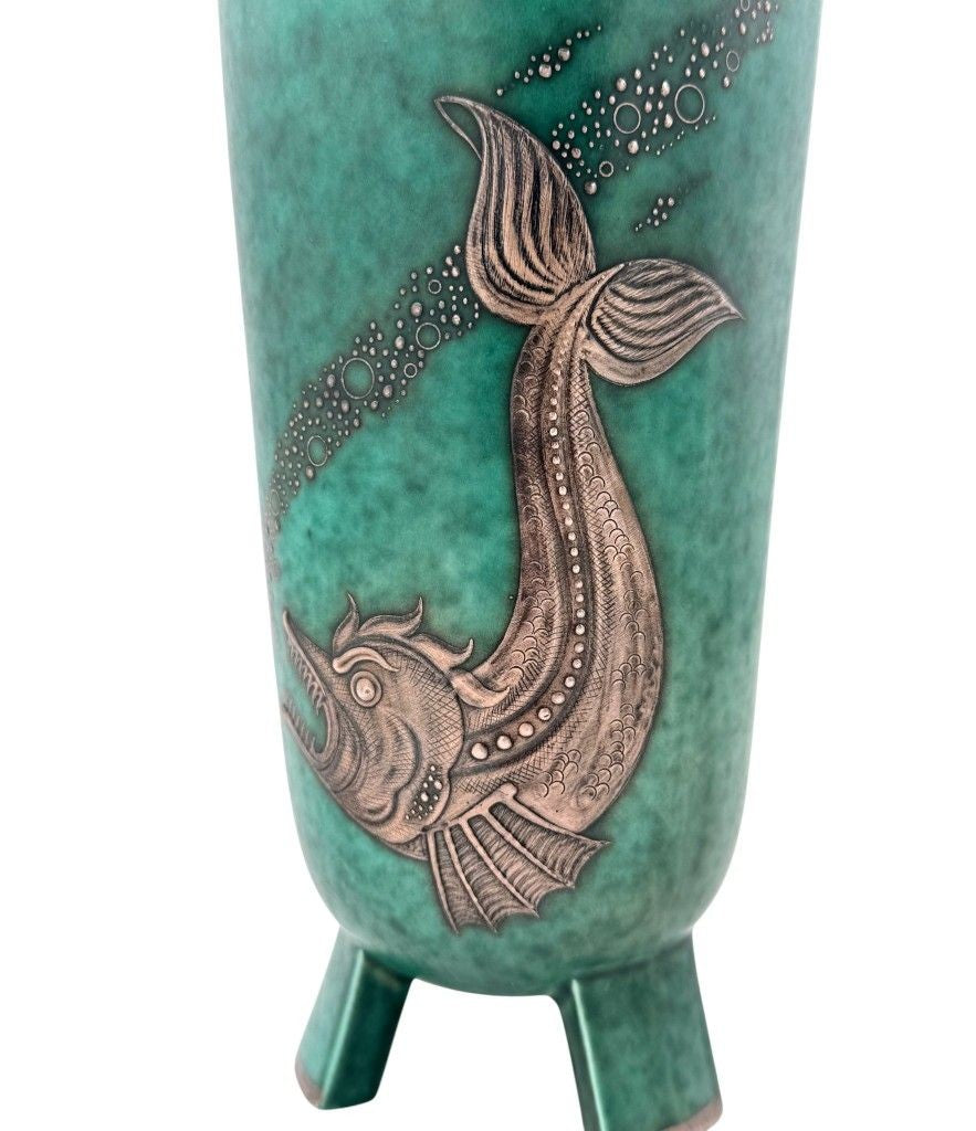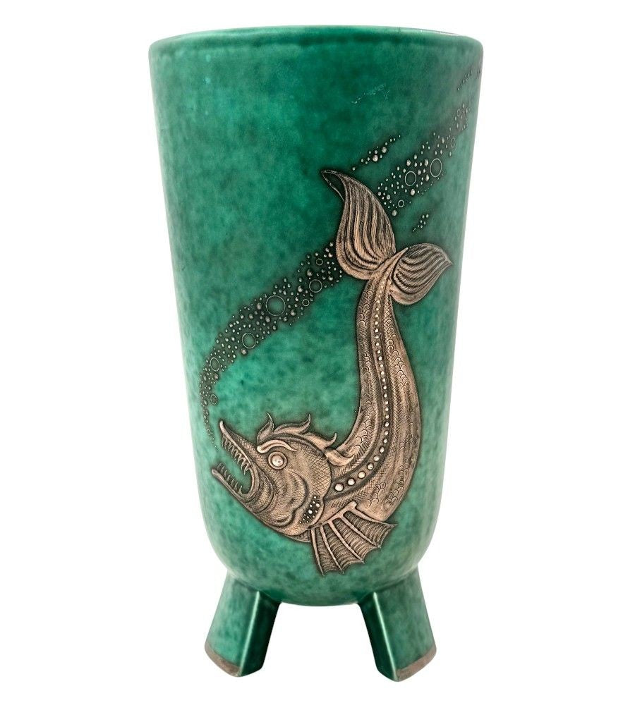 A lovely Art Deco 1930s three legged stoneware vase by Wilhelm Kåge, for Gustavsberg, Sweden. Designed with the iconic mottled green base, which was produced by copper oxide and decorated with a mythological fish with a string of bubbles rising up to the rim, all in the iconic silvered, hand painted and chiselled finish. Stamped on the base with orignal Gustavsberg sticker.