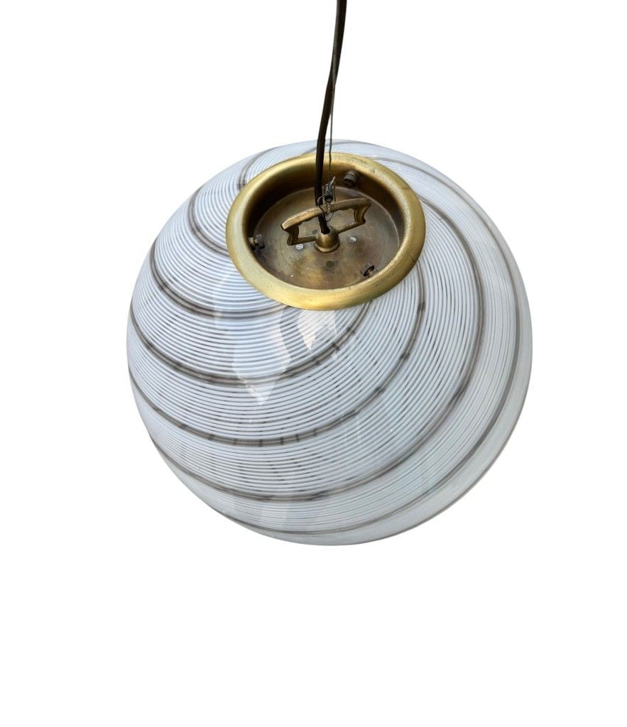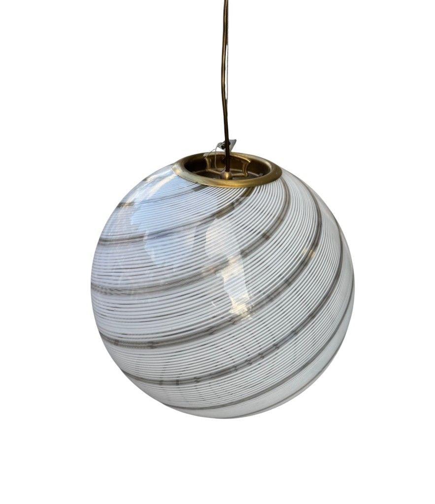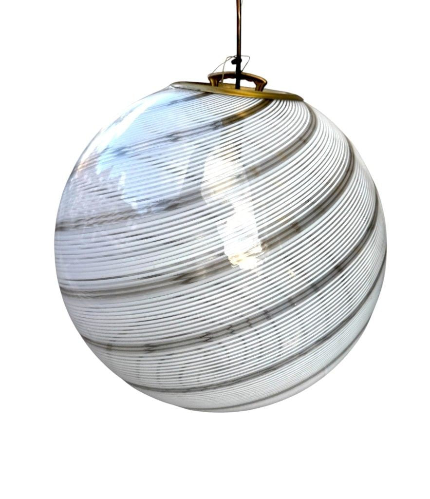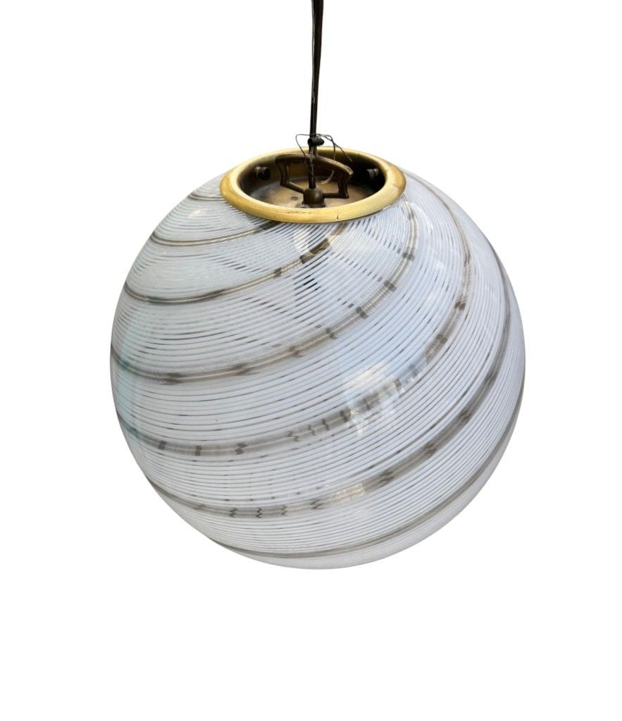 A large 1960s Venini Murano glass ball “Tessuto” swirl pendant light white swirling line design