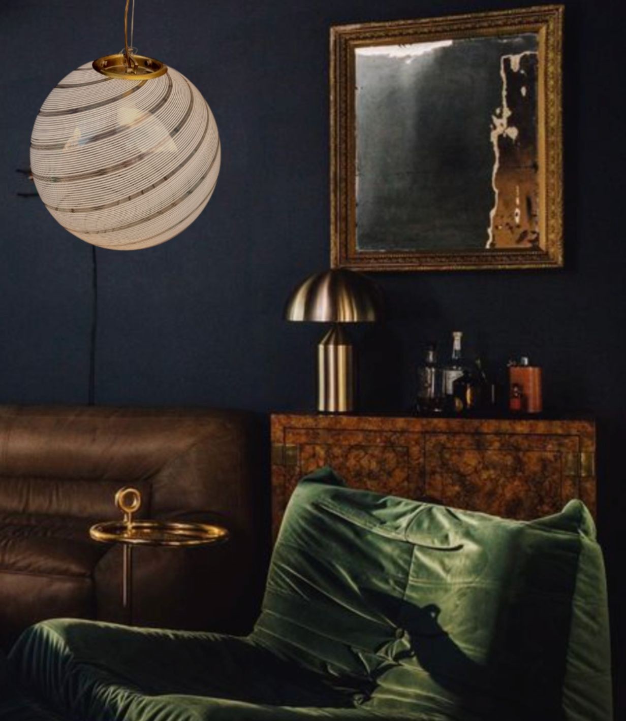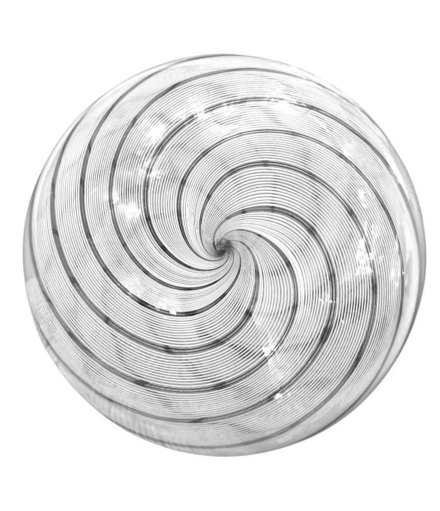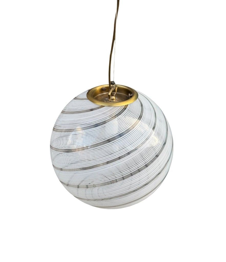 A large 1960s Venini Murano glass ball “Tessuto” swirl pendant light white swirling line design