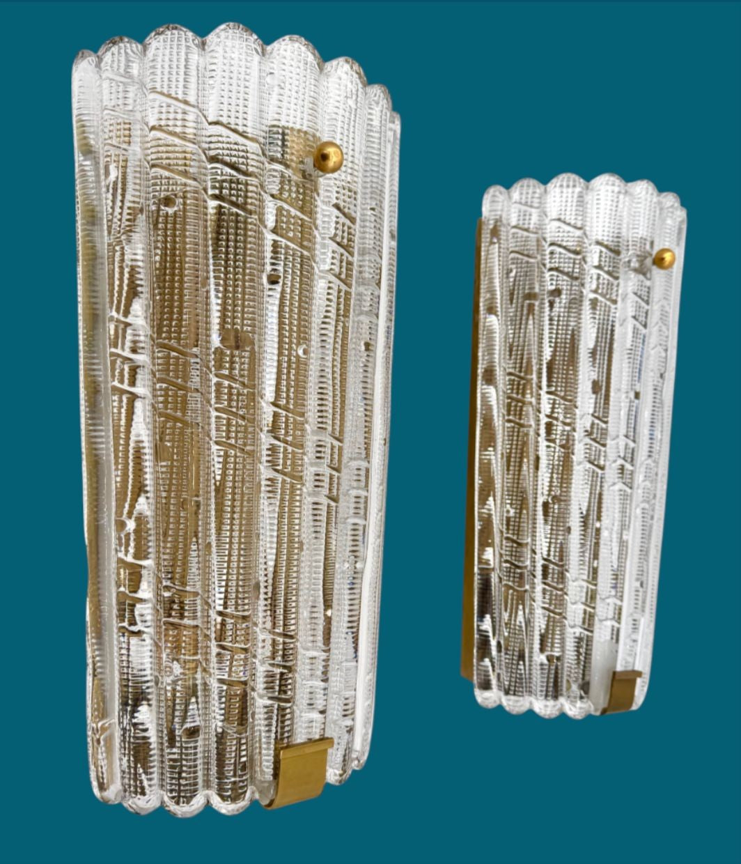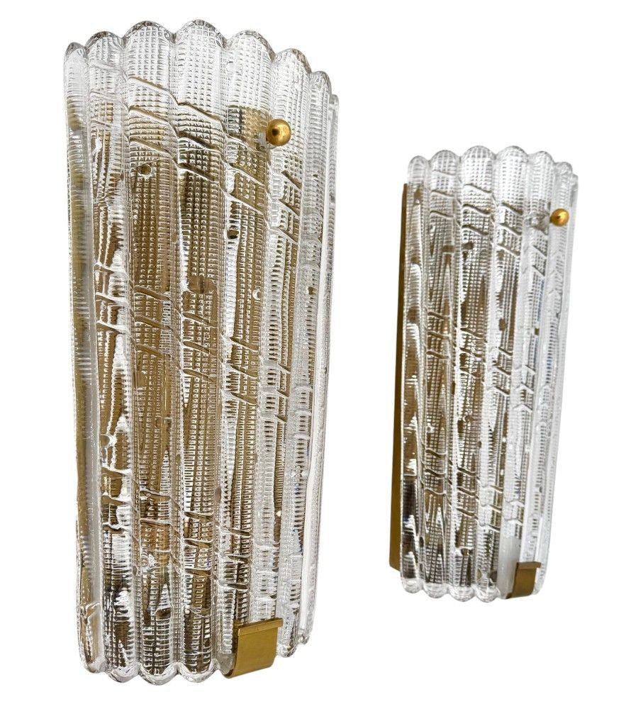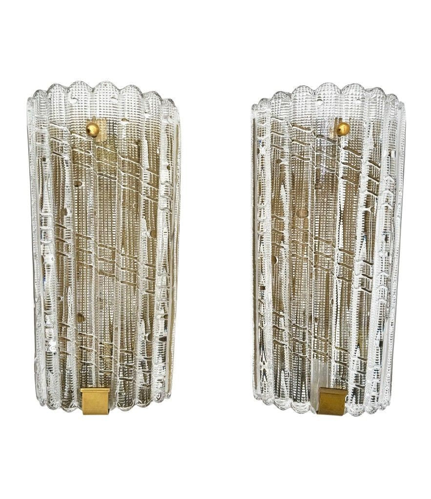A large pair of Swedish 1960s Orrefors glass and brass wall sconces by Carl Fagerlund