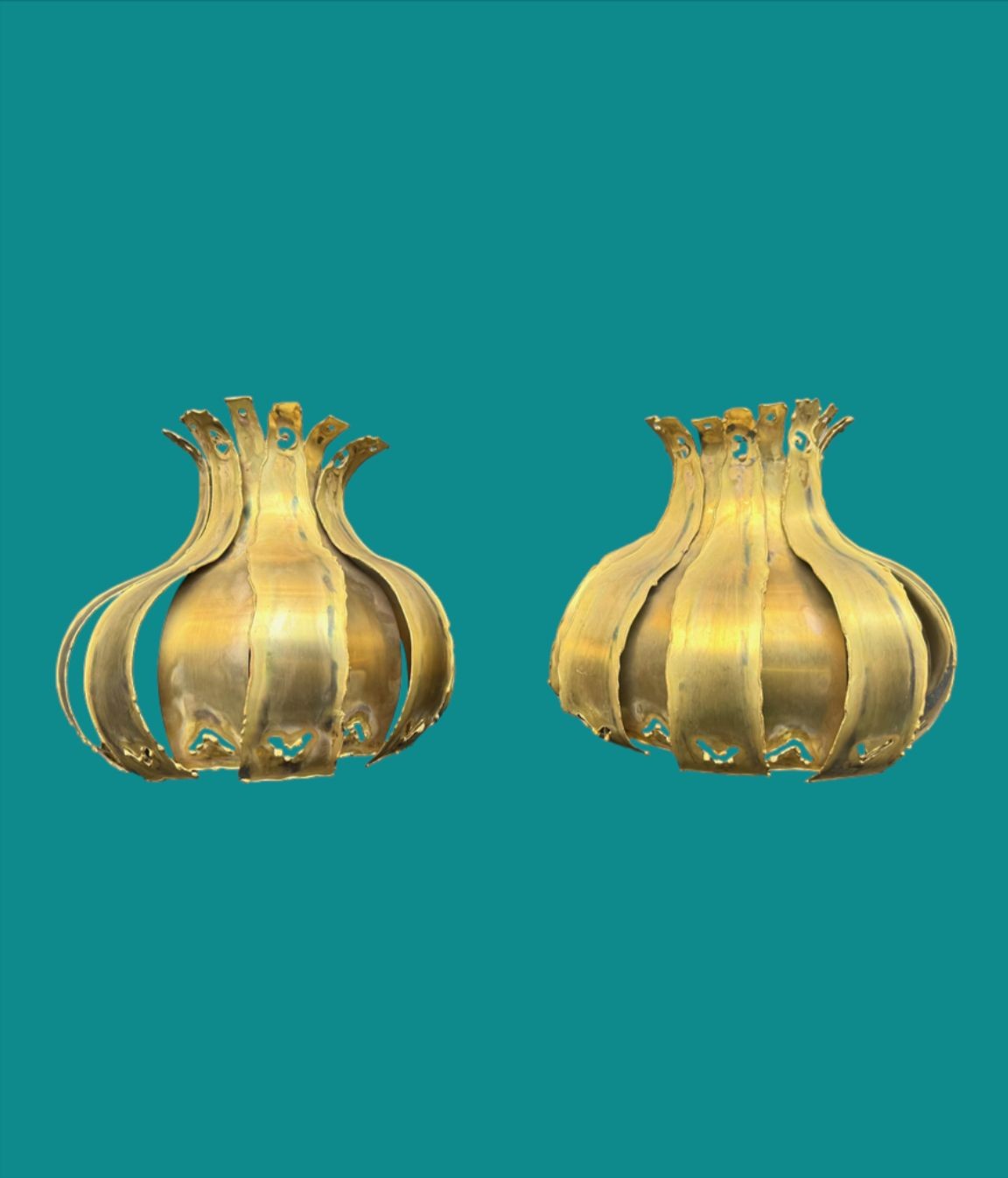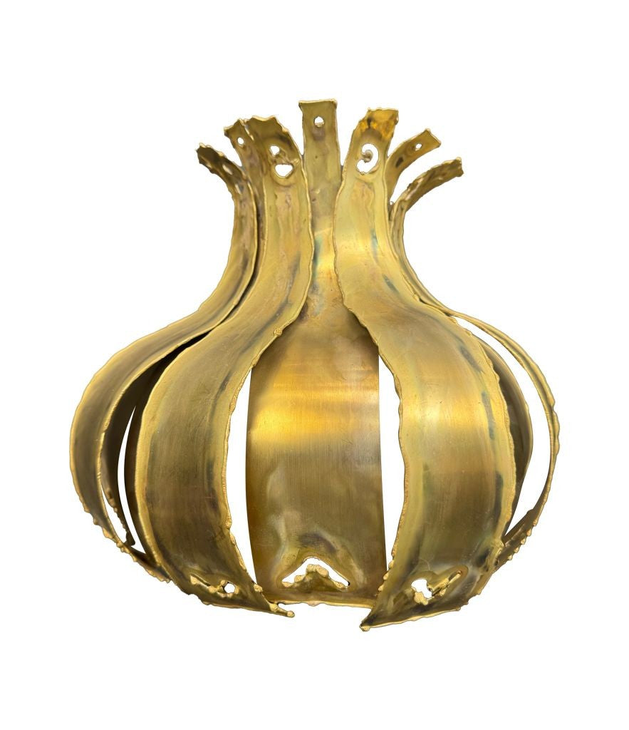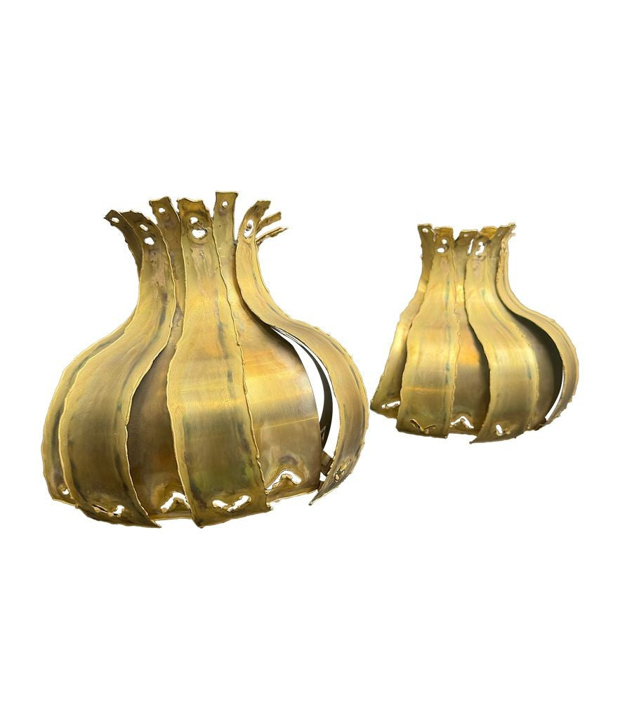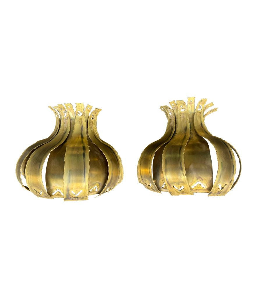 A pair of 1960s Holm Sorensen torch cut brass artichoke shaped wall sconces, with white enamel back plates and re-wired with new brass fittings.