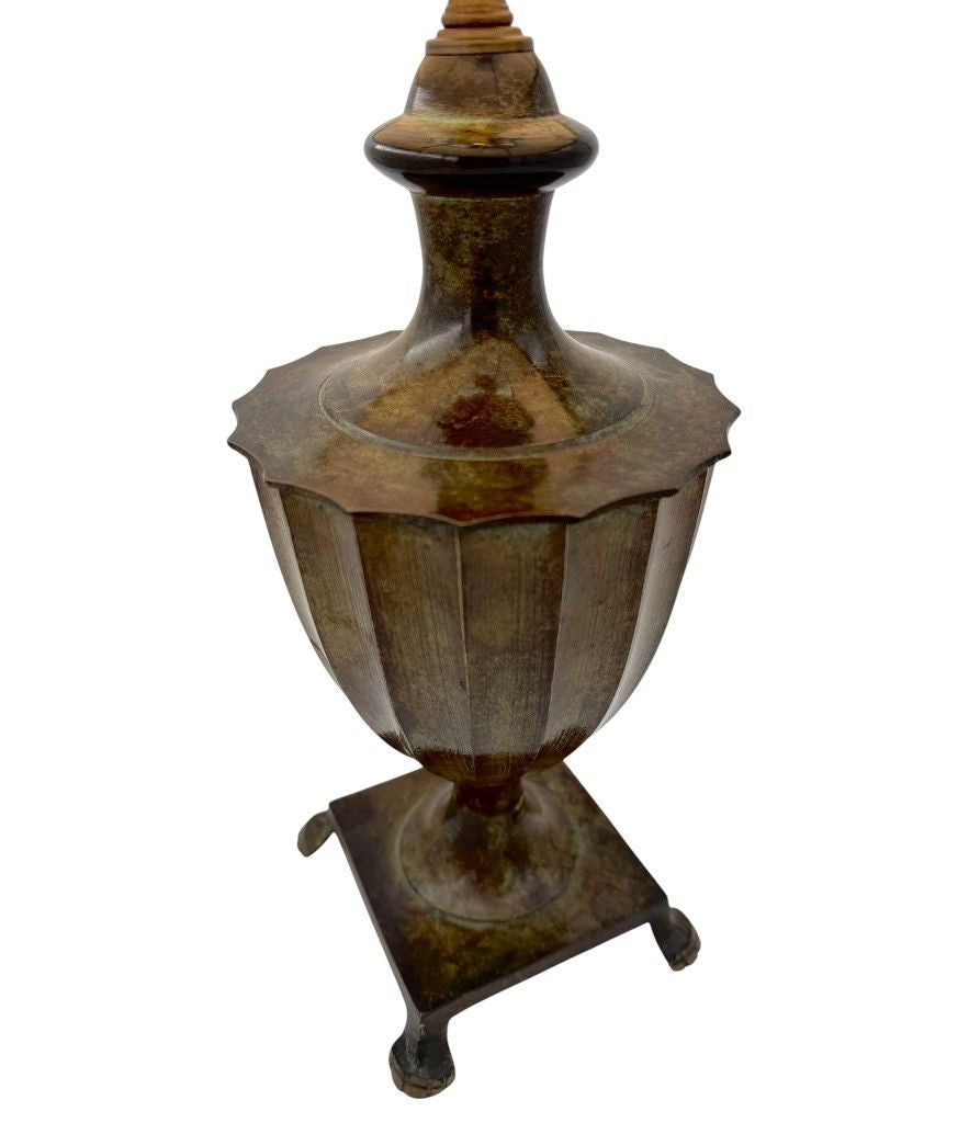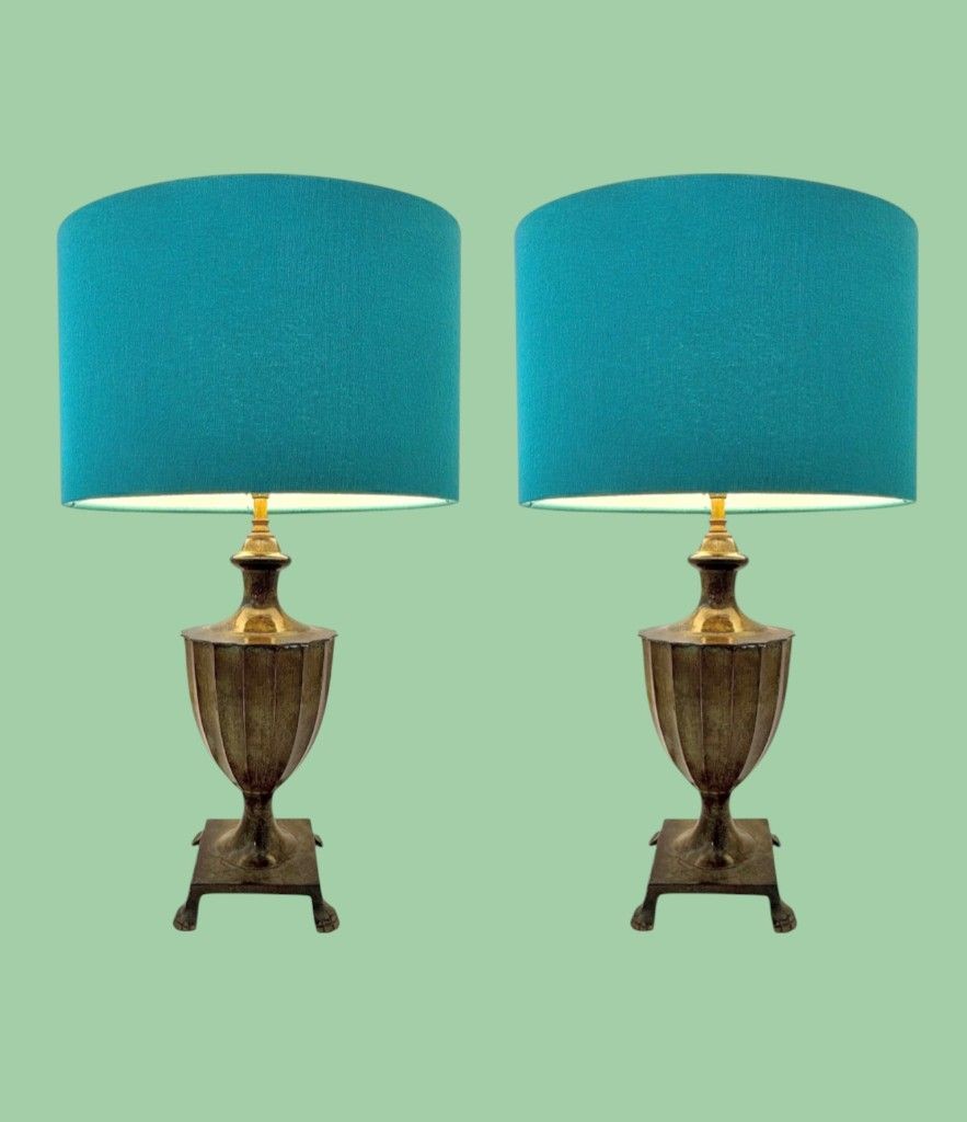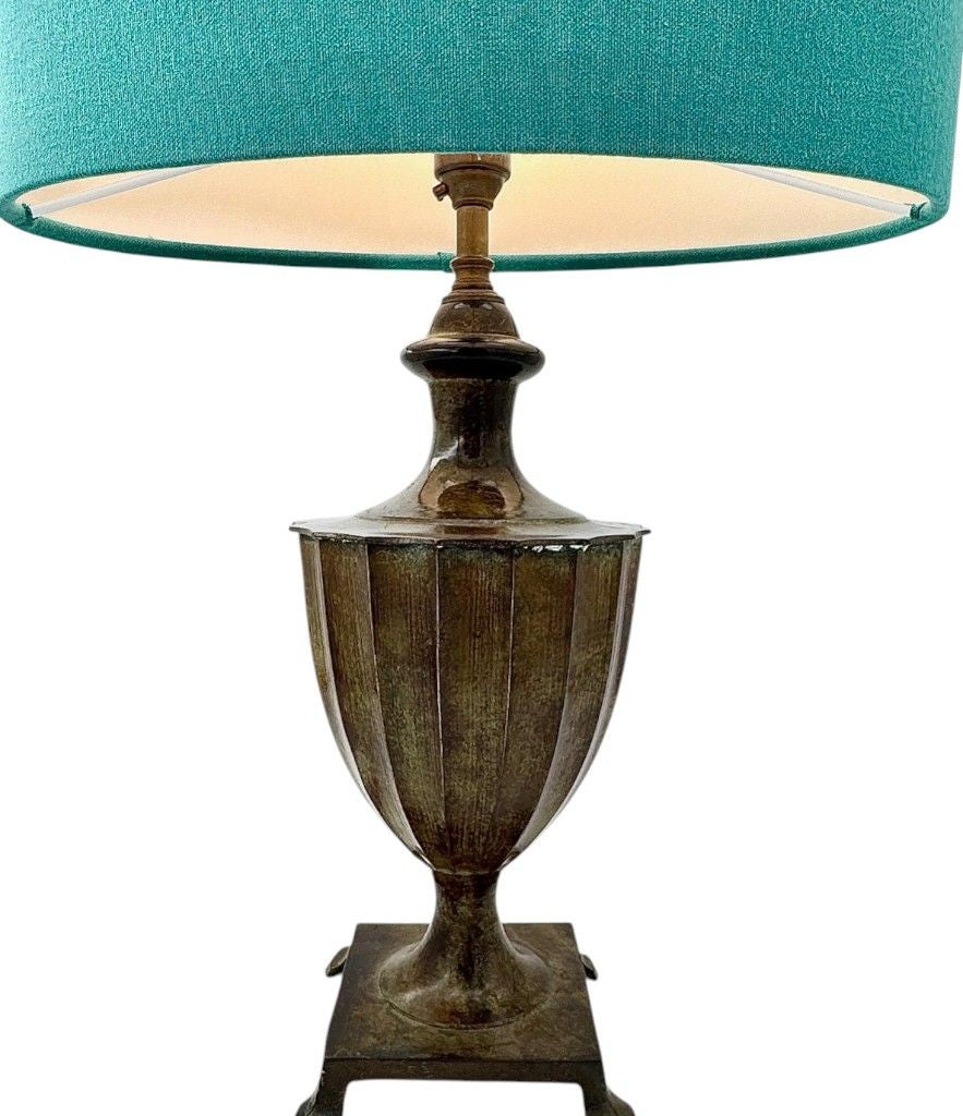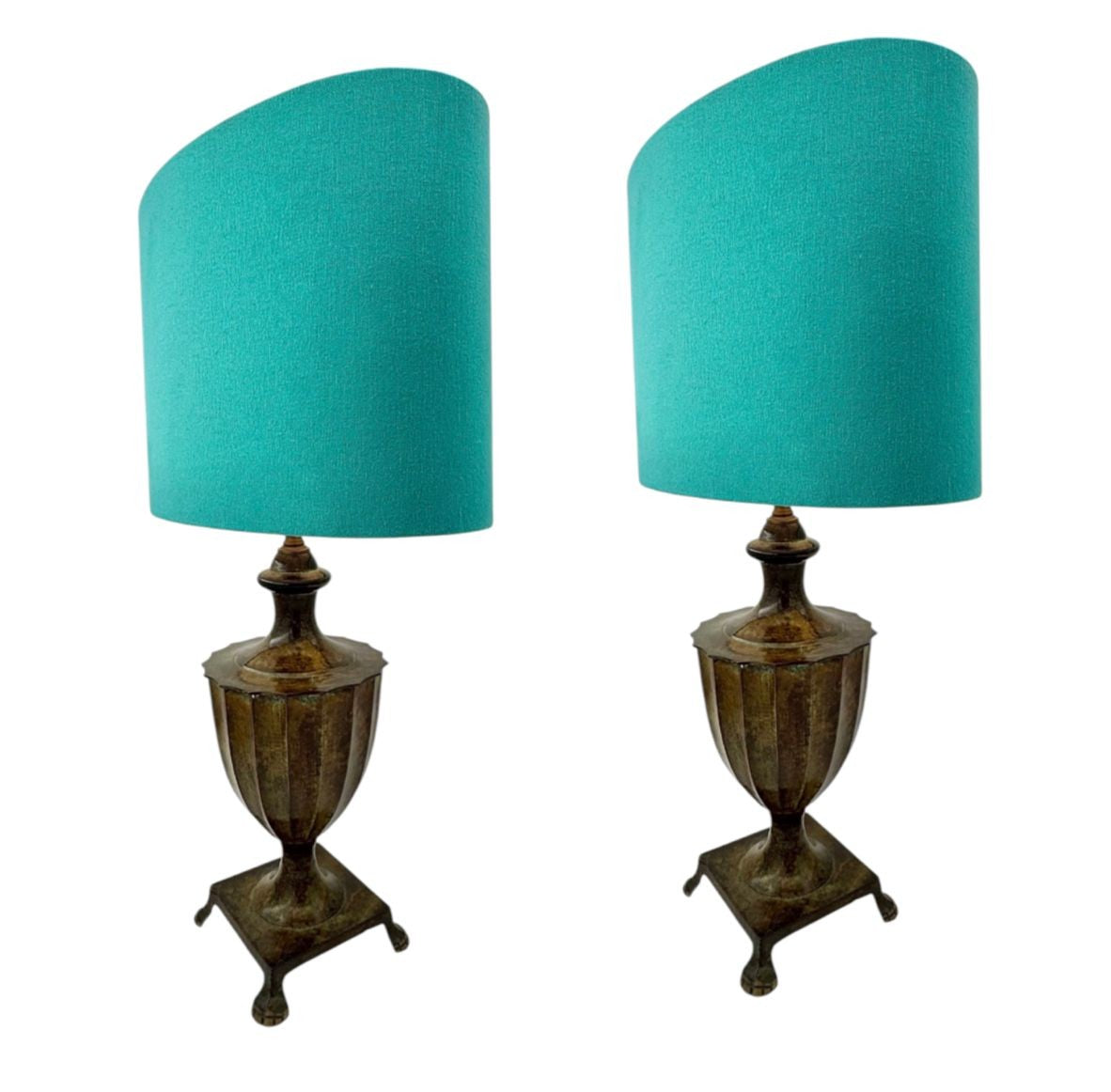 A pair of 1970s classical cast bronze lamps with verdigris finish. Each modelled as a classical urn mounted on square base with paw feet. Re wired with new brass fittings, antique gold cord flex and PAT tested. Dimensions without shades, shades not included but can be purchased separately. Contact for prices.
