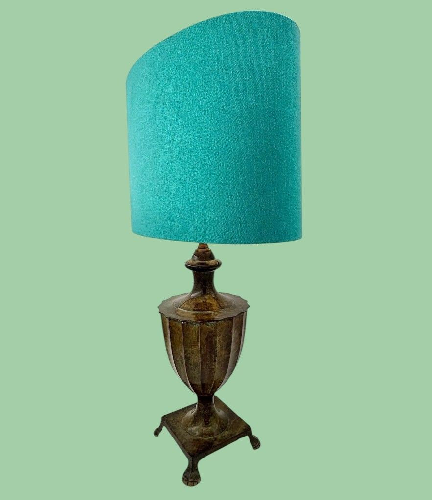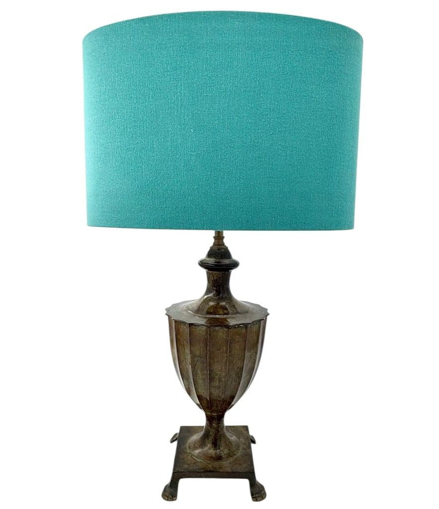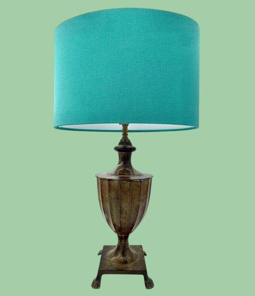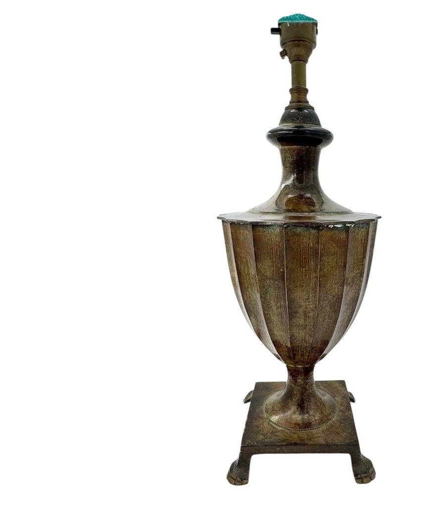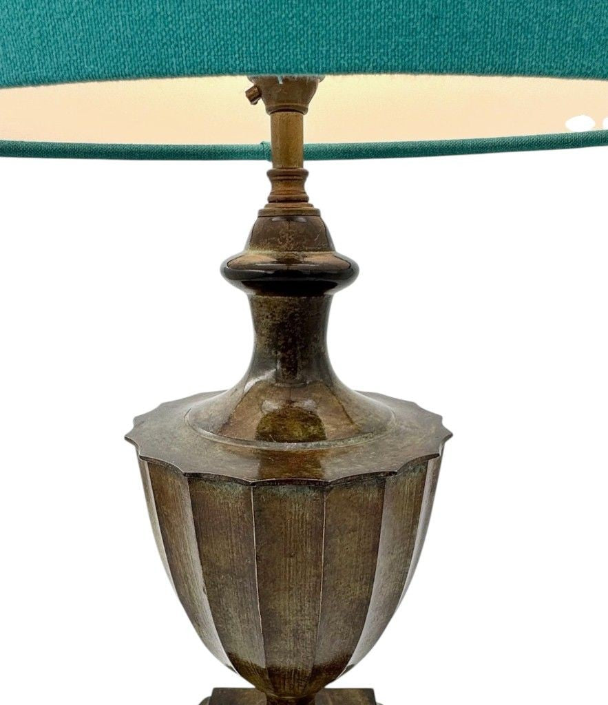A pair of 1970s classical cast bronze lamps with verdigris finish. Each modelled as a classical urn mounted on square base with paw feet. Re wired with new brass fittings, antique gold cord flex and PAT tested. Dimensions without shades, shades not included but can be purchased separately. Contact for prices.