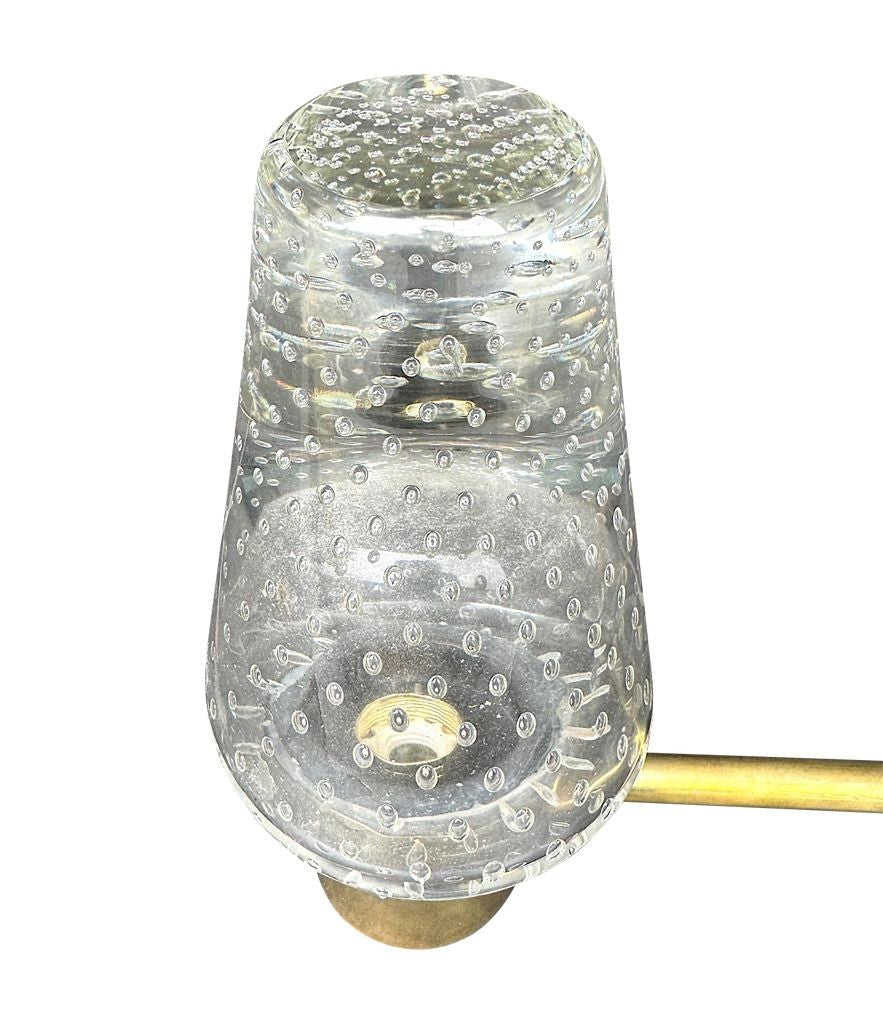With brass arm, wall bracket and collar holding the fittings over a hand blown Murano glass, bullicante bowl shade. Re wired with new brass fittings and PAT tested. Can be hung either way up.