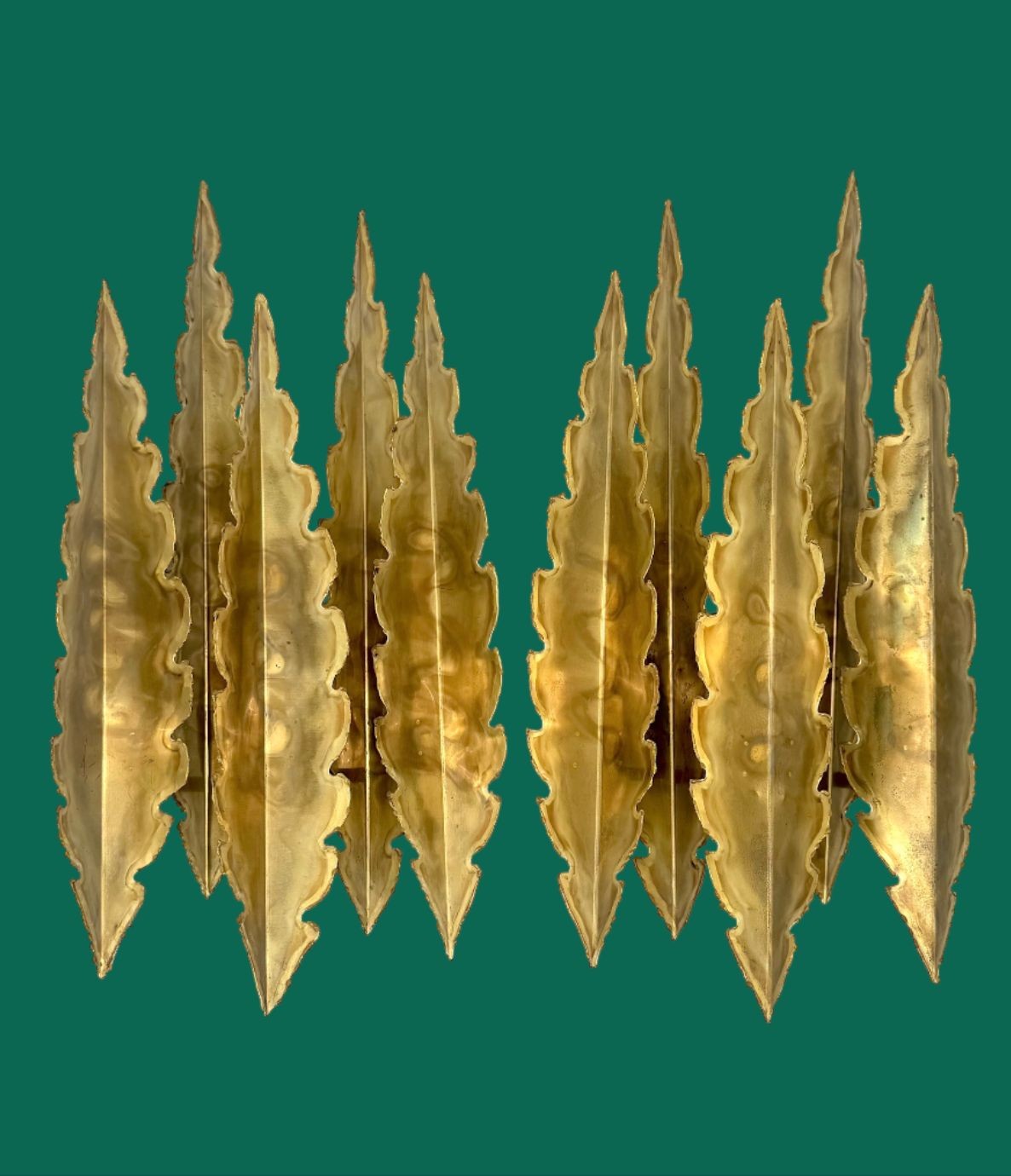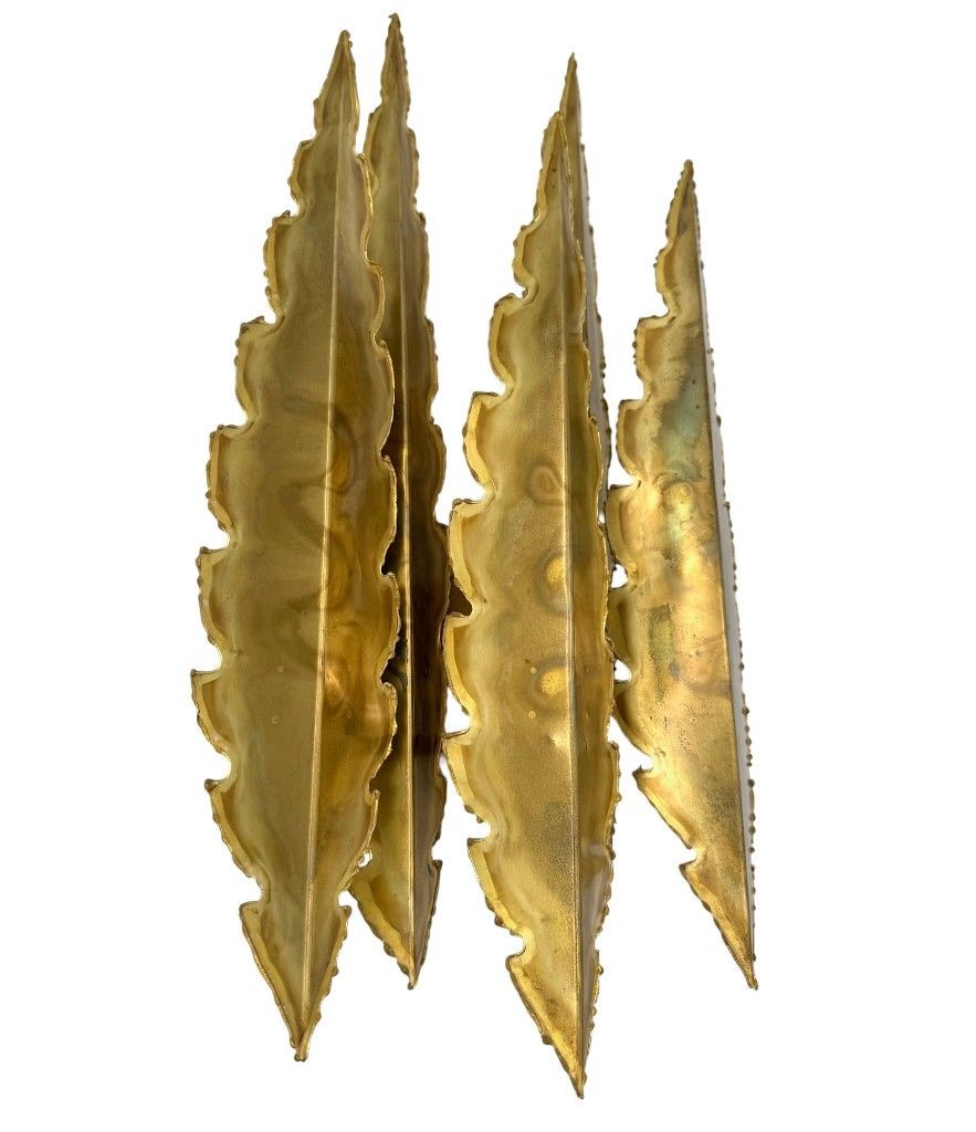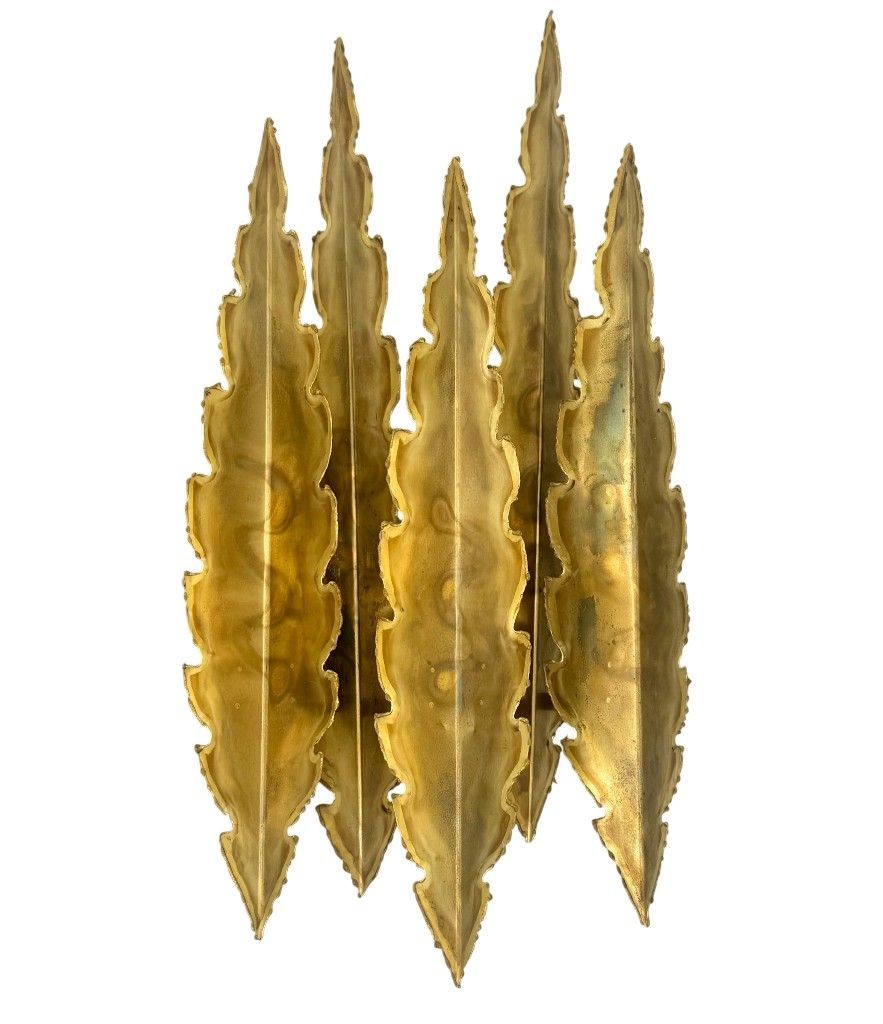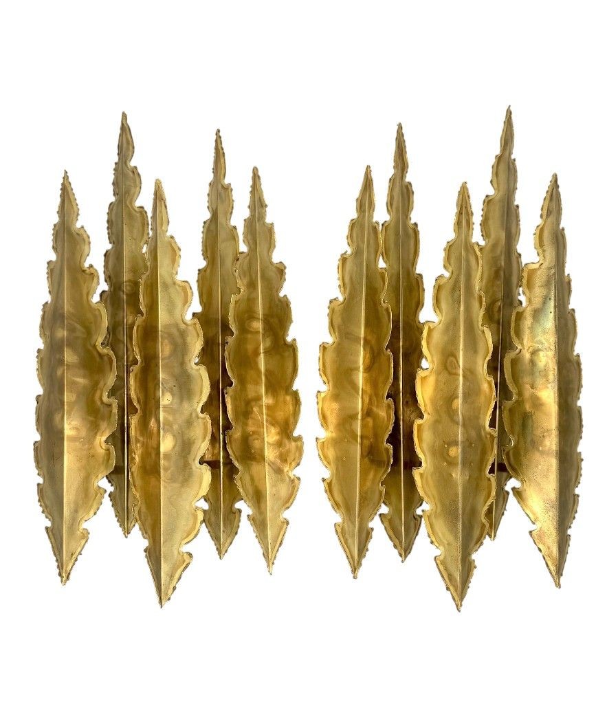 A pair of large 1960s 5 frond, torch cut brass wall sconces by Holm Sorensen. Each with three light fittings behind the brutalist fronds. Re wired with new brass fittings and PAT tested