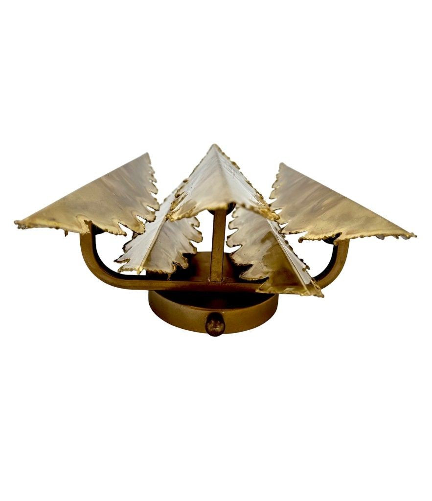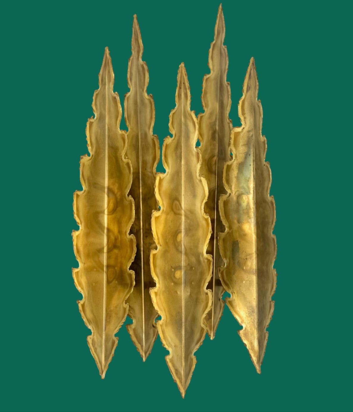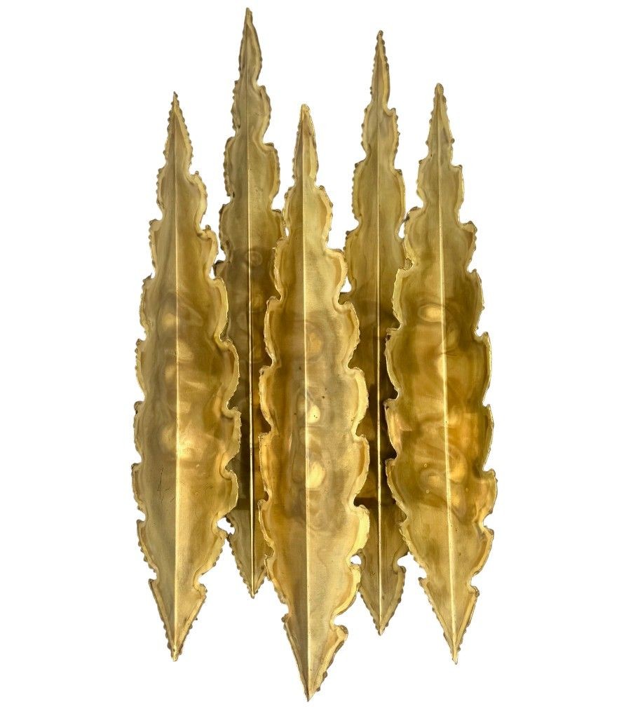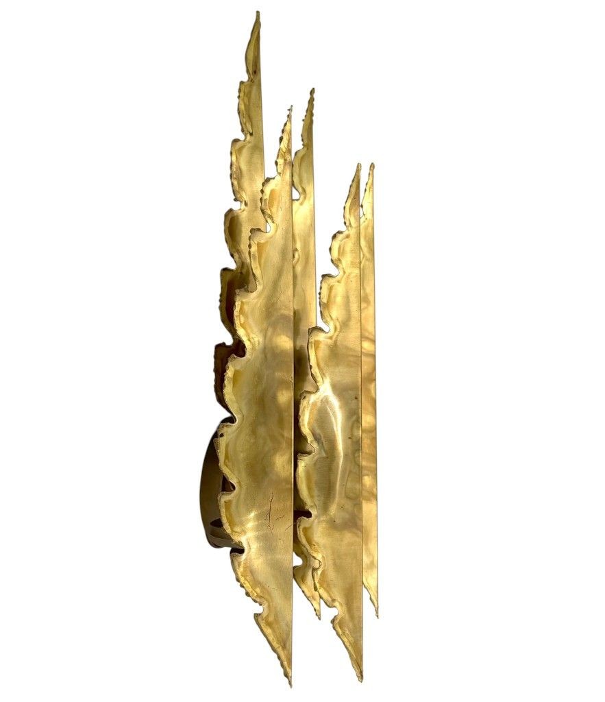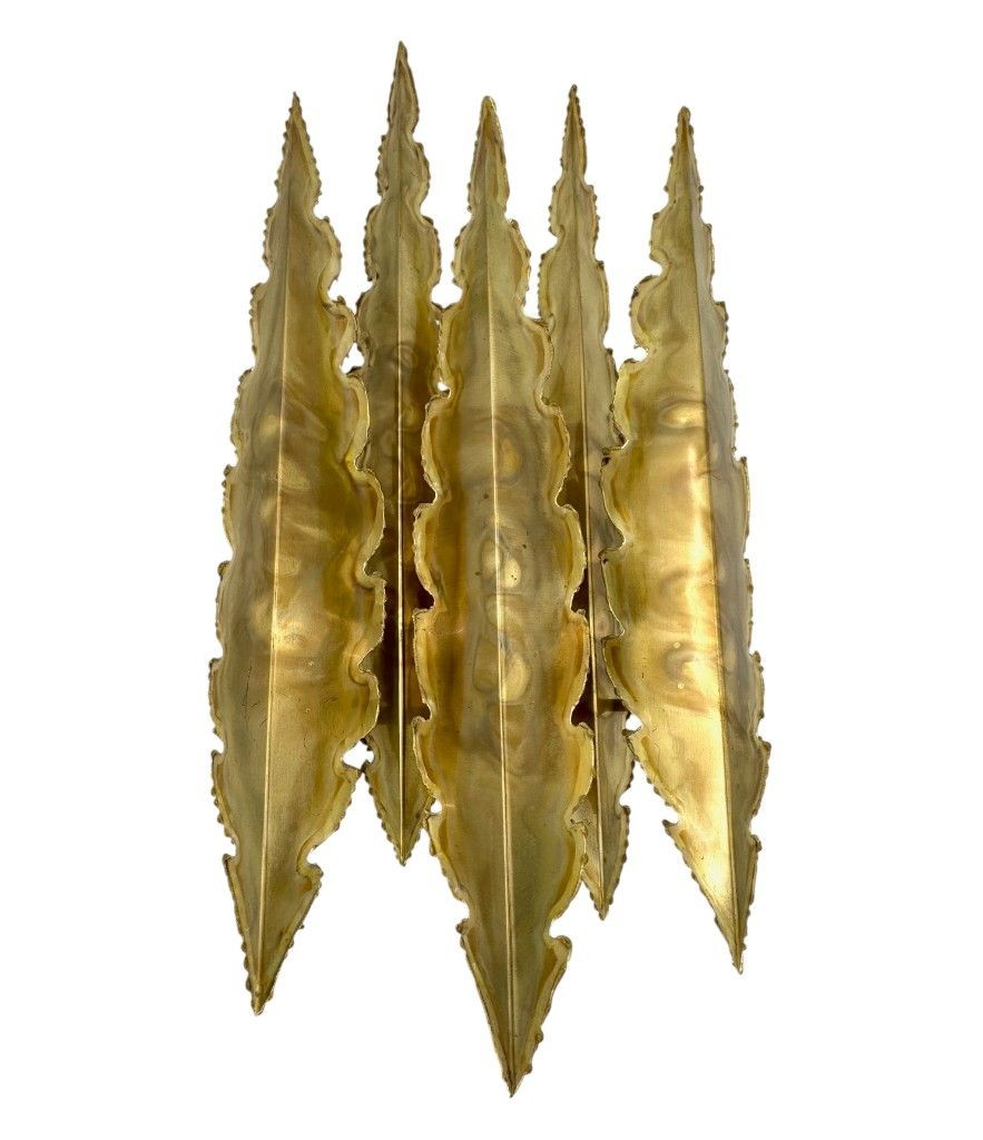 A pair of large 1960s 5 frond, torch cut brass wall sconces by Holm Sorensen. Each with three light fittings behind the brutalist fronds. Re wired with new brass fittings and PAT tested