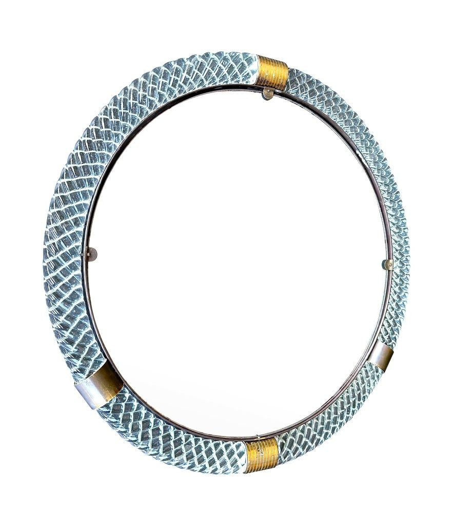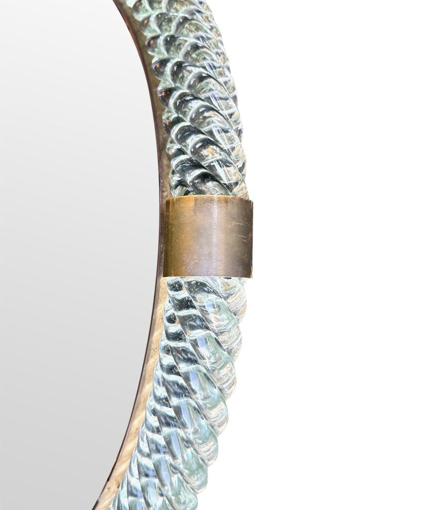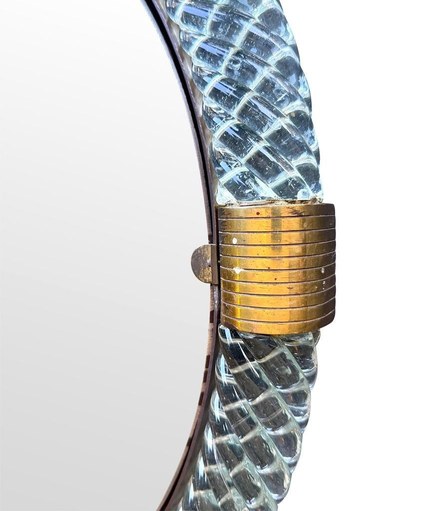 A wonderful large orignal 1940s circular Murano Torchon clear glass and brass mirror, with orignal mirror plate. There is some foxing on the mirrro plate around the edges and in the middle, consistent with age, and the foxing can be seen on the 10th photo.