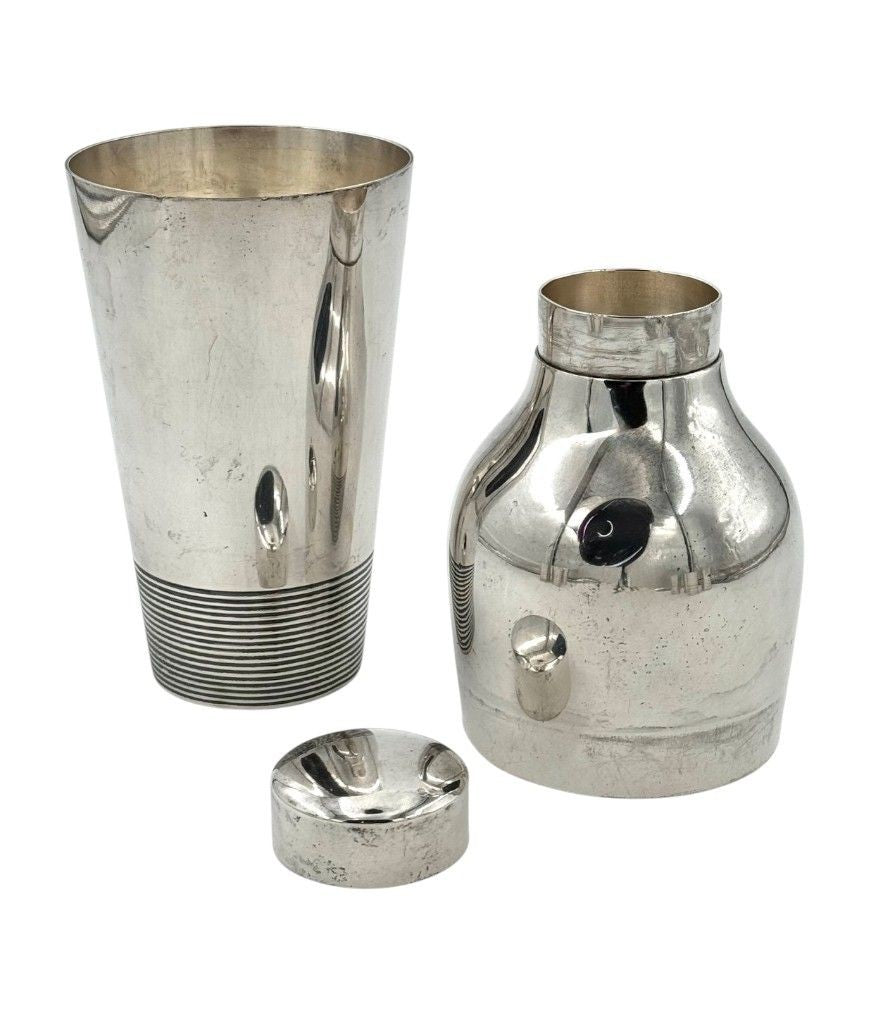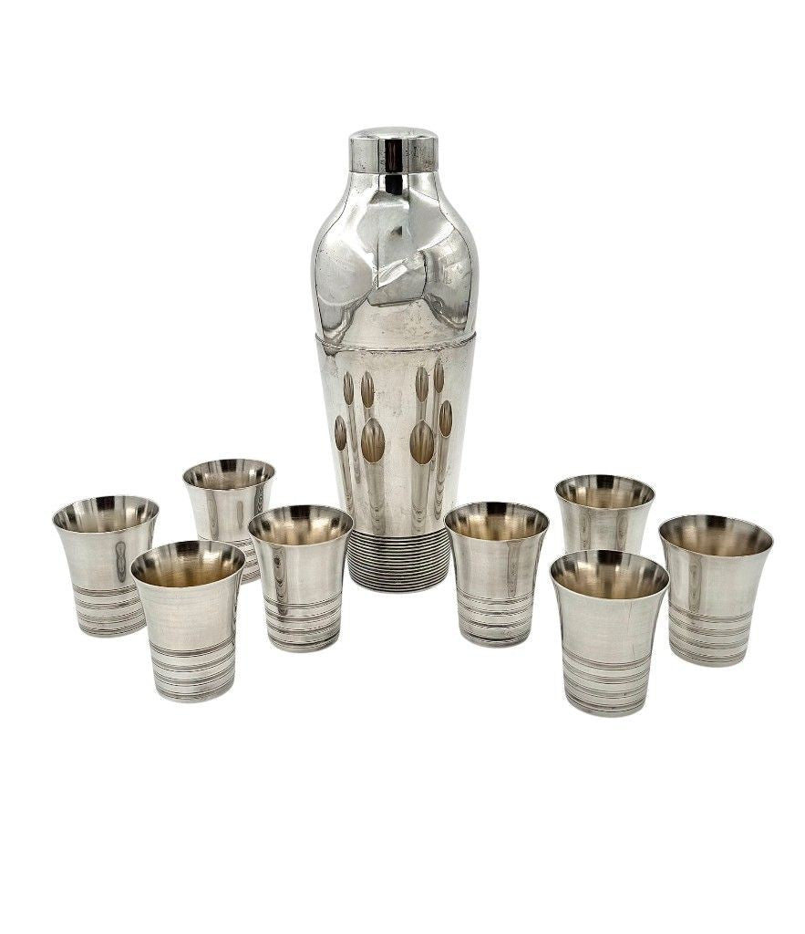 A 1930s Silver plated Art deco cocktail set with silver plated cocktail shaker and eight silver plated shot glasses