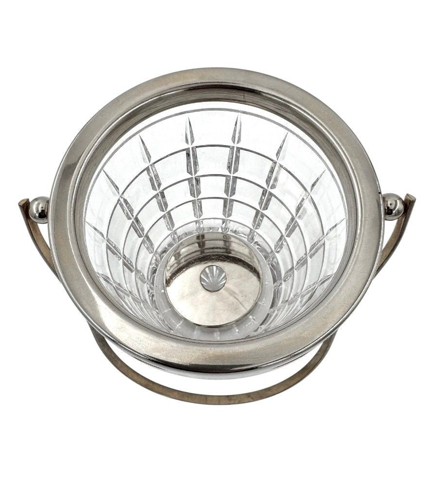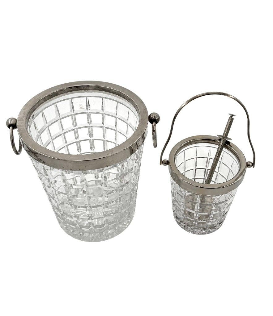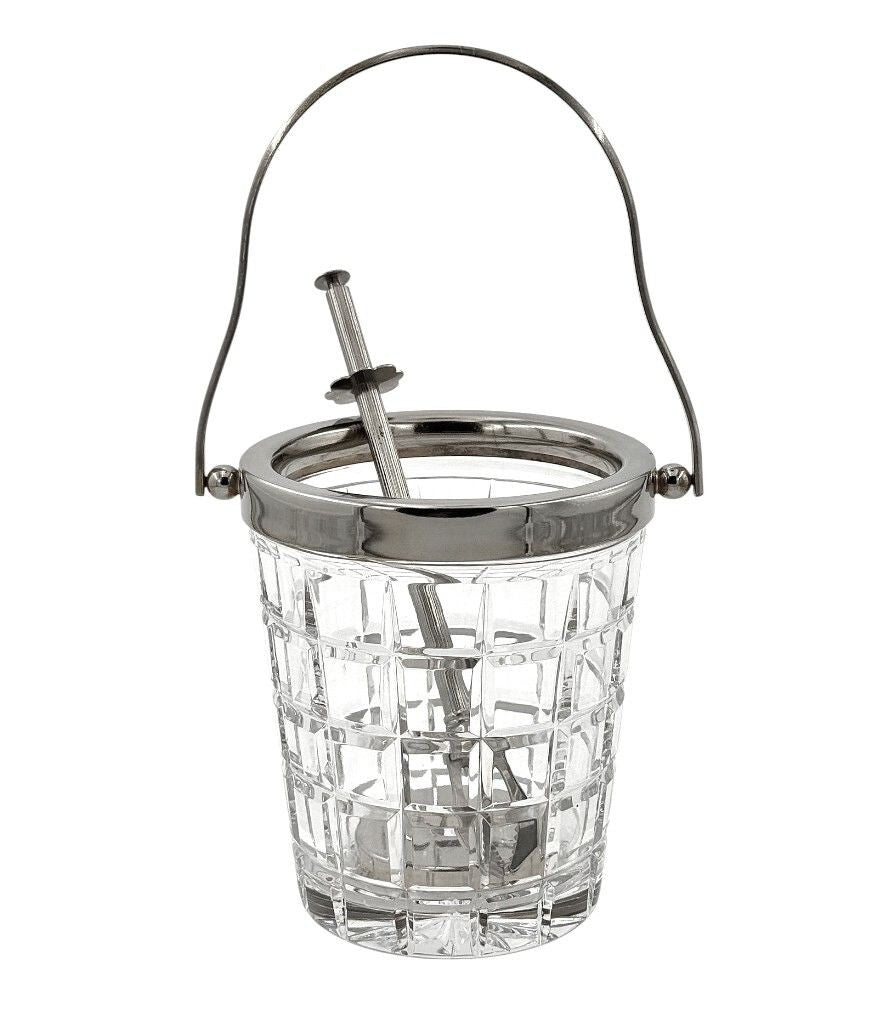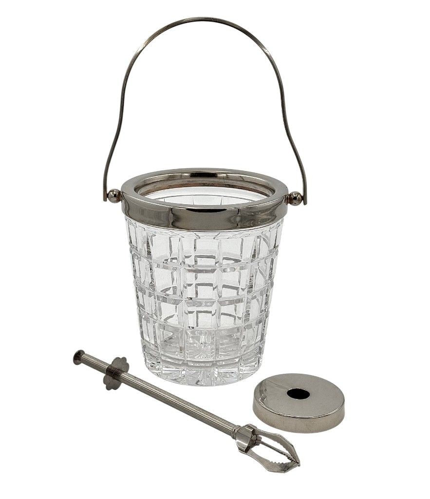 A 1960s Val Saint lambert crystal and silver plated ice bucket with handle ice grabbers and internal ice drip tray. There is a matching Champagne bucket under separate listing, not include but see last two photos.