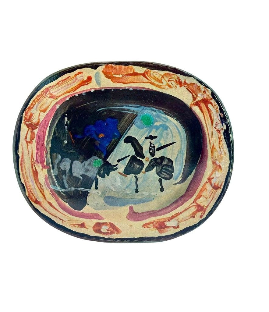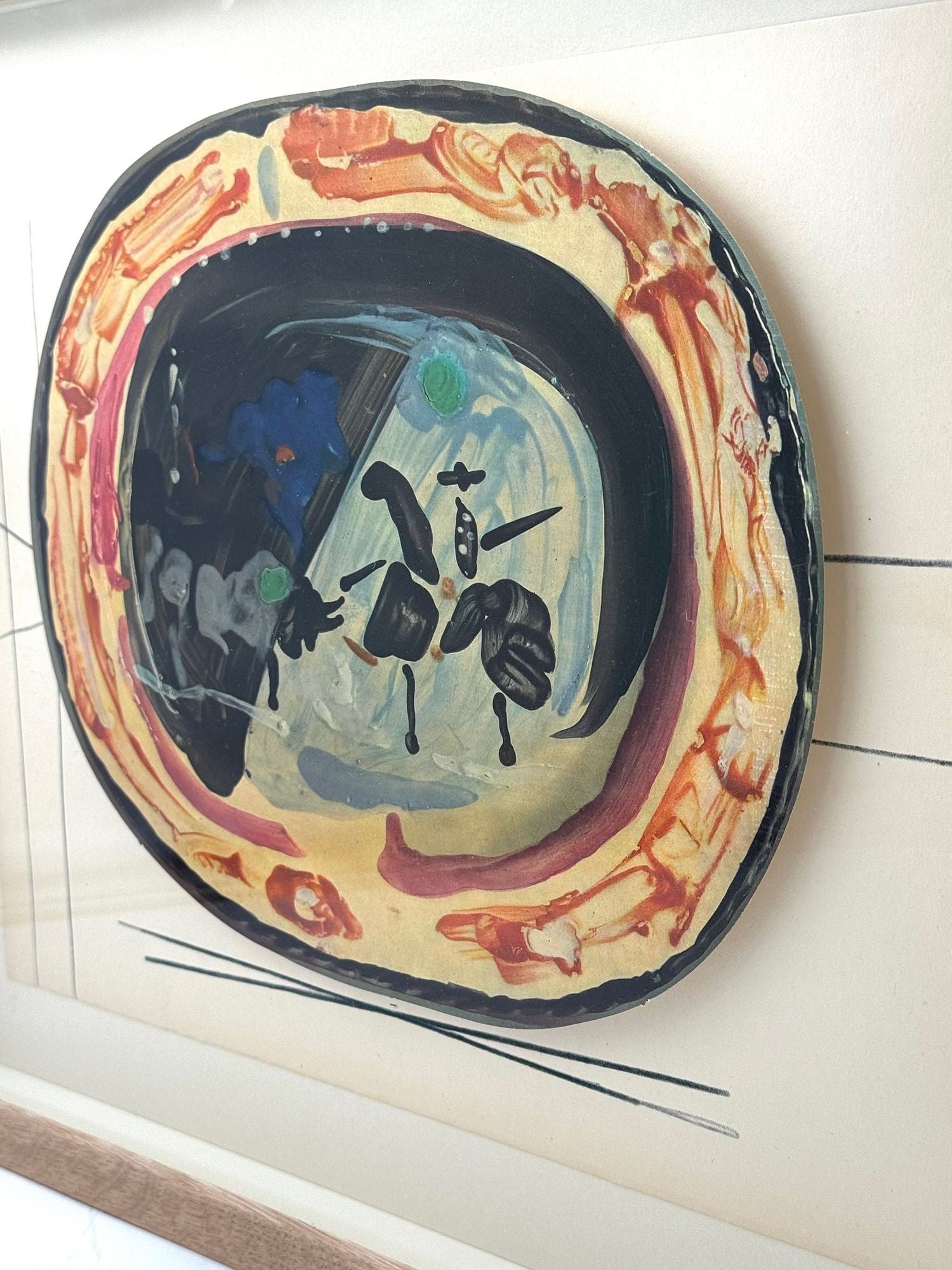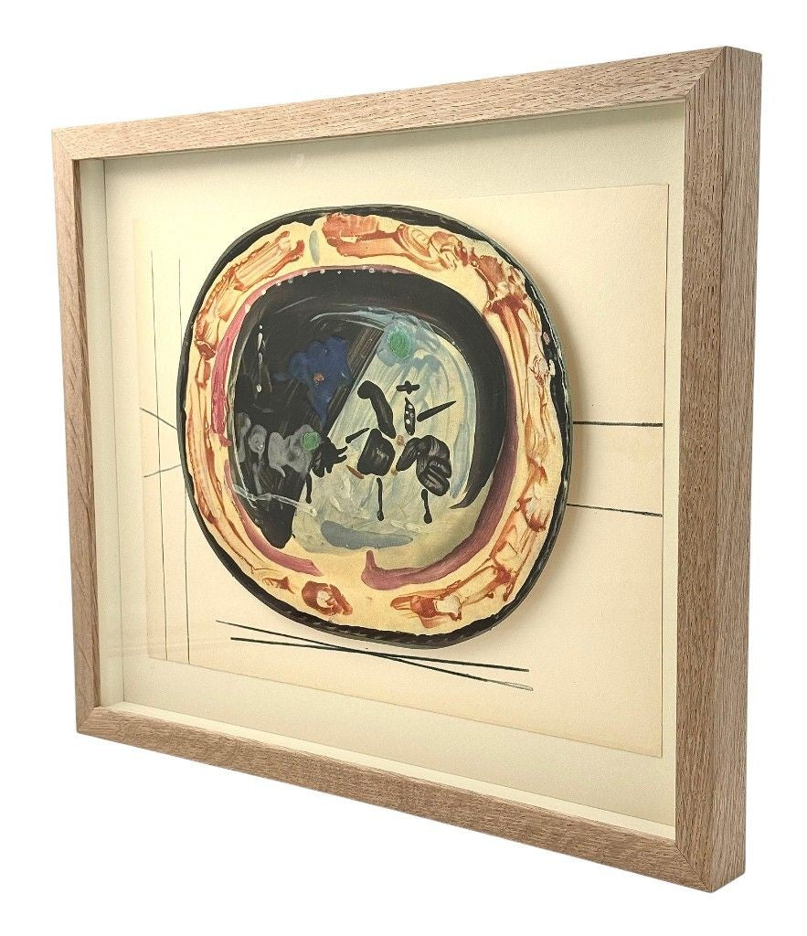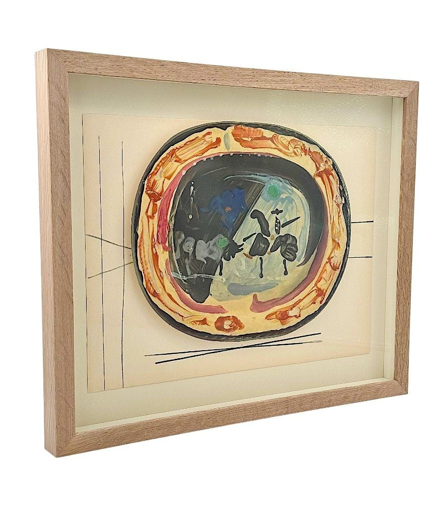 A framed lithographic plate from the 1948 Swedish, numbered limited edition portfolio of only 200  “Ceramiques de Picasso” by Albert Skira, framed, with the die-cut, gloss coloured lithograph of a ceramic plate with Picasso painting of a bull and picador. The “plate” is float mounted in natural oak box frame and glazed with UV protective art glass.