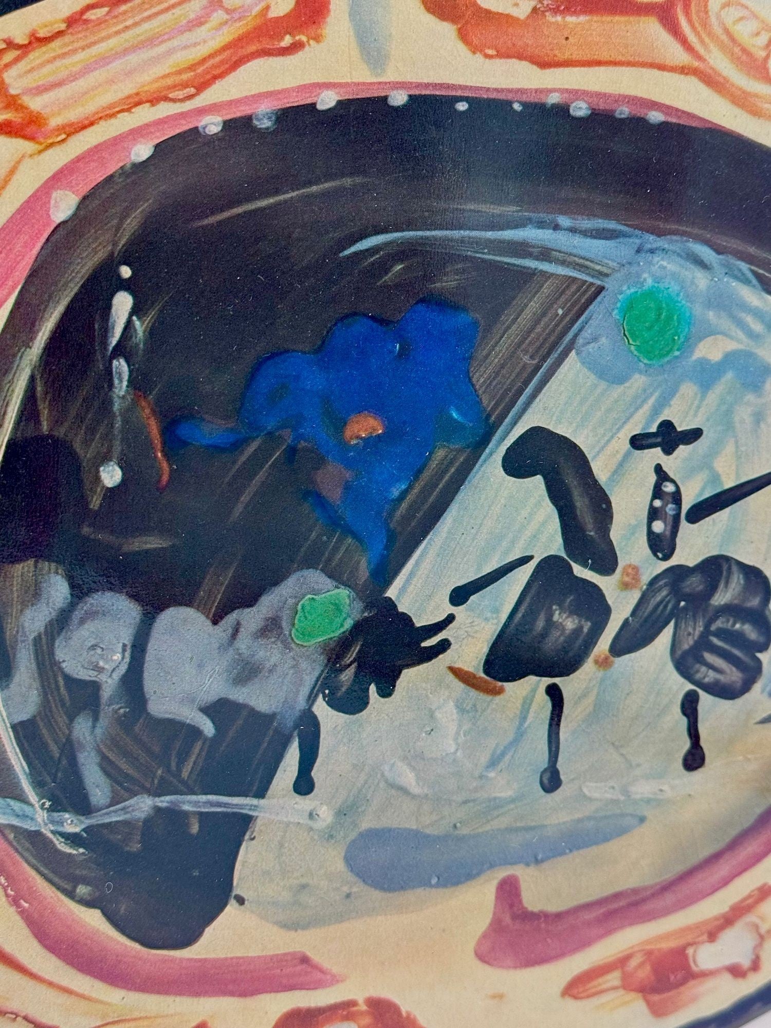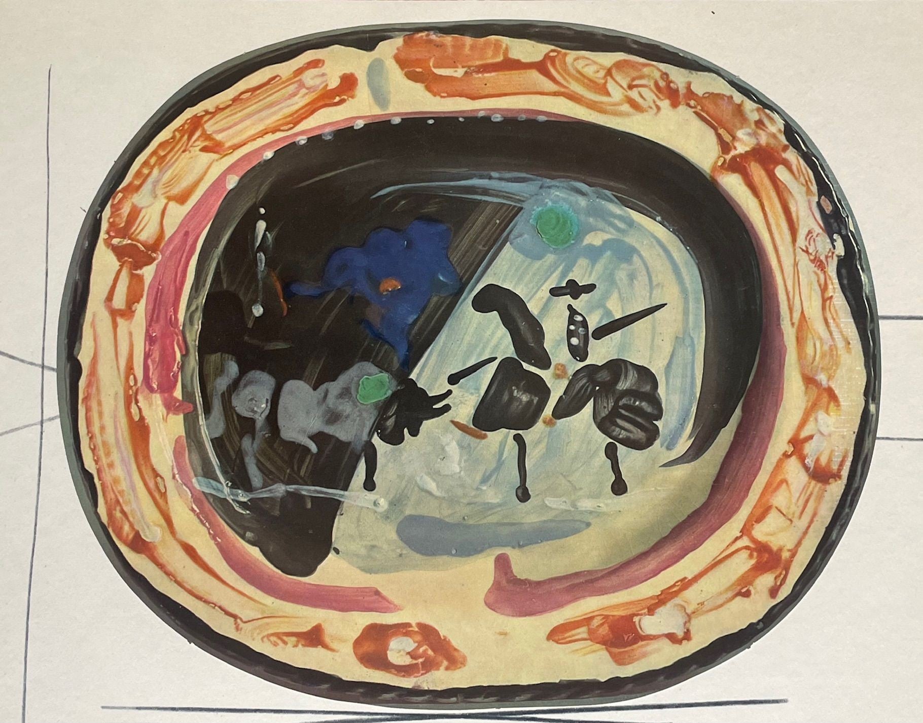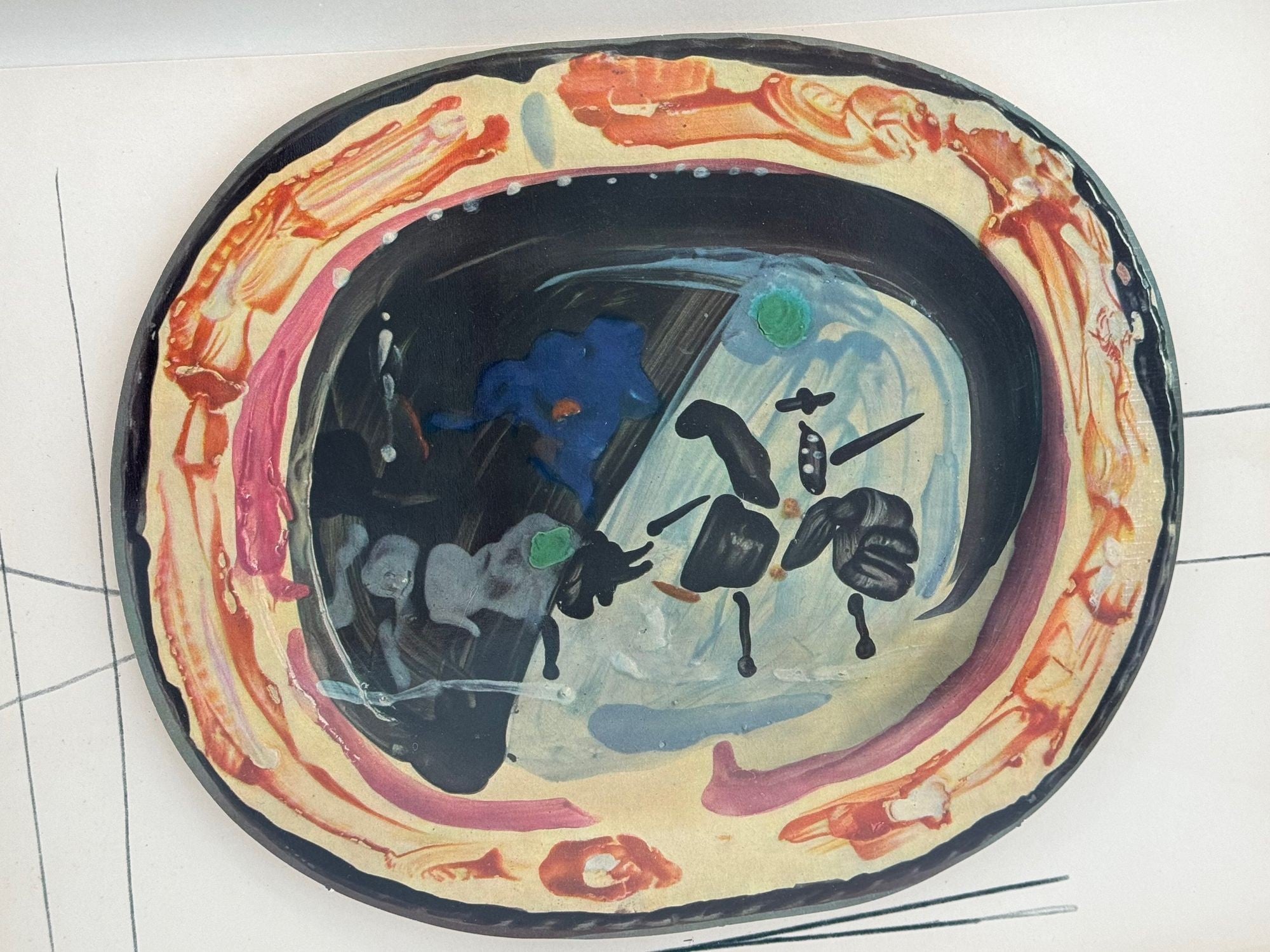 A framed lithographic plate from the 1948 Swedish, numbered limited edition portfolio of only 200  “Ceramiques de Picasso” by Albert Skira, framed, with the die-cut, gloss coloured lithograph of a ceramic plate with Picasso painting of a bull and picador. The “plate” is float mounted in natural oak box frame and glazed with UV protective art glass.