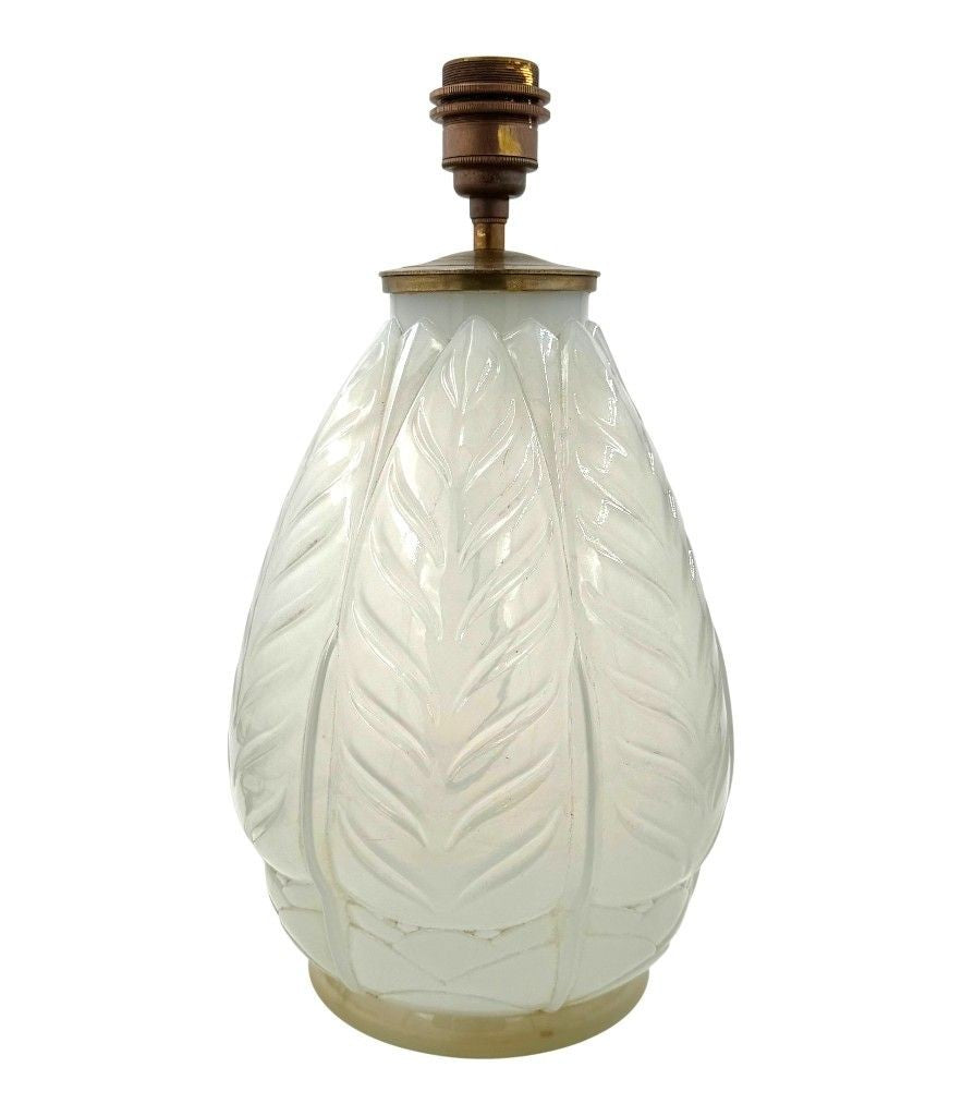 A French 1930s Cristallerie Lorraine Alsace pressed glass opaline lamp with leaf desgin