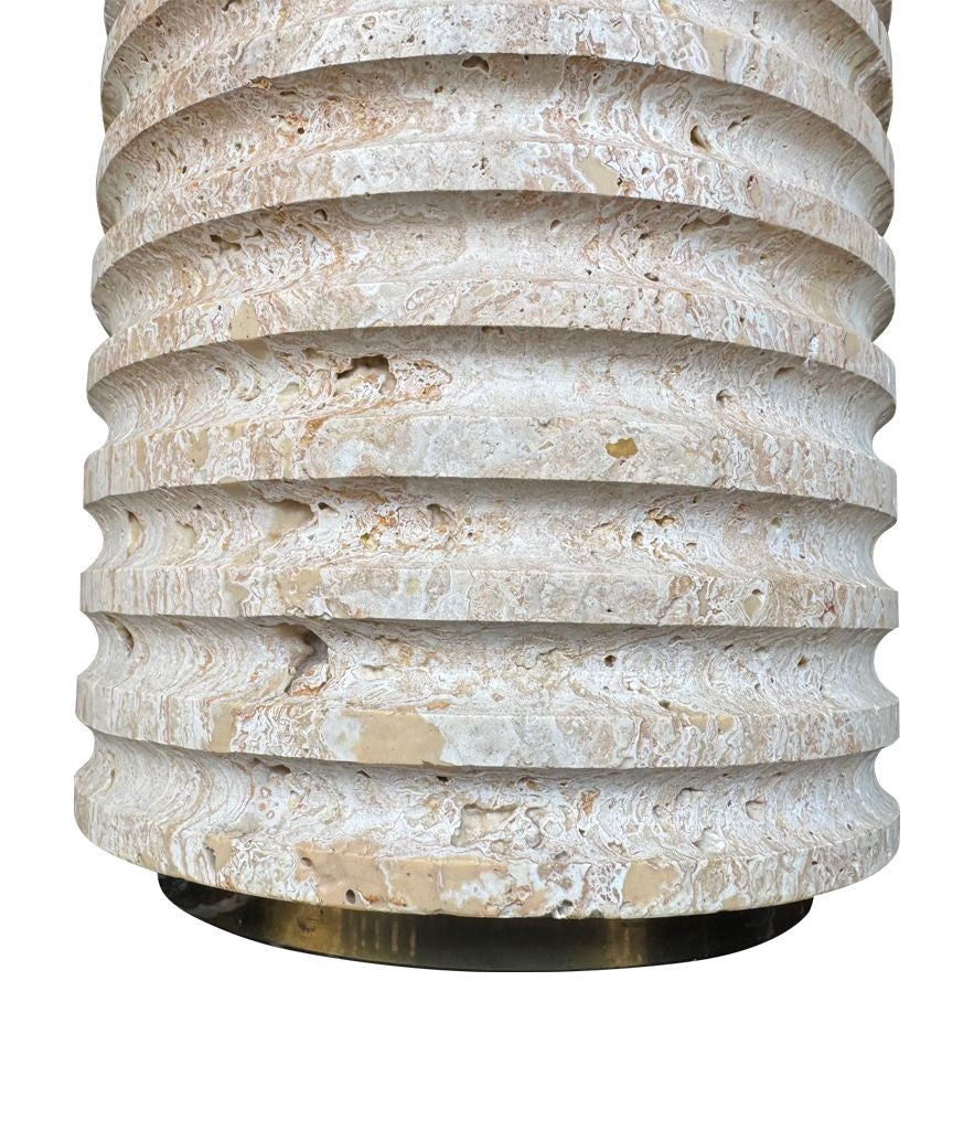 A large ribbed Italian 1970s travertine lamp by Fratelli Manneli, mounted on a brass base with brass detailed neck. Rewired with new brass fittings , antique cord flex and PAT tested. Shade not included, dimensions without shade 40cm high x 20cm diameter