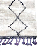 A large good quality handmade Morrocan Beni Ourain wool rug with tribal diamond and line pattern, in black and white handwoven wool by the Beni Ouarian tribe. A wonderful geometric design with purple woven wool tassels on each end.