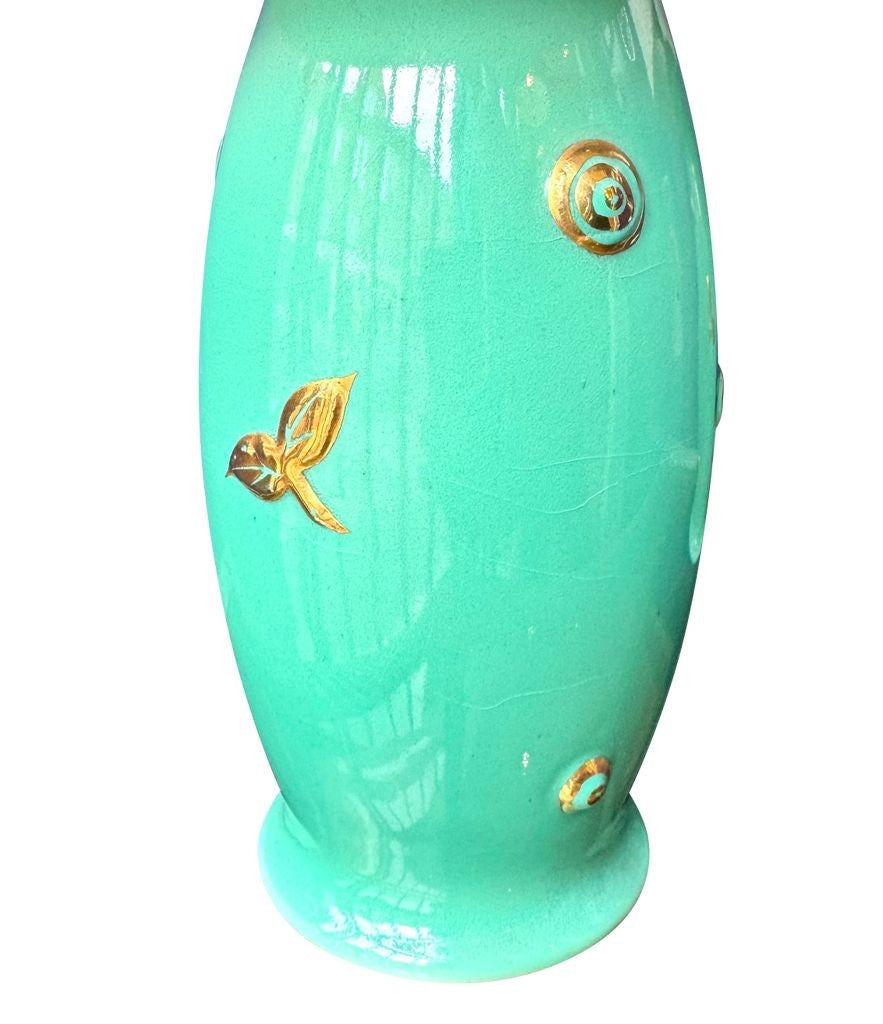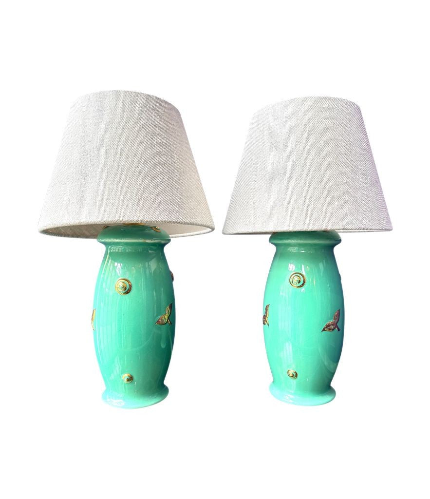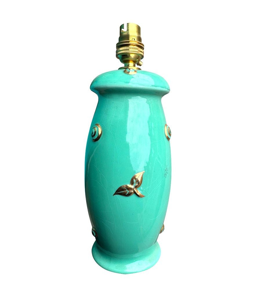 A lovely pair of 1930s Royal Staffordshire lamps by Clarice Cliff in vibrant green with gilt leaf and spiral detail design. Stamped on the base "Royal Staffordshire by Clarice Cliff, Made In England" Re wired with new brass fittings, antique gold cord flex and PAT tested. With new bespoke natural linen shades.