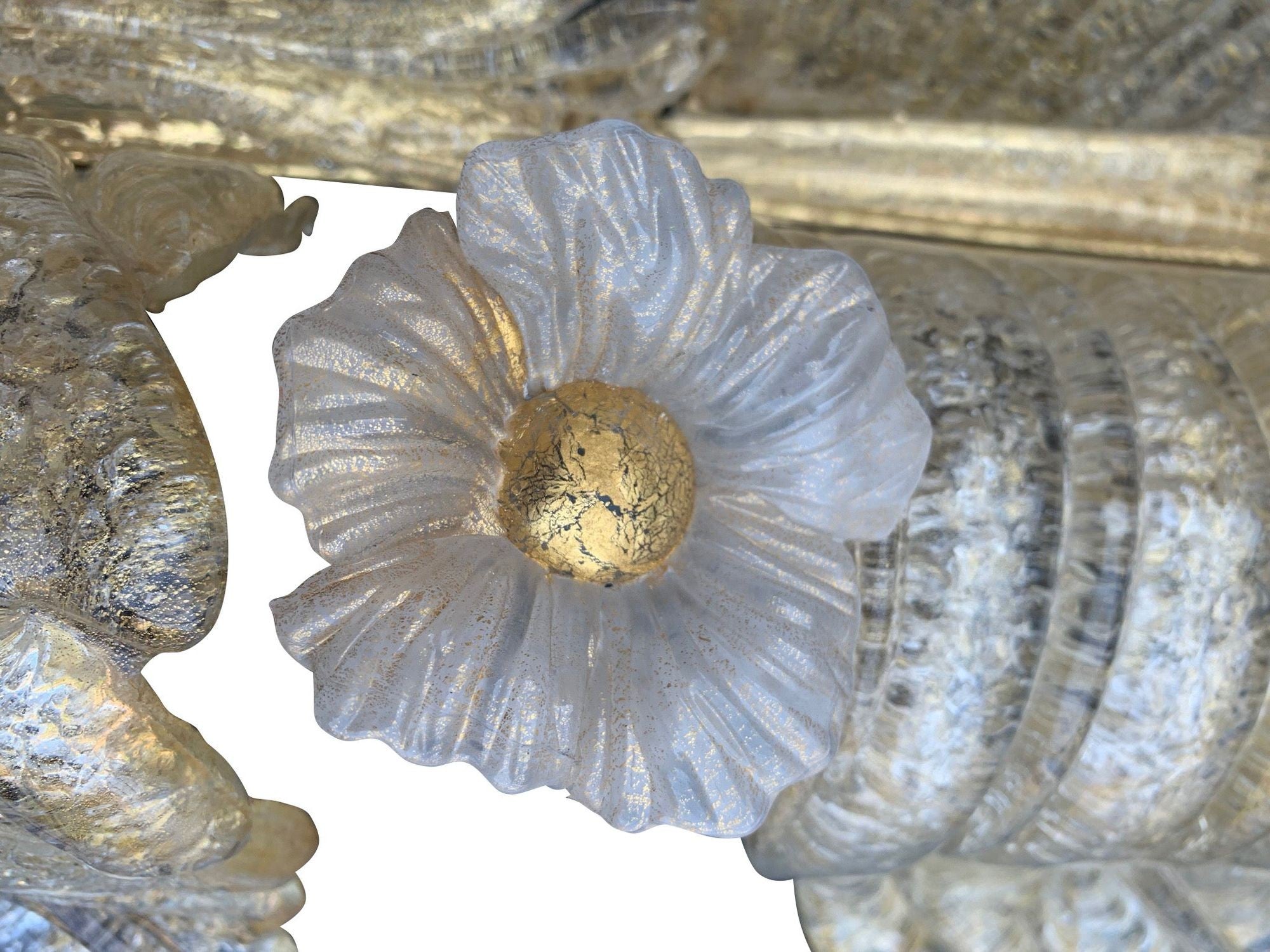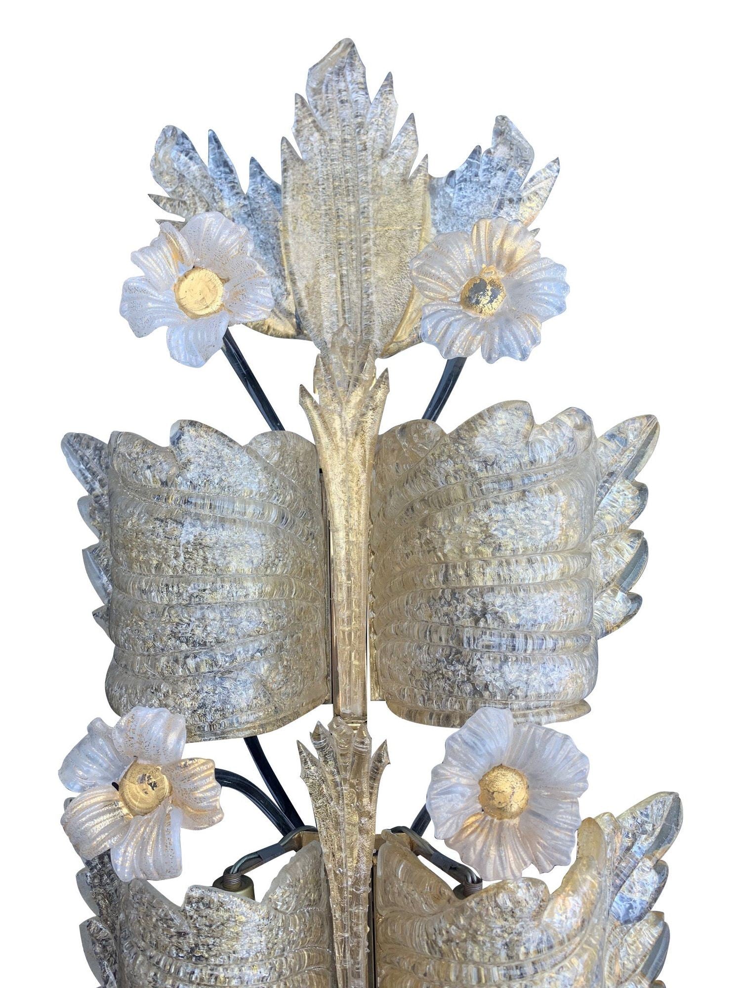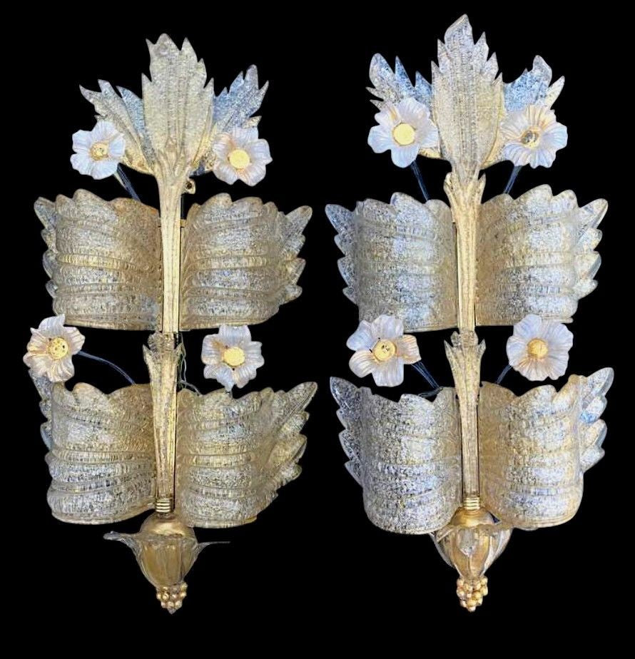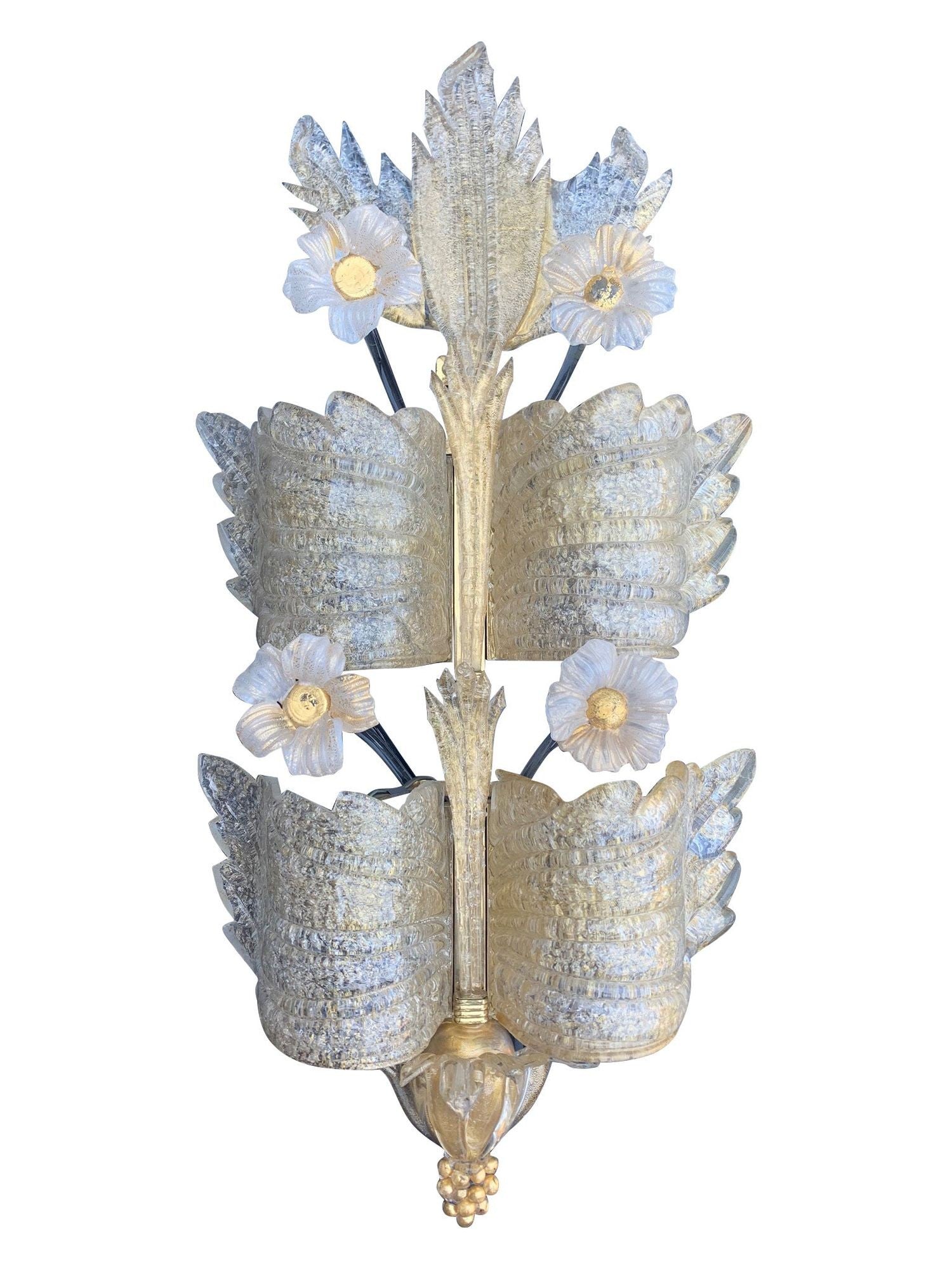 A stunning pair of large, original 1930s gold leaf "champagne" glass wall scones by Seguso. Each sconces has 6 curved Murano glass leaves that surround 6 bulbs beneath, mounted on a solid brass bracket. Three slim central glass leaves and four Murano glass flowers run up the middle towards a large crowning glass leaf and a decorative lower glass finial with bunch of grapes design in gold leaf, all of which slip into the brass collars on the bracket. Re wired with new brass fittings and PAT tested