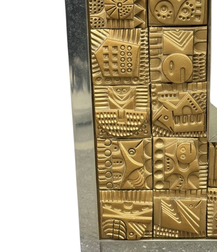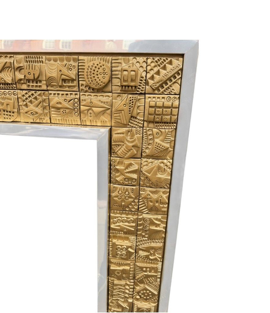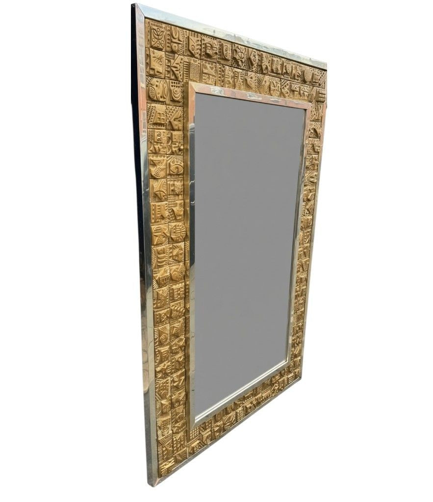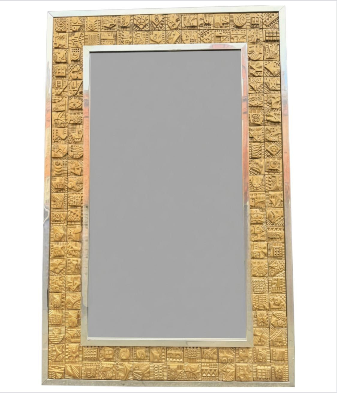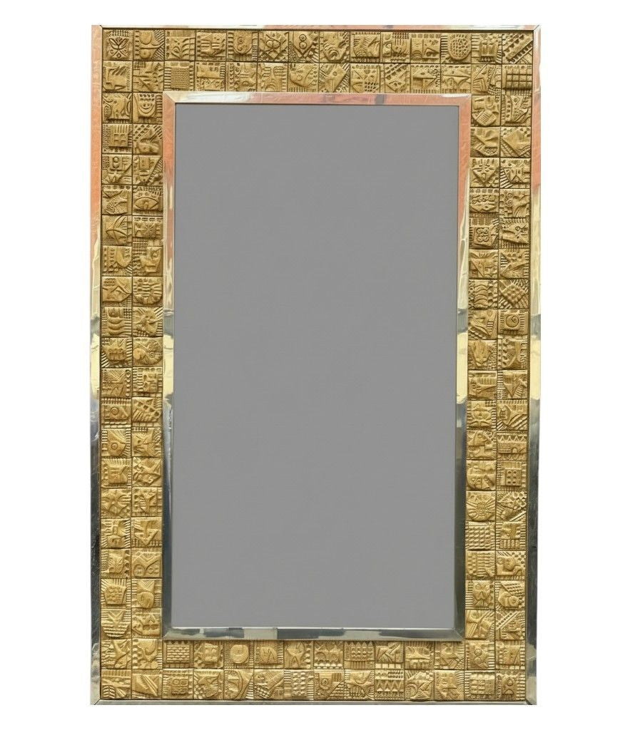 A unique 1960s handmade tiled mirror by English artist Ron Hitchins, with 128 totally unique handmade, sculptured terracotta tiles, each with his wonderful aztec style design and finish in gold colour. One of the tiles is signed "Ron Hitchins" and on the reverse is signed by the artist " An Original work of art, each tile individually hand sculptured bottom right hand tile signed Ron Hitchins"