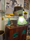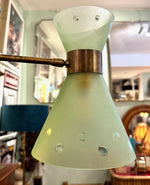 An Italian 1950s Stilnovo style brass and glass telescopic reading wall light. The green glass shade has a circle design pattern. Re wired with new brass fittings. The solid brass arm extends from 70cm to 110cm then the glass shade is 22cm high x 16cm diameter