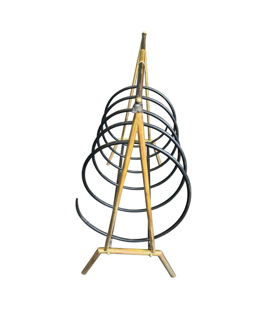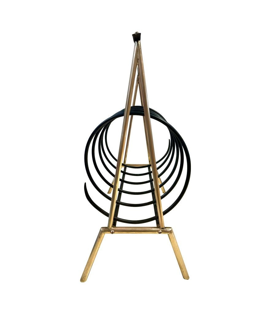 An unusual 1950s Mid century brass and black lacquered spiral magazine rack