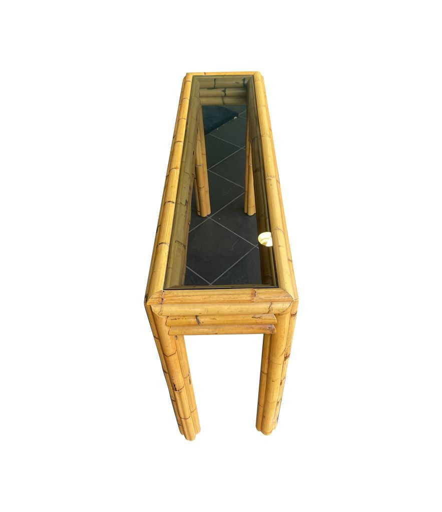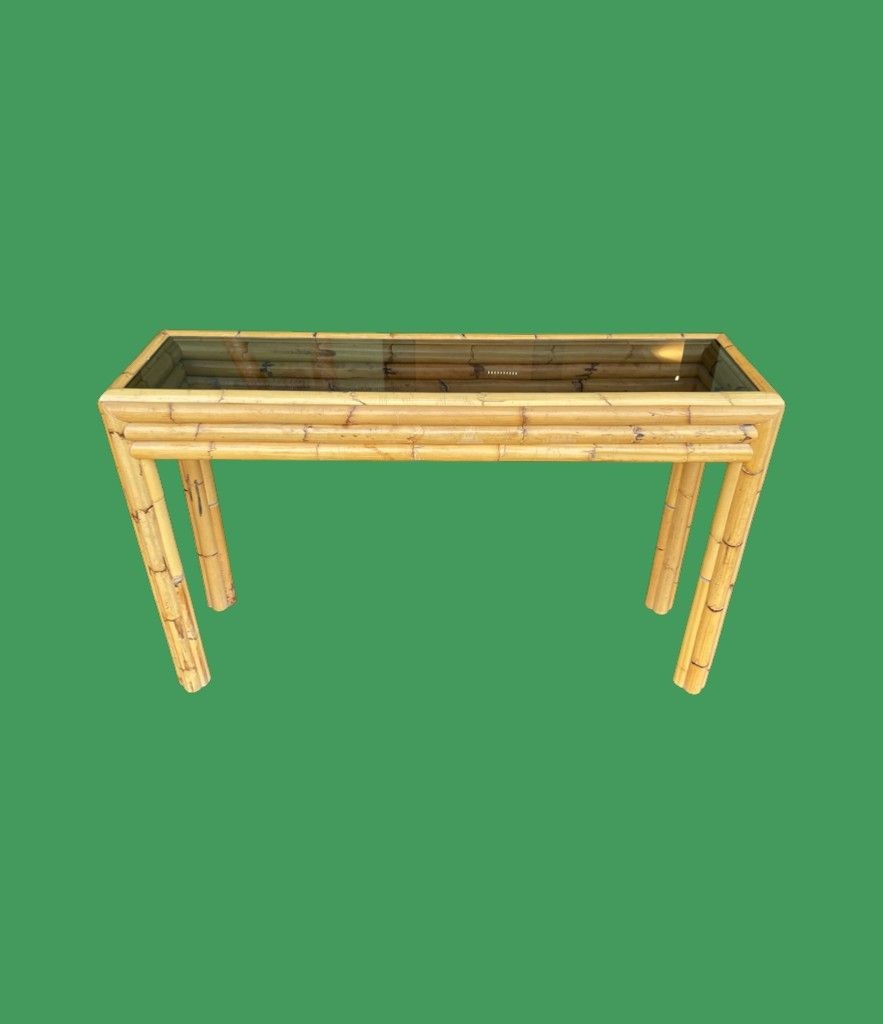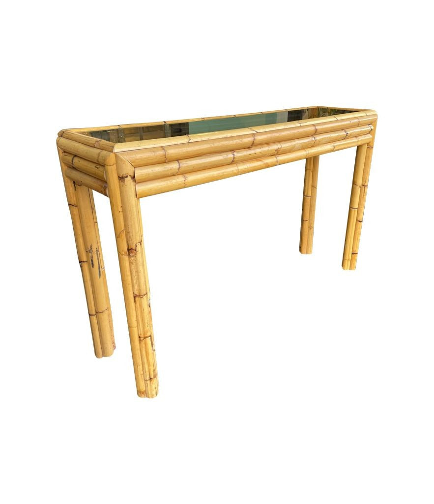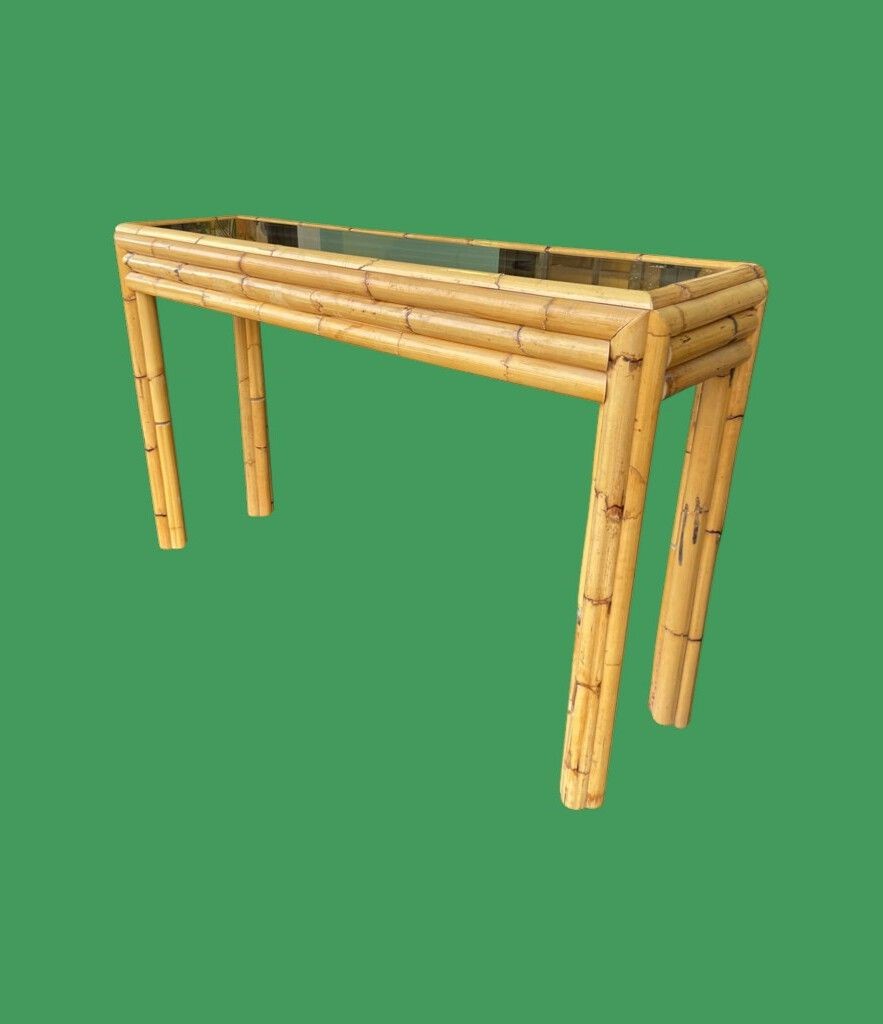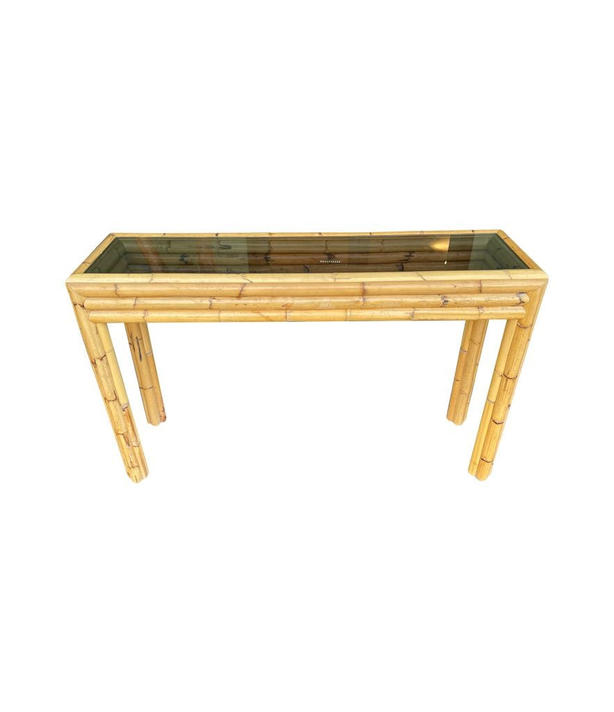 An Italian 1970s chunky bamboo console table attributed to Vivai Del Sud with orignal smoked glass top
