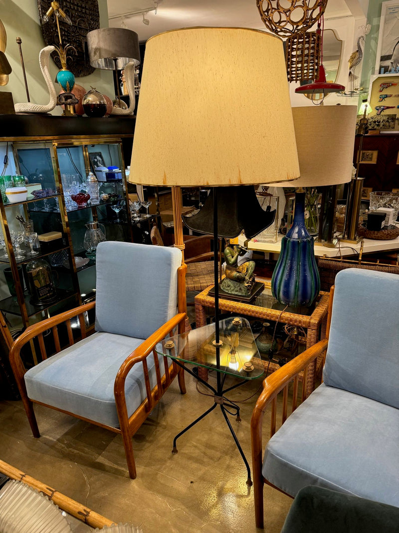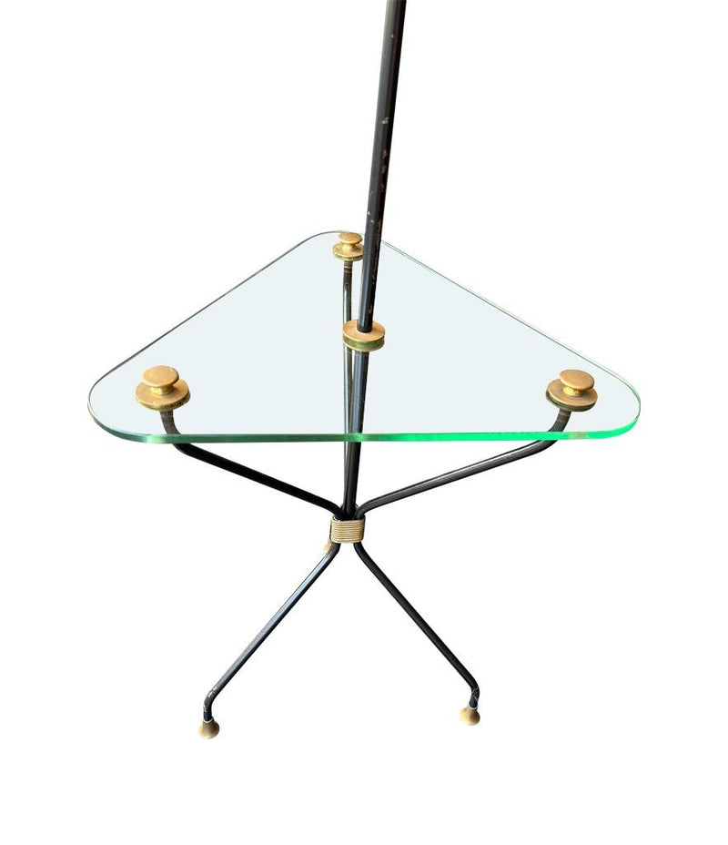 A 1950s French black lacquer and brass tripod floor lamp with glass centre table
