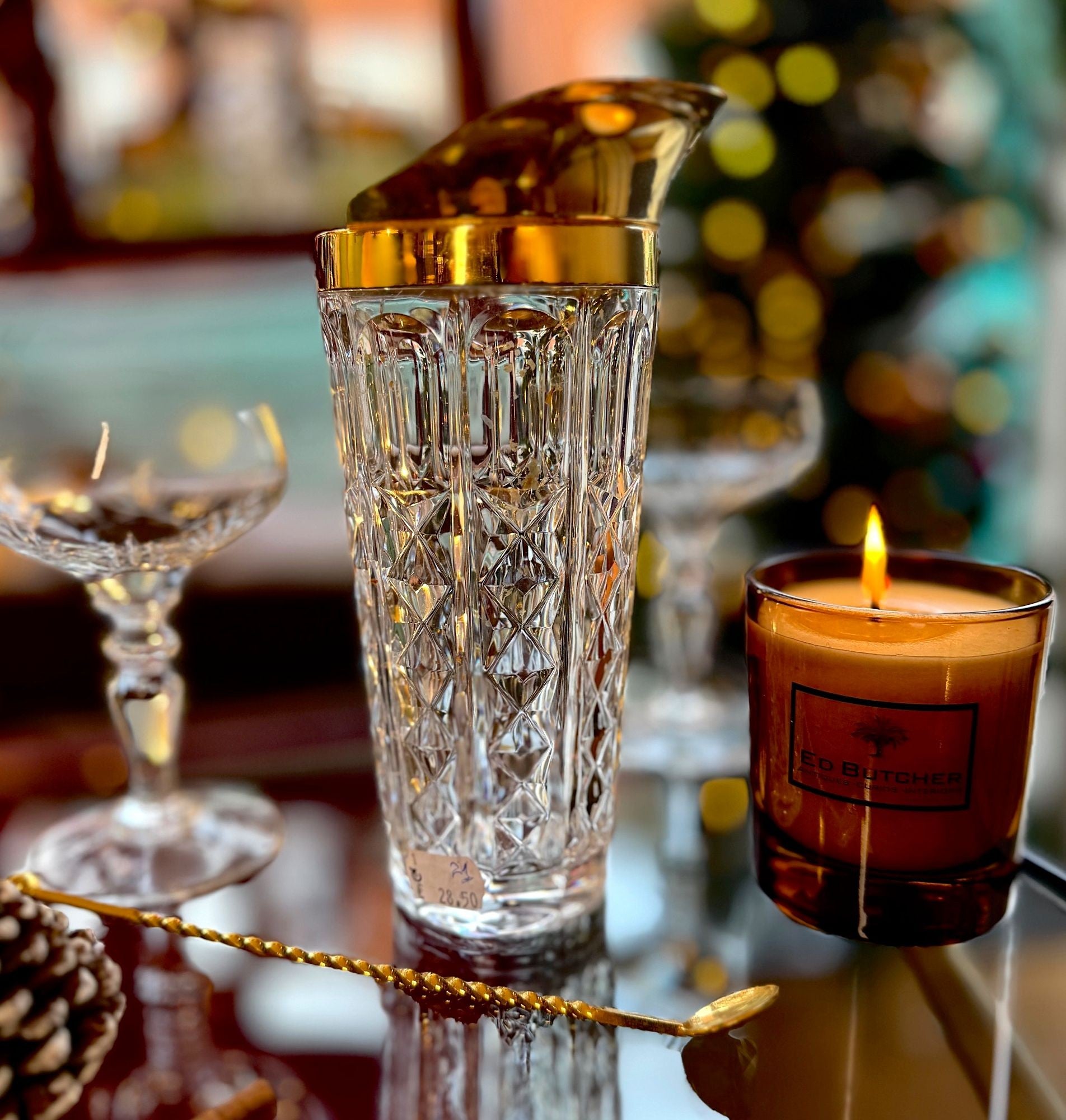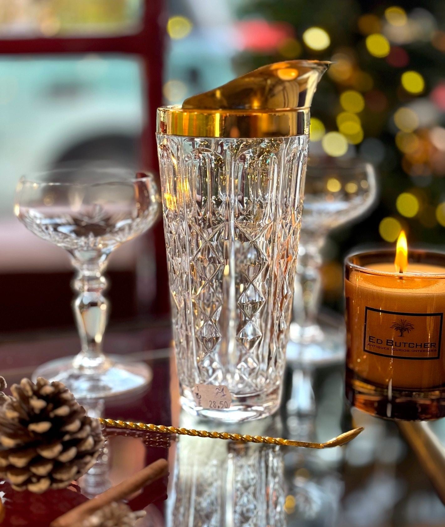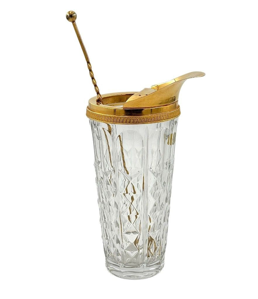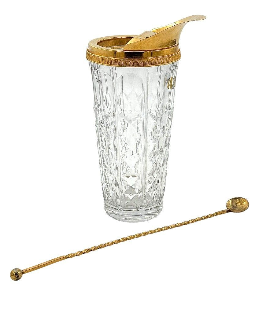 A 1950s Val Saint Lambert crystal and gold plated cocktail jug with gilt metal muddling spoon. Still with original Val St Lambert label on the front