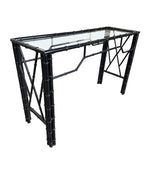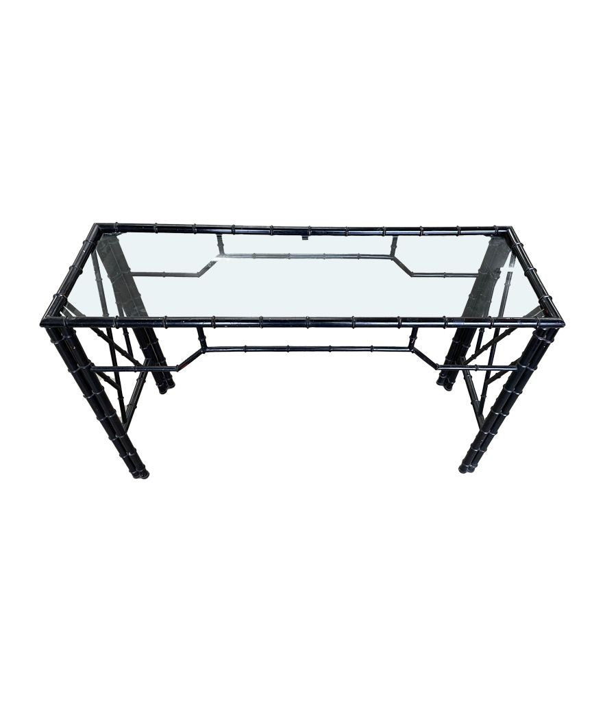 A 1960s faux bamboo black lacquered metal console table with glass shelf
