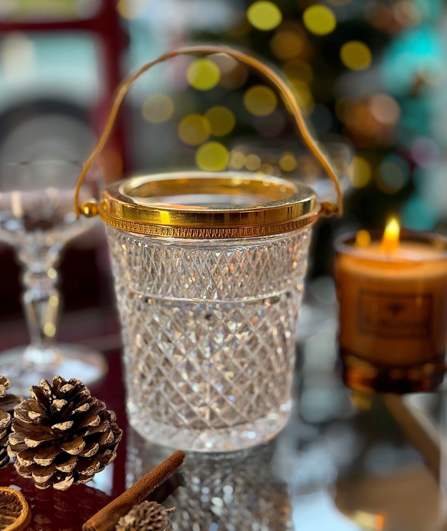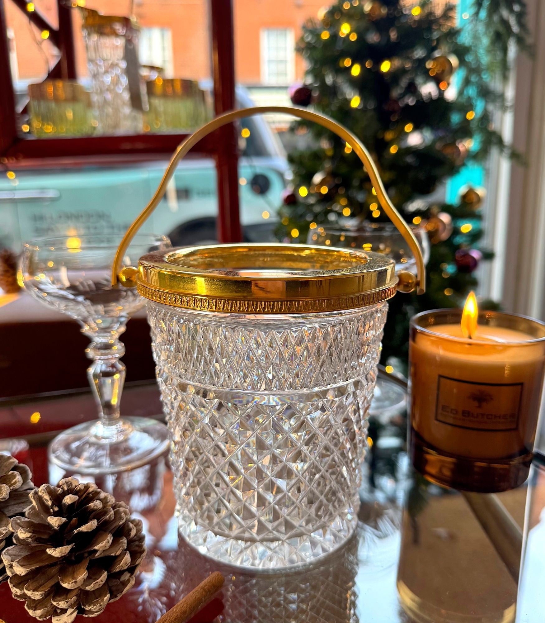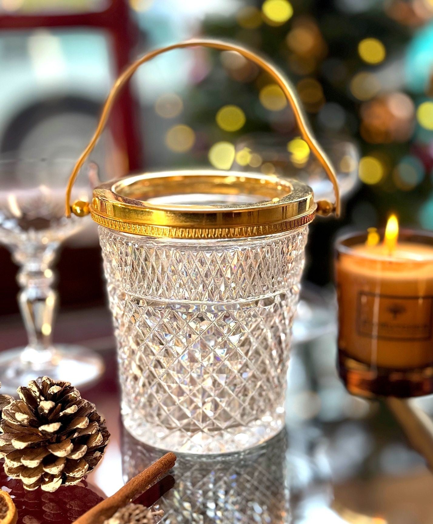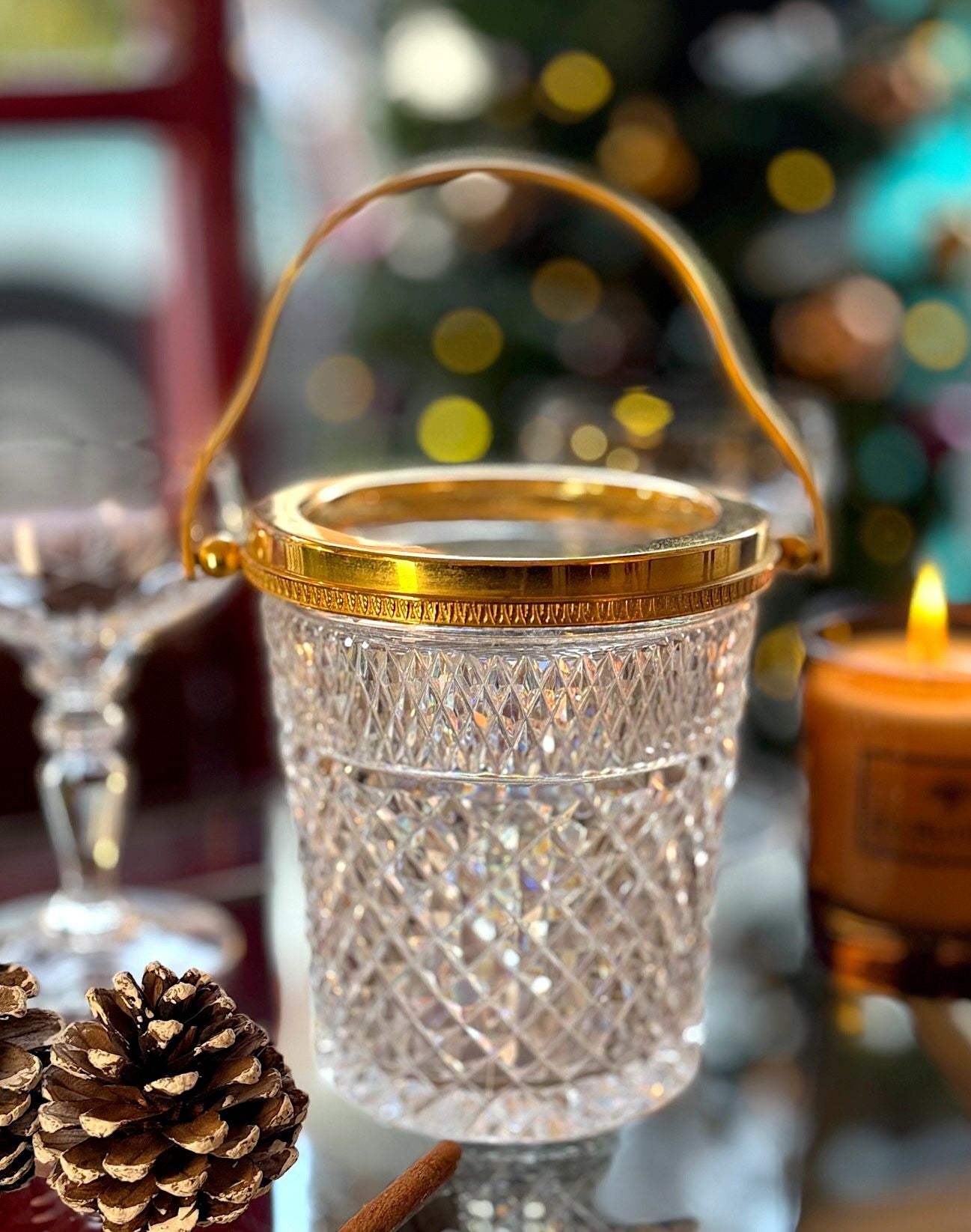 A 1960s Val Saint lambert cut crystal and gilt metal ice bucket with handle