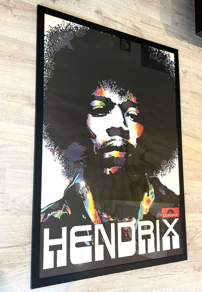 A large orignal psychedelic promotional poster for Jimi Hendrix "All Along The Watchtower" originally released under Polydor 1969. This poster is a slightly later 1970s reprint. Framed and glazed in black wooden frame.