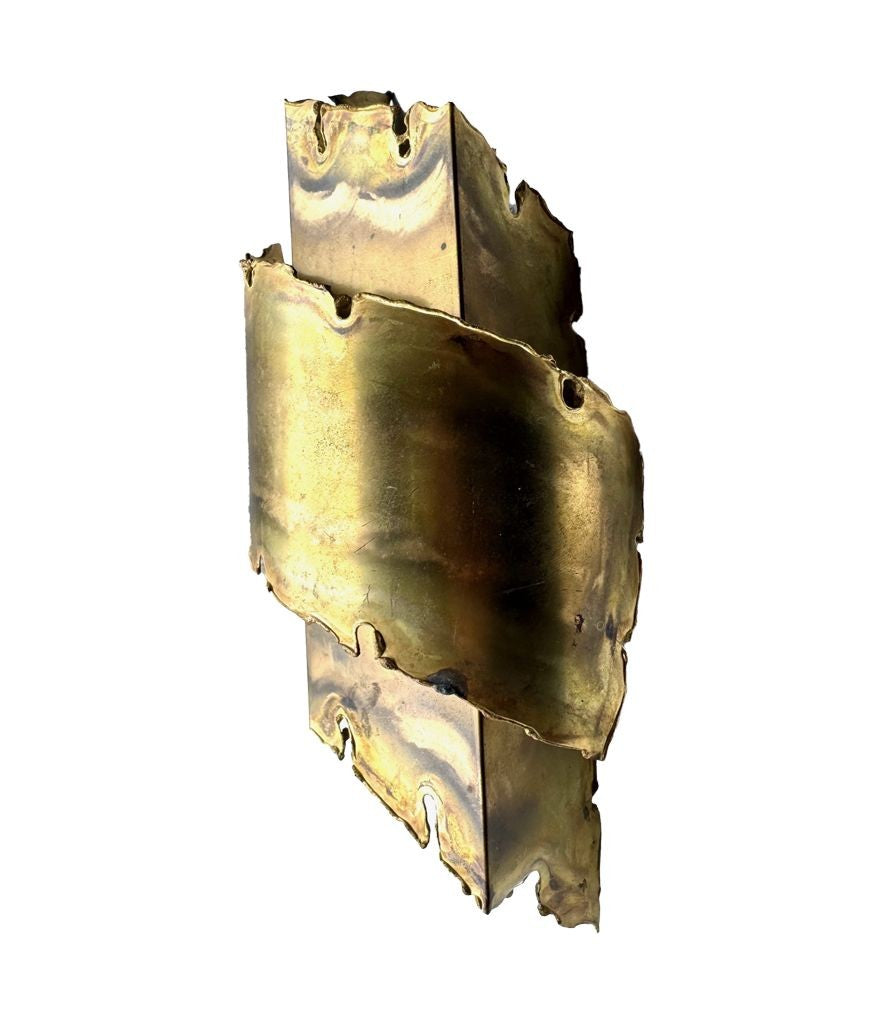 A pair of Danish 1960s torch cut brass wall sconces by Holm Sorensen, in a brutalist style. Each with a single fitting mounted on enamel wall plate, re wired with new brass fittings and PAT tested