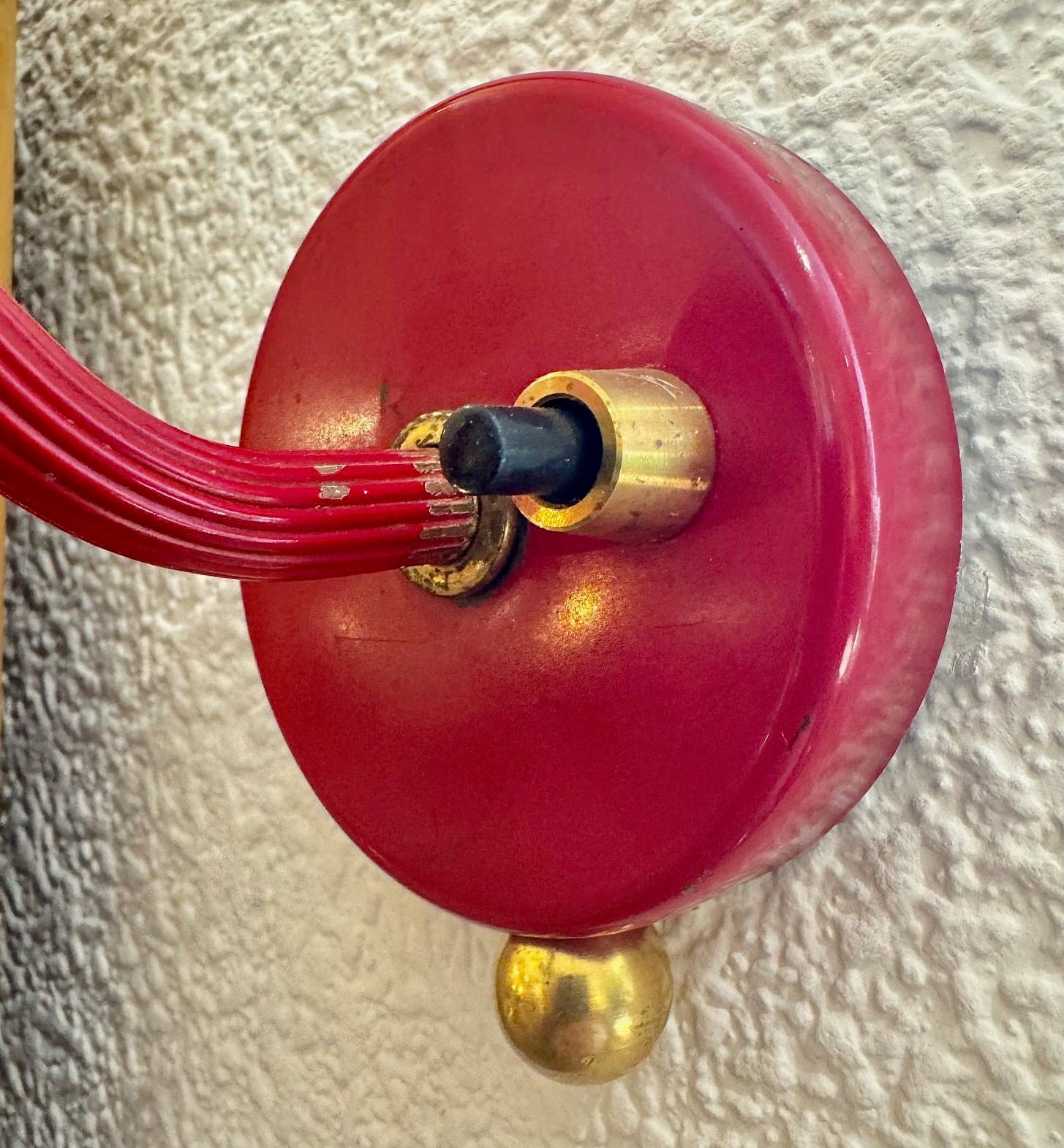A pair of Holm Sorensen 1950s red enamelled metal and brass adjustable wall lights. Each with solid brass adjustable wing screw and switch on the wall plate. Re wired with new brass fittings and PAT tested.