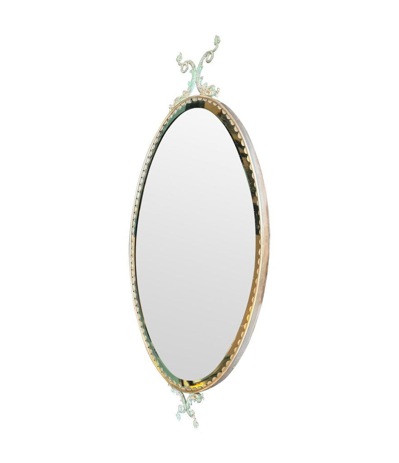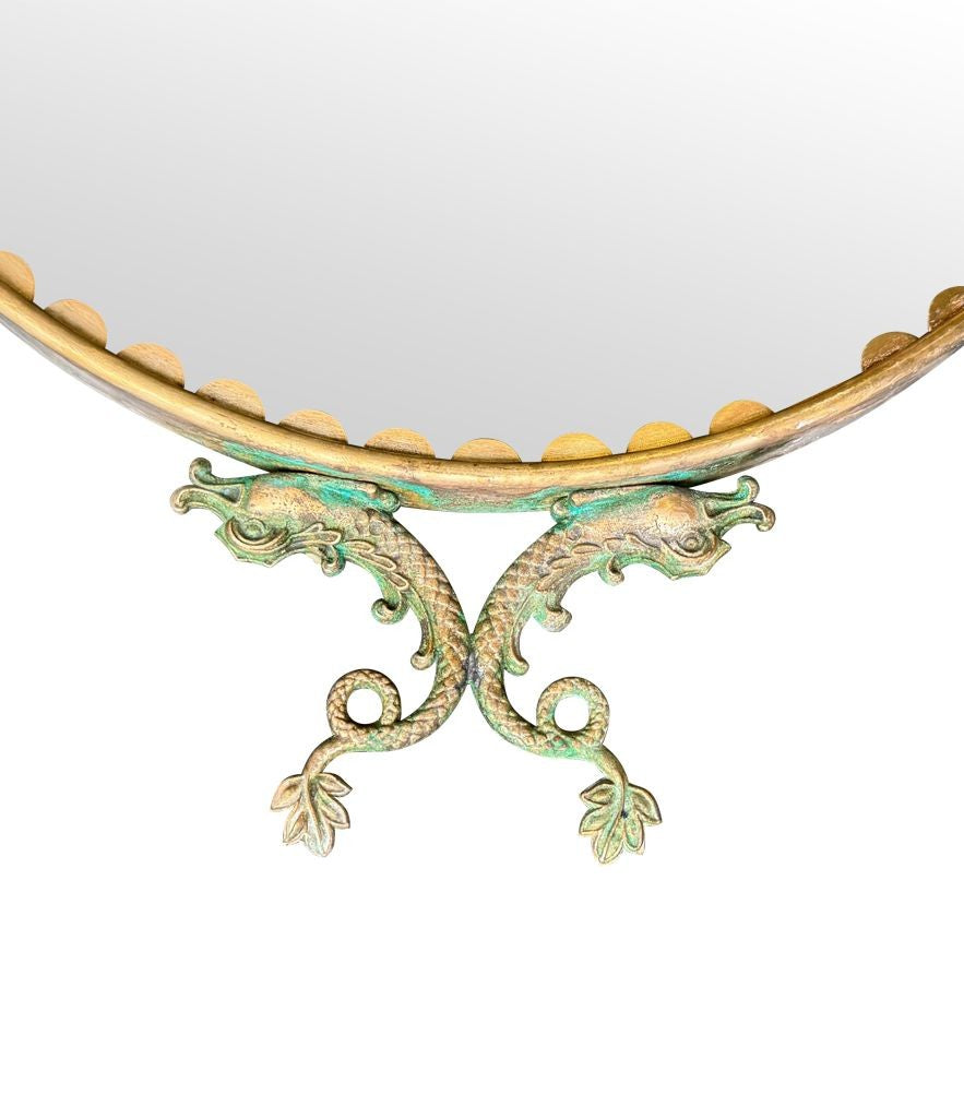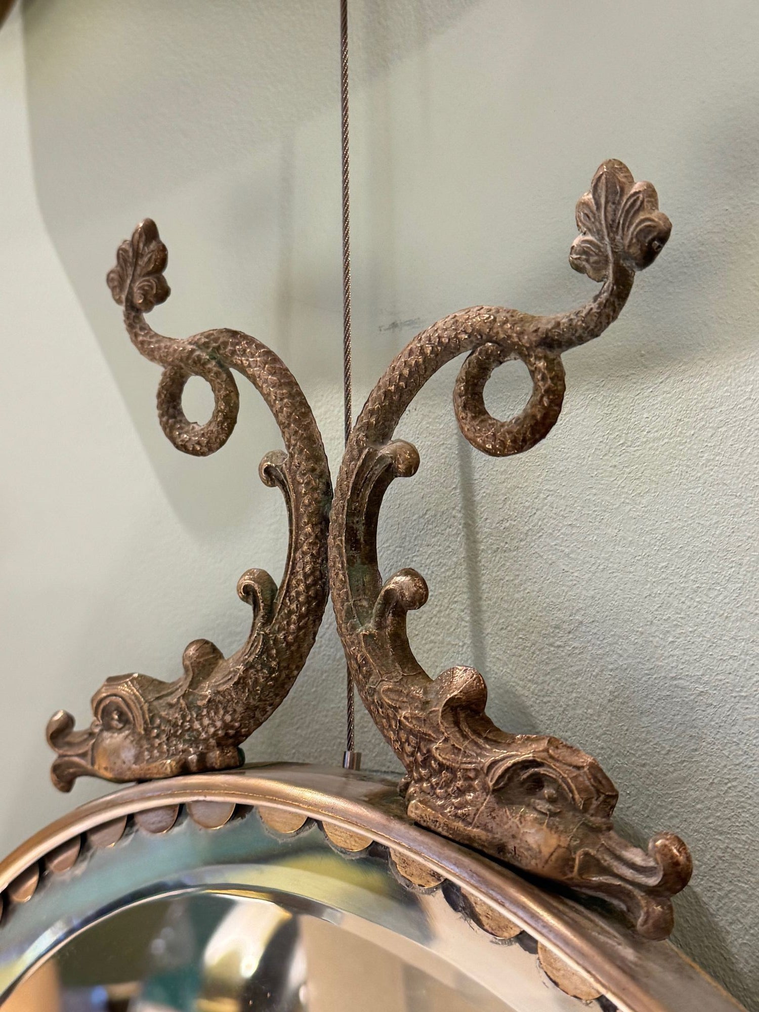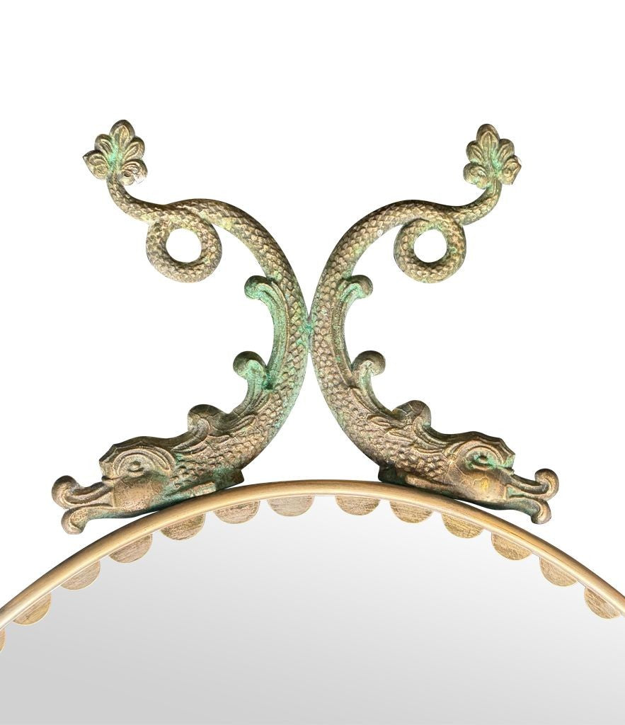 A pair of Italian 1940s oval mirrors with dolphin detailing around the brass frame