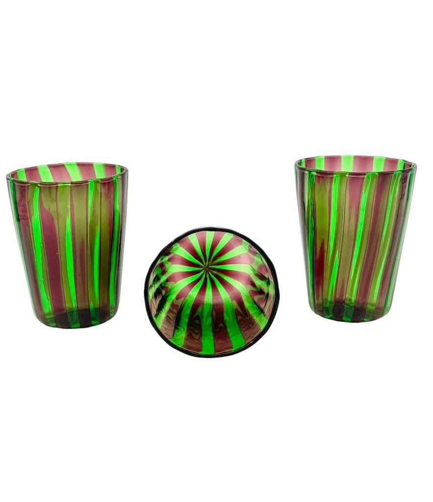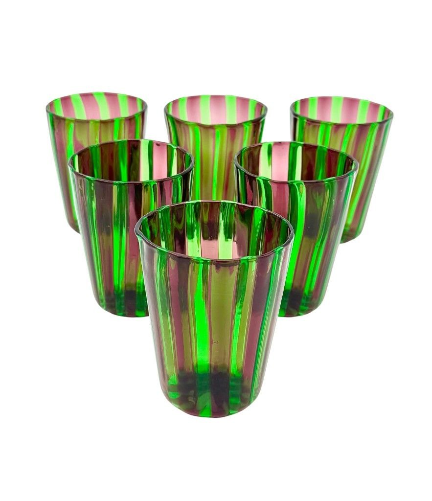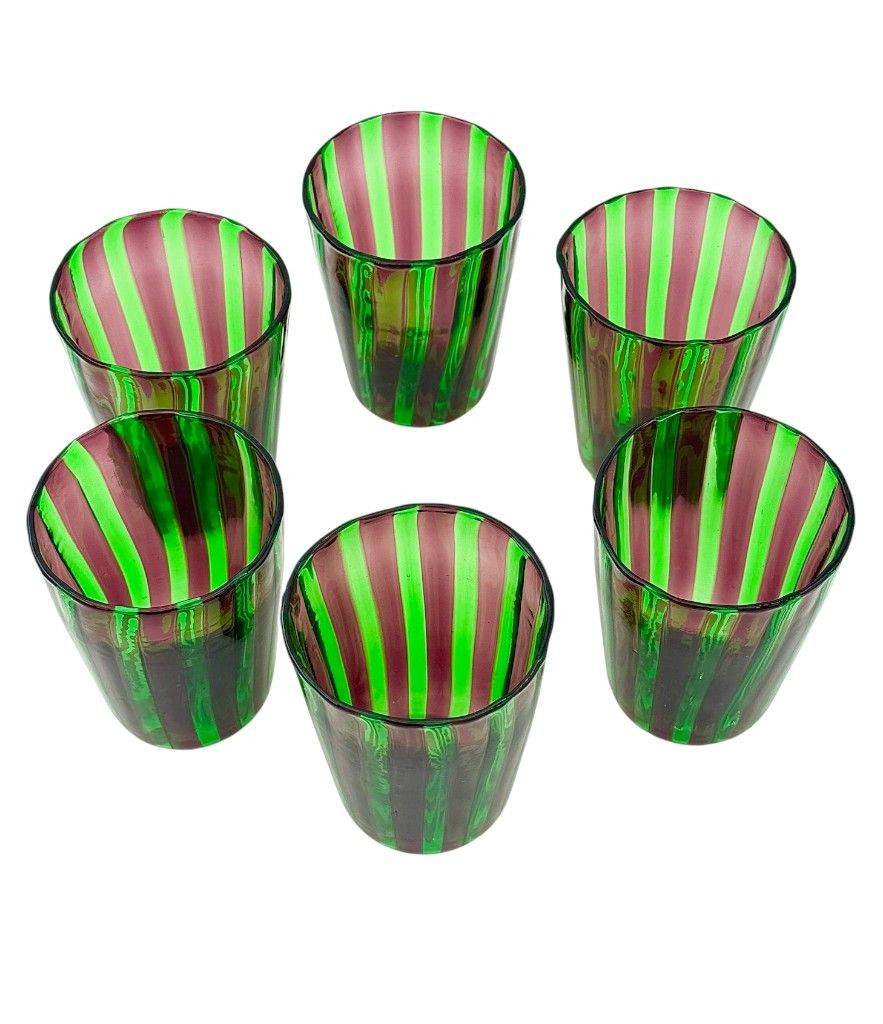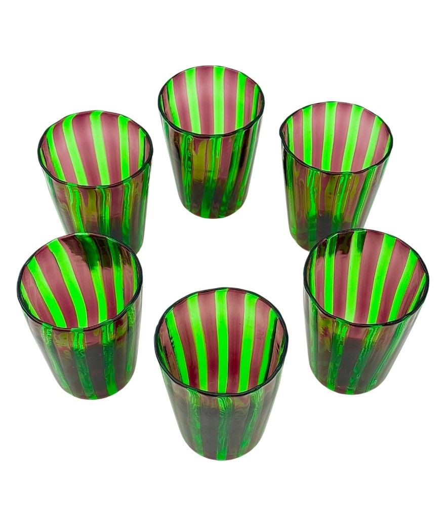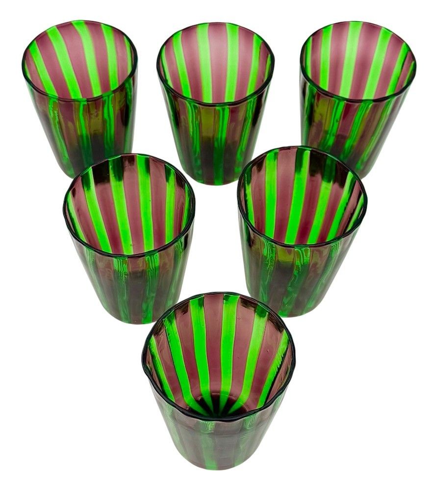 A set of six Italian handblown Murano glass tumblers with vibrant green and aubergine purple stripes