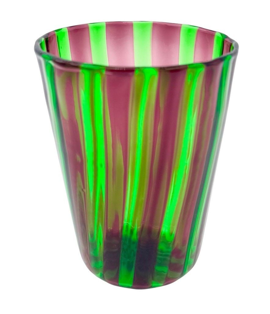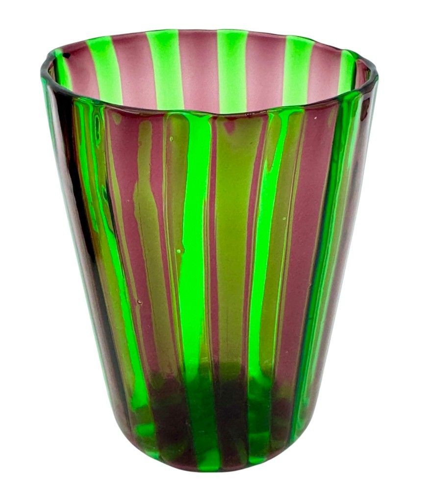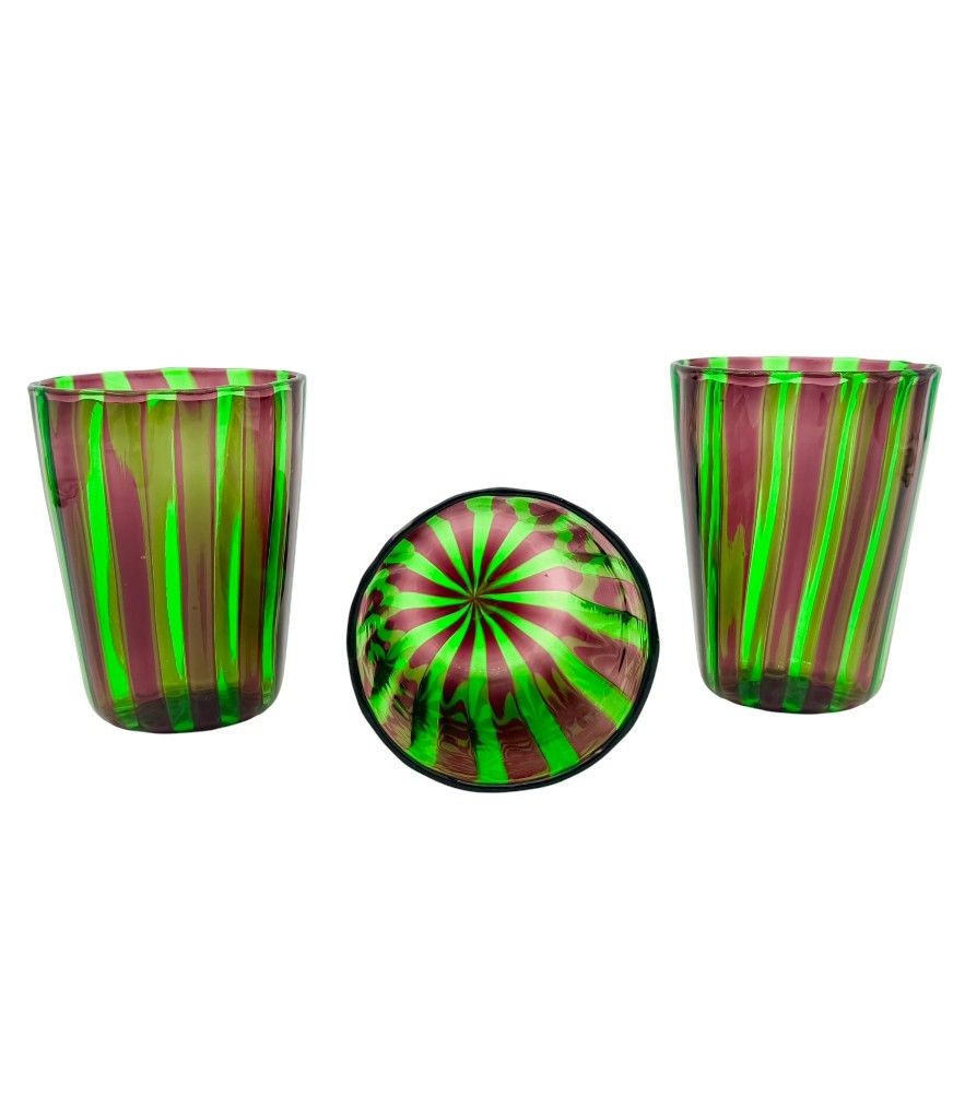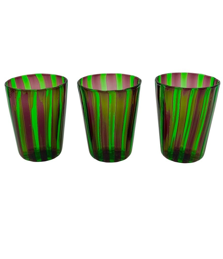 A set of six Italian handblown Murano glass tumblers with vibrant green and aubergine purple stripes