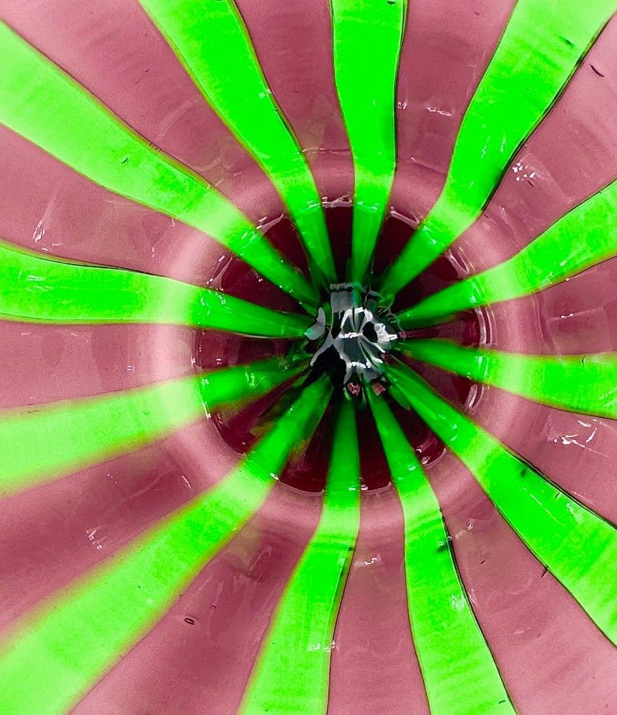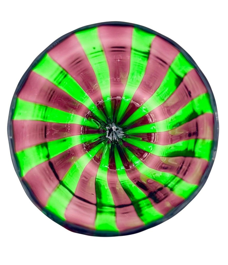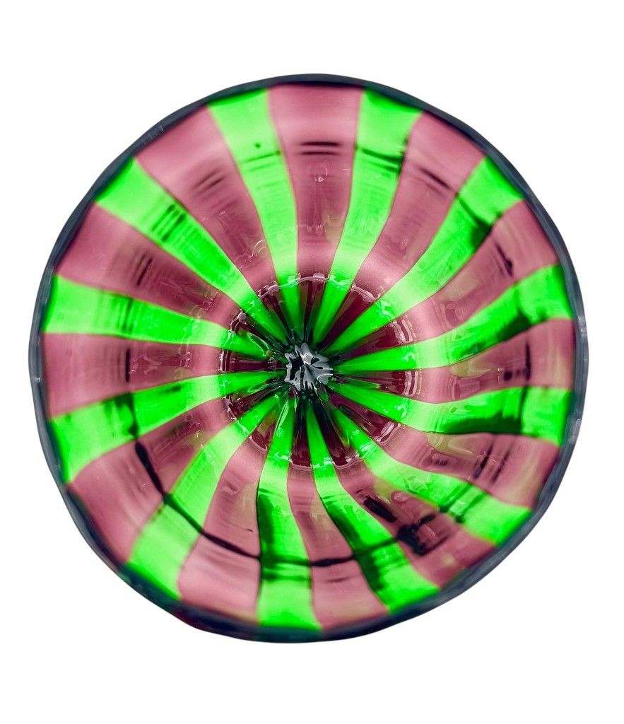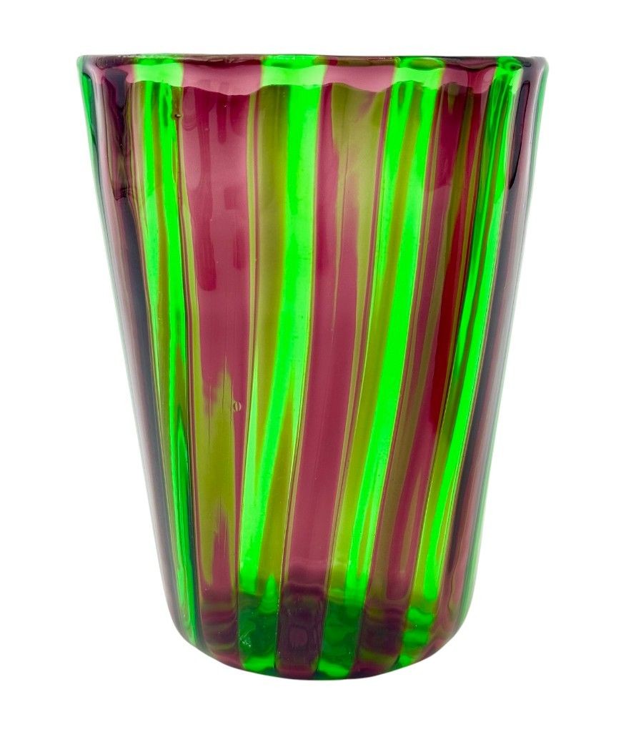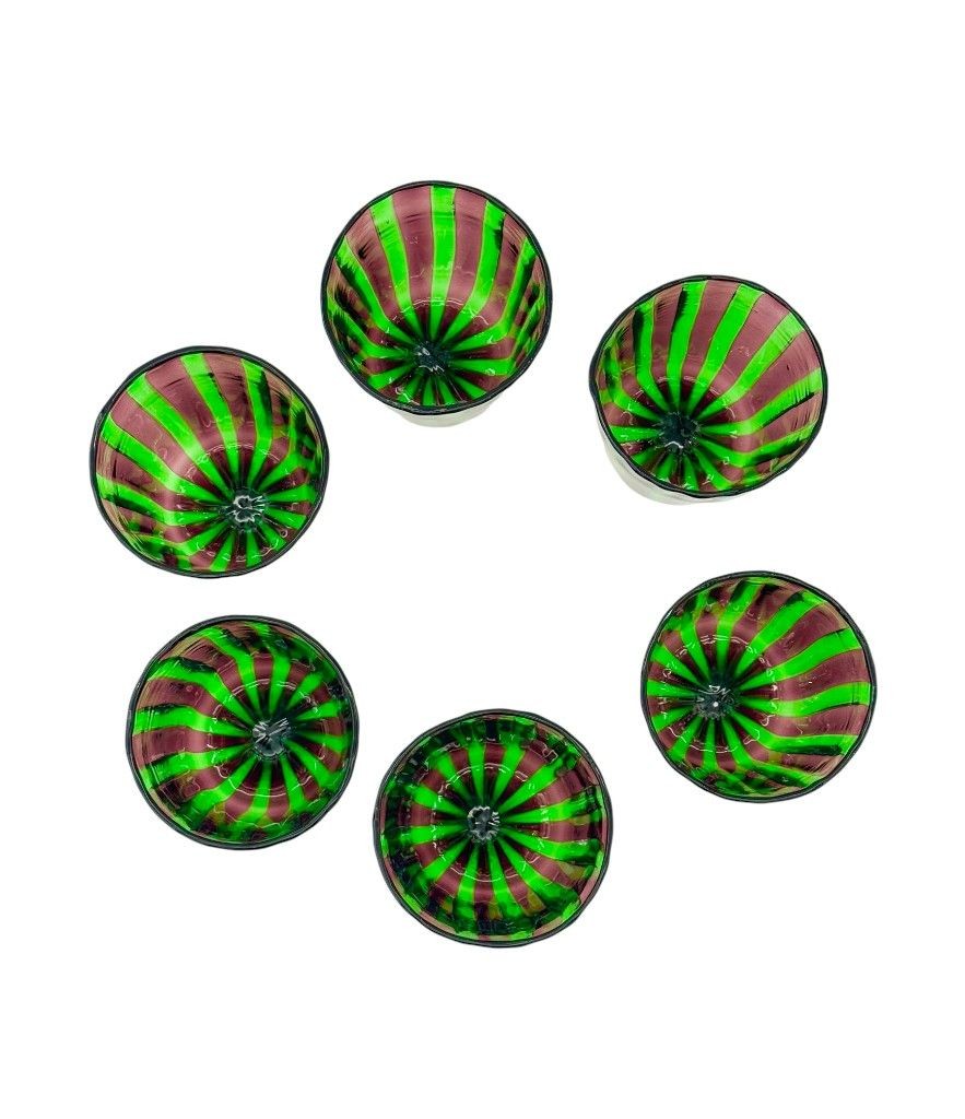 A set of six Italian handblown Murano glass tumblers with vibrant green and aubergine purple stripes