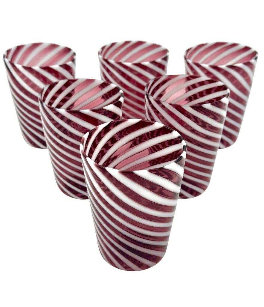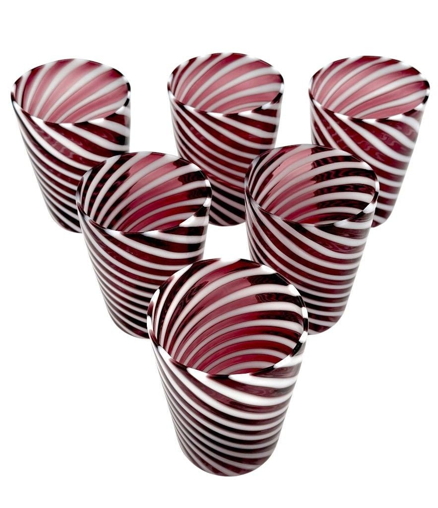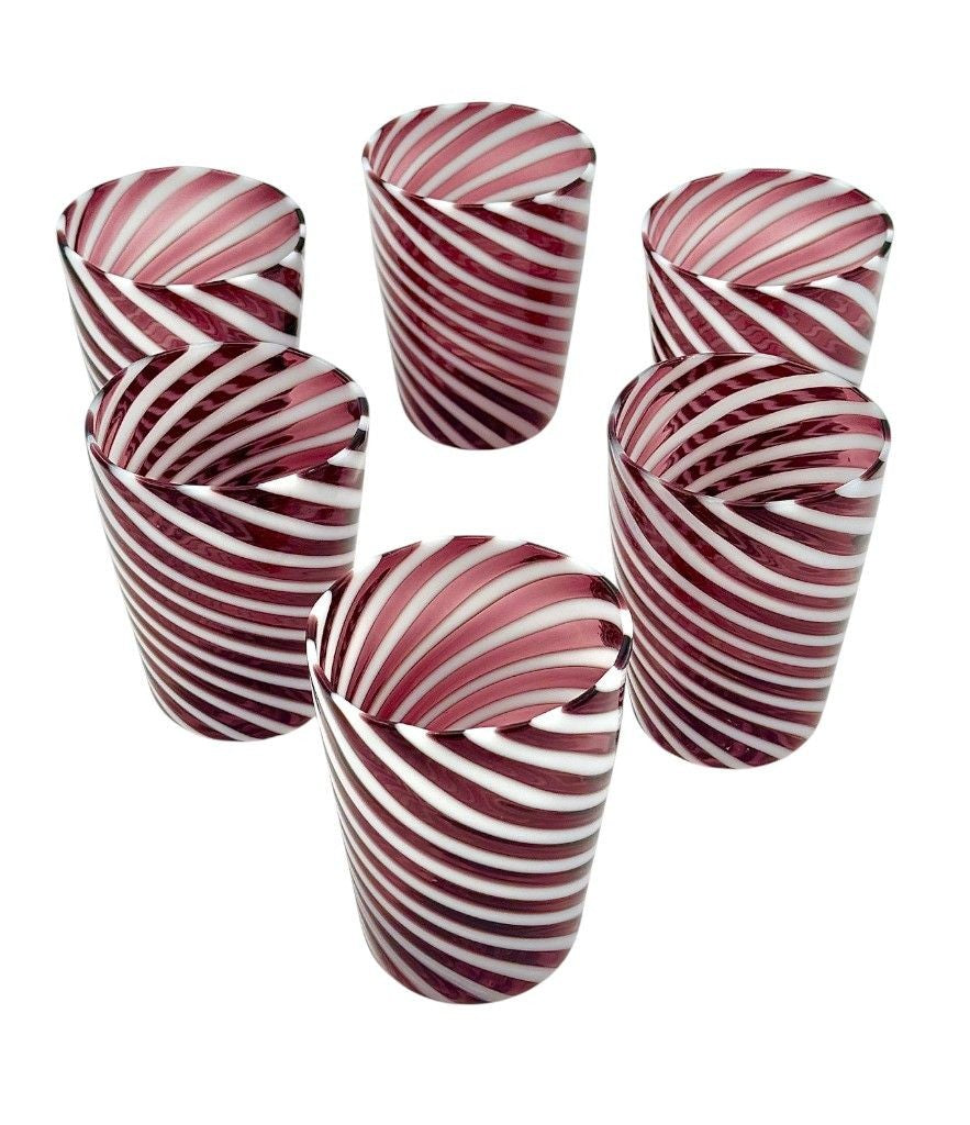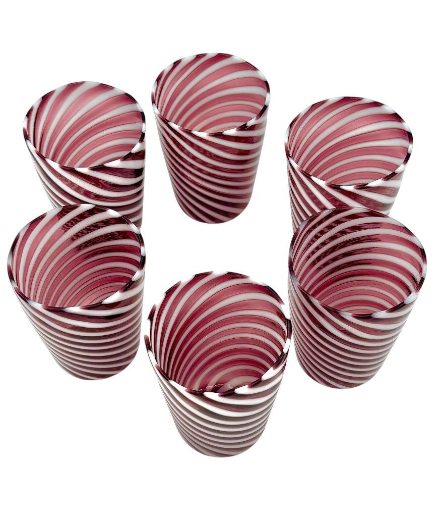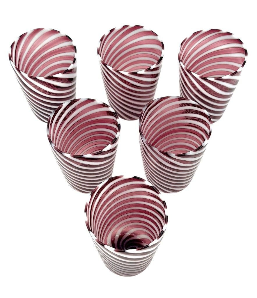A set of six wonderful Italian handblown Murano glass tumblers with purple and white swirling stripes