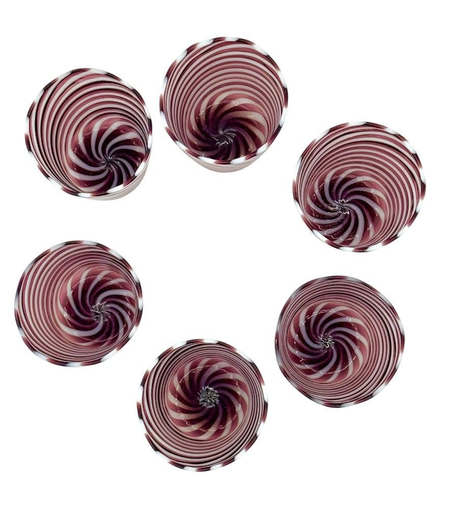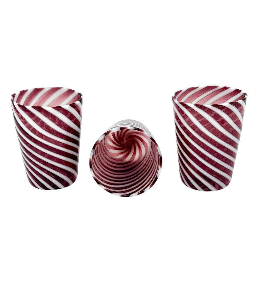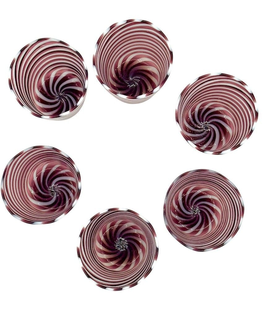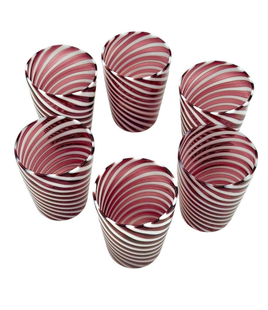 A set of six wonderful Italian handblown Murano glass tumblers with purple and white swirling stripes