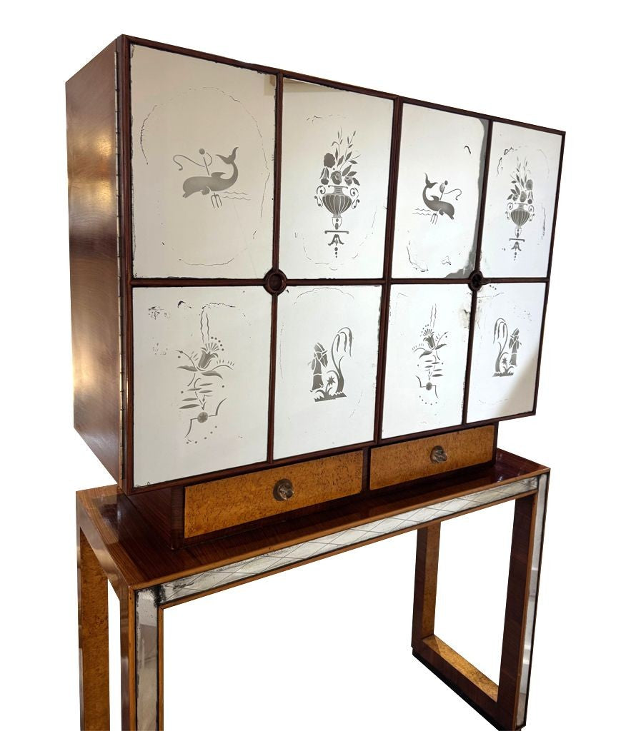Mounted on etched mirrored birds eye maple wood and mahogany frame base, with birds eye maple wood drawers with circular glass handles.