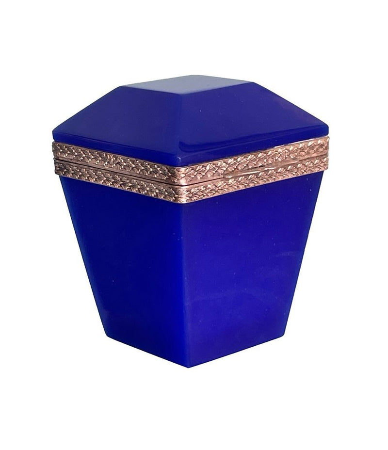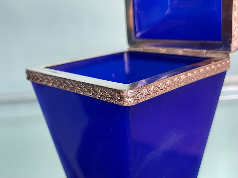 An Italian 1950s cobalt blue Murano glass hinged box with faceted lid and metal decorated edge detail by Giovanni Cenedese, Murano Italy