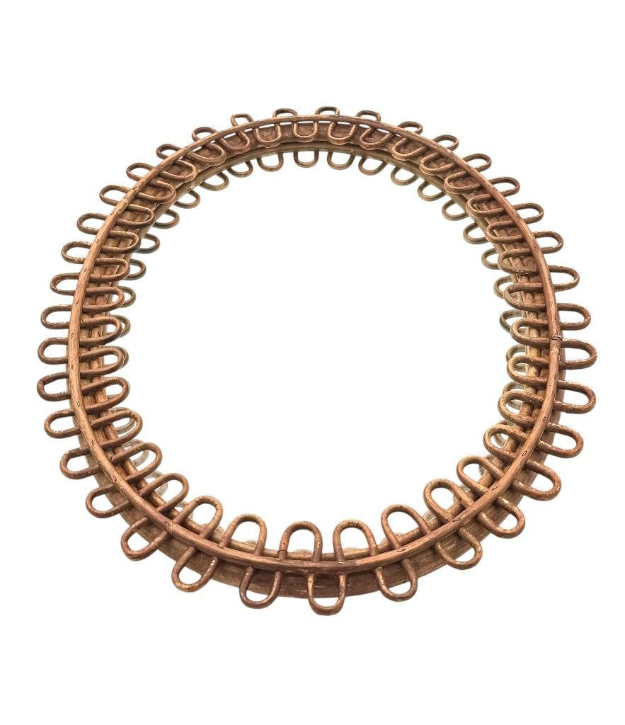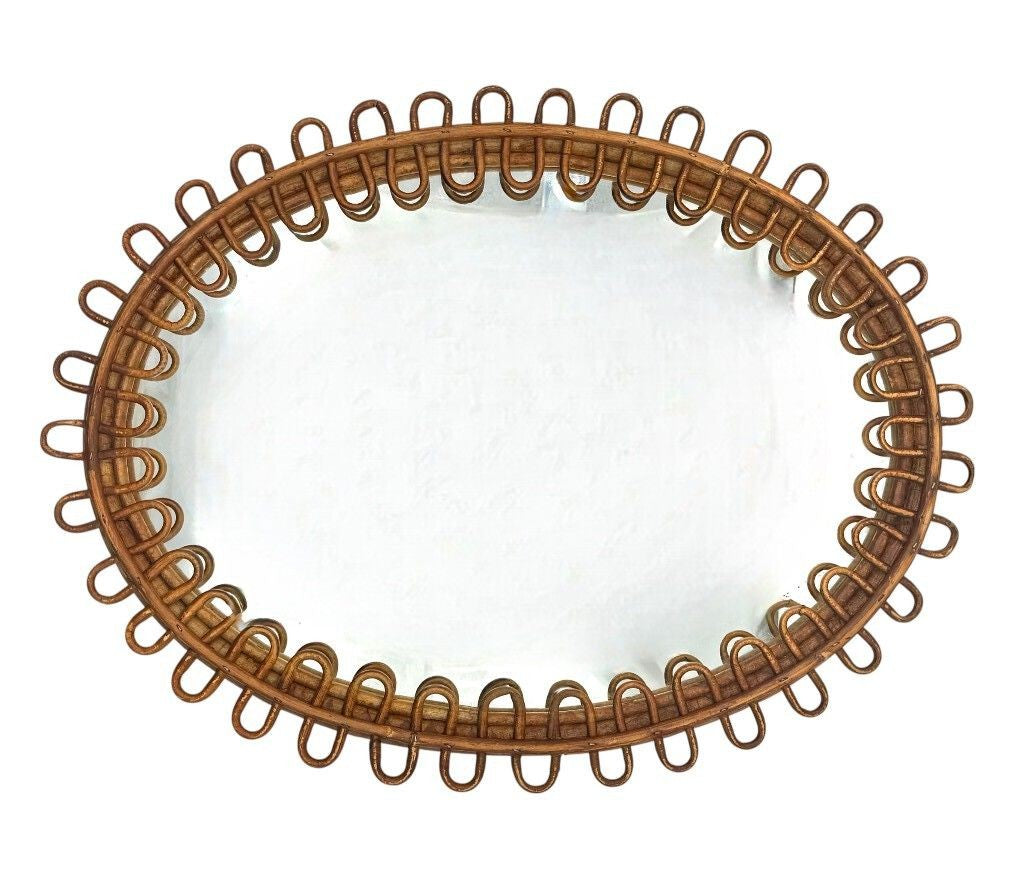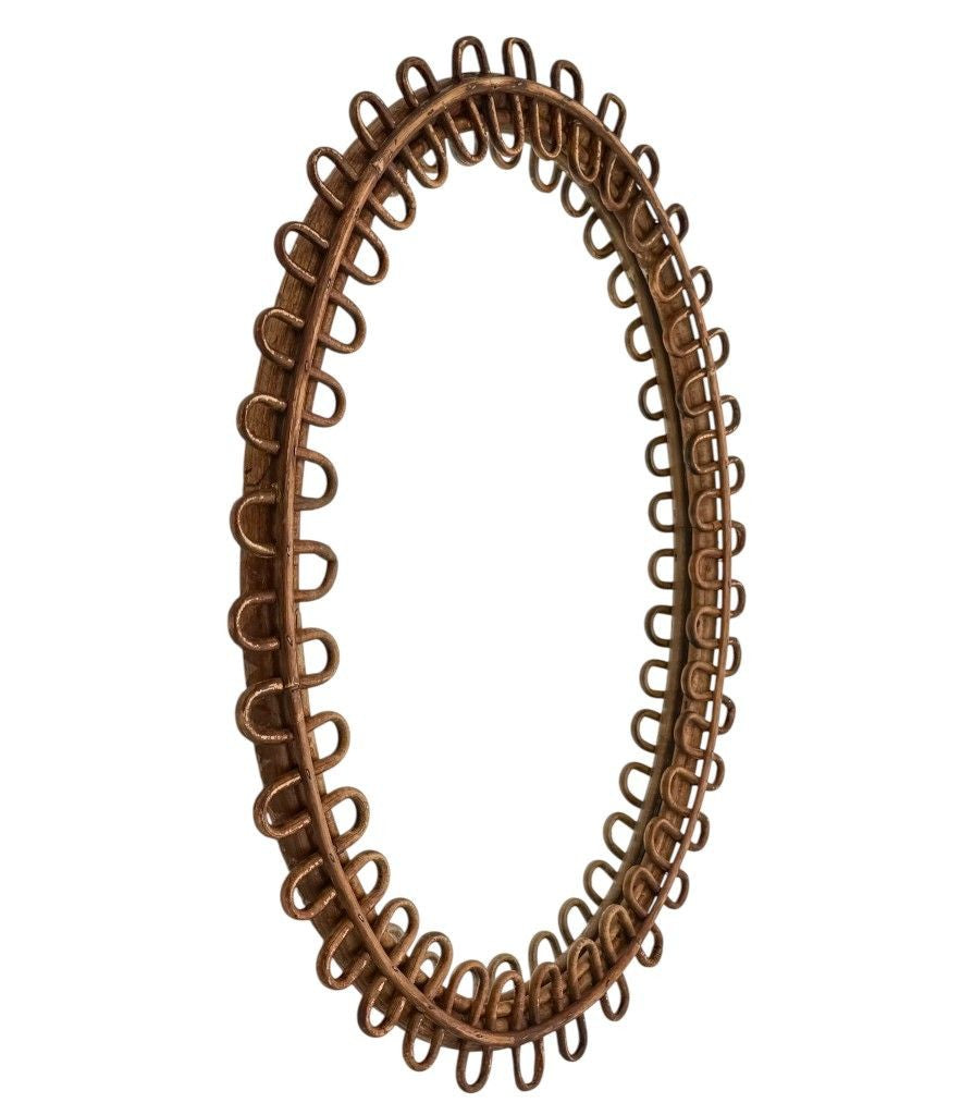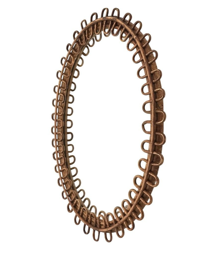 An Italian 1960s squiggle framed oval bamboo mirror by Franco Albini for Bonacina. With original mirror plate and red felt back.  It could be hung either landscape or portrait.